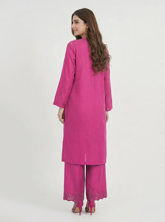 2 Piece Cambric Slub Suit- Embroidered (Pret)