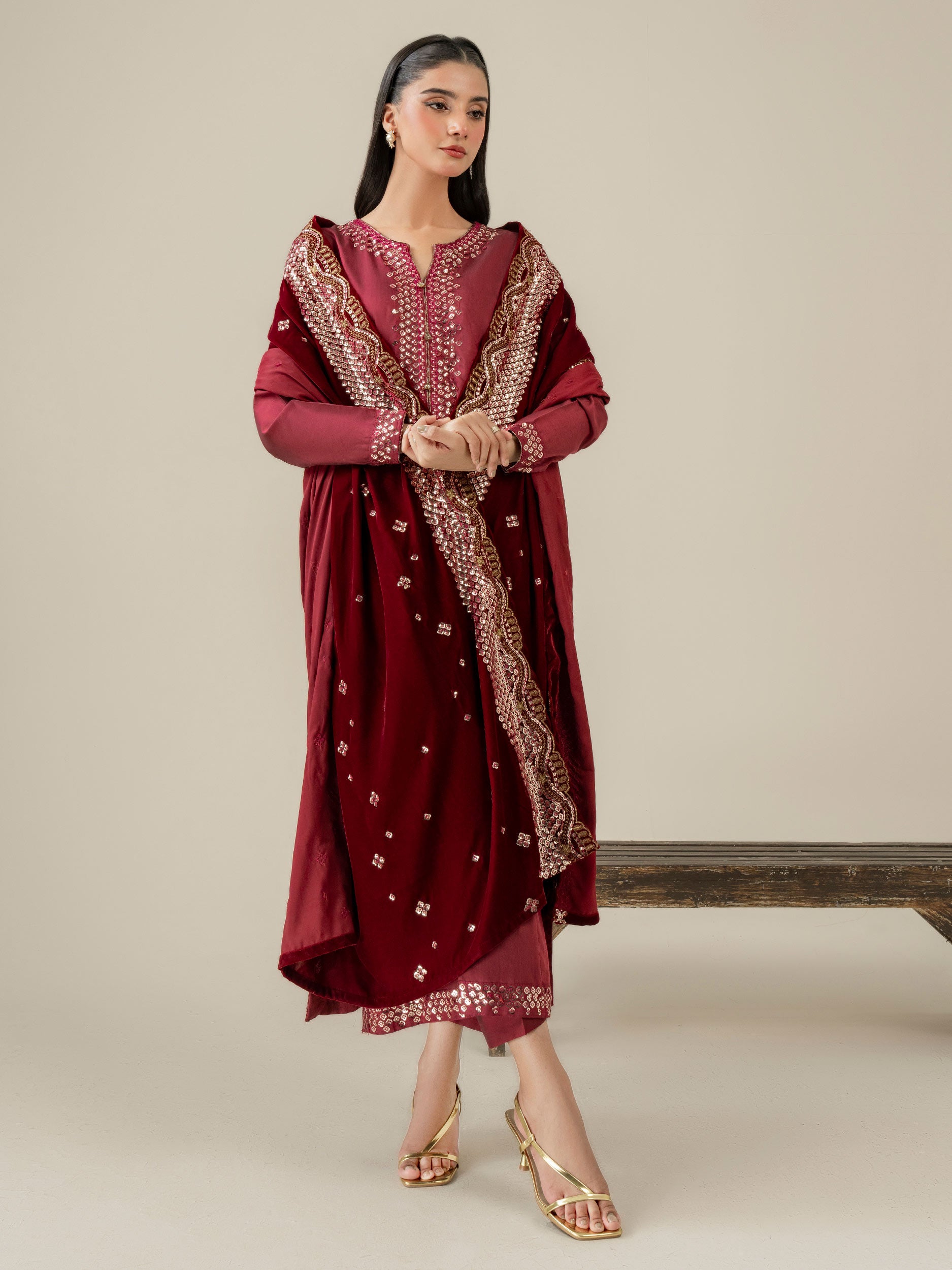 3 Piece Raw Silk Suit-Embroidered (Pret)