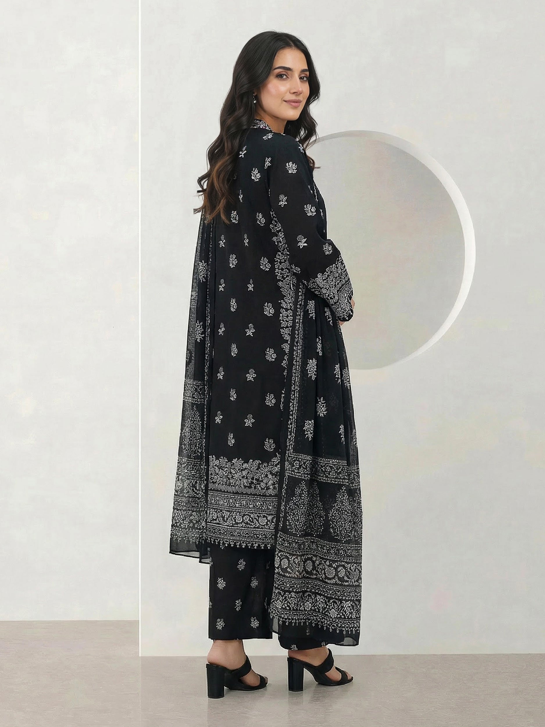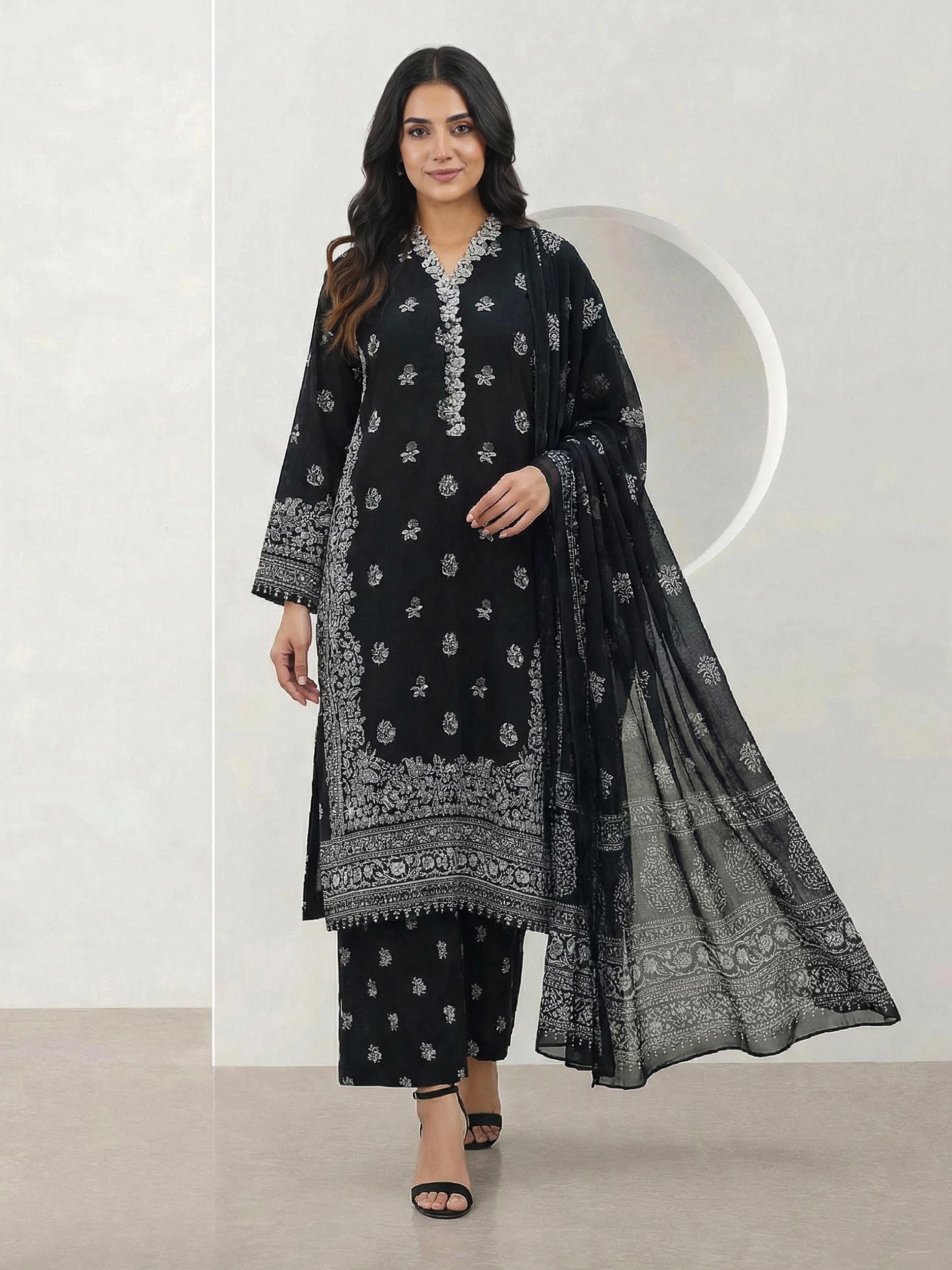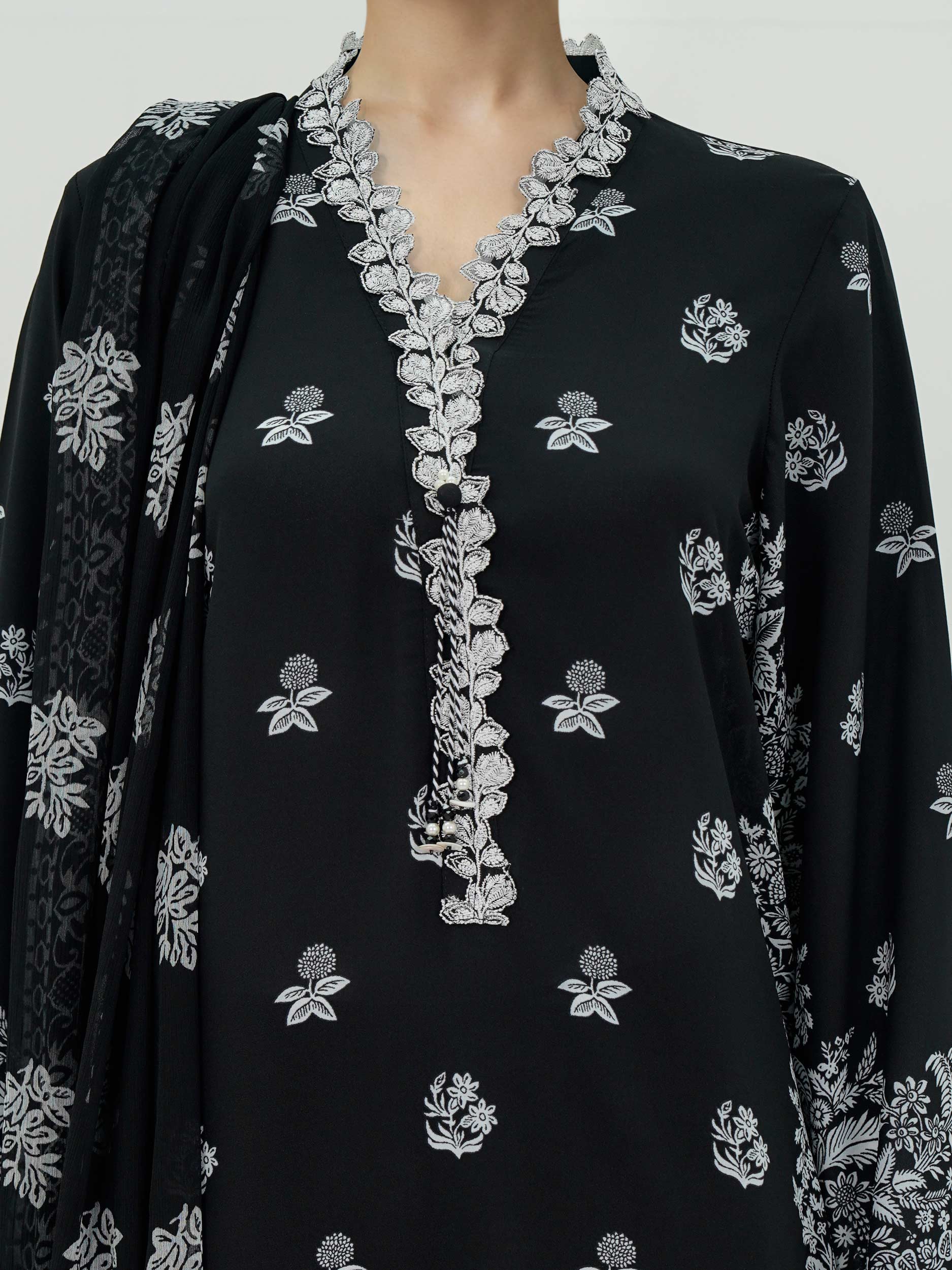 - Printed staright-cut shirt with a cutwork-style appliqué embroidered neckline