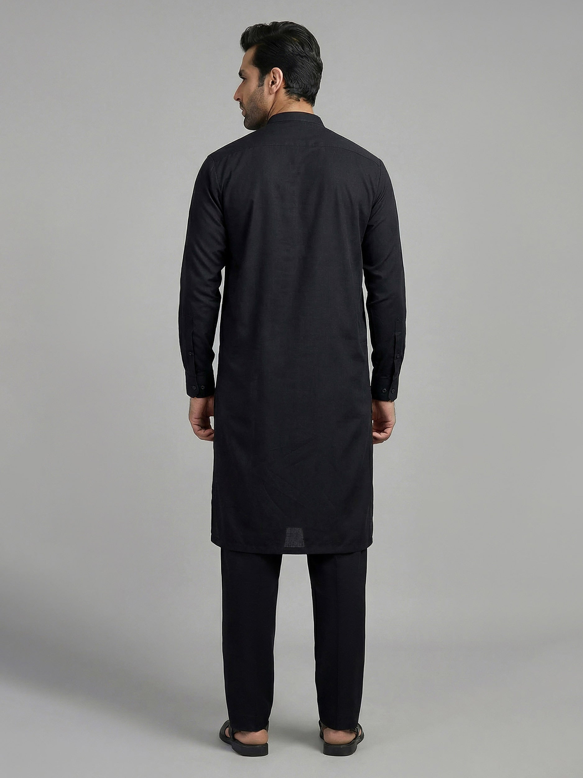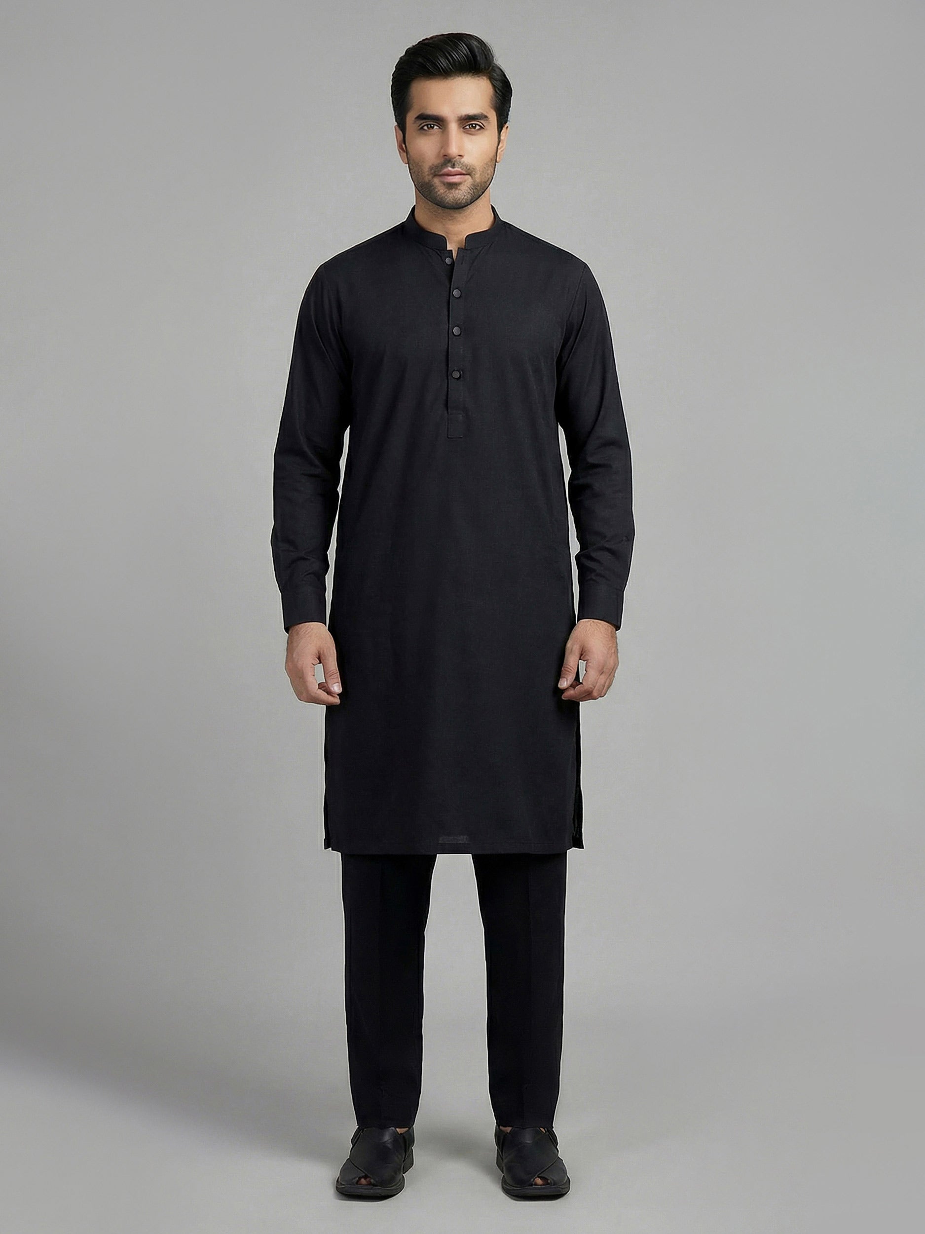 Straight-cut kurta with a button detailed placket, full cuffed sleeves, and two side pockets.