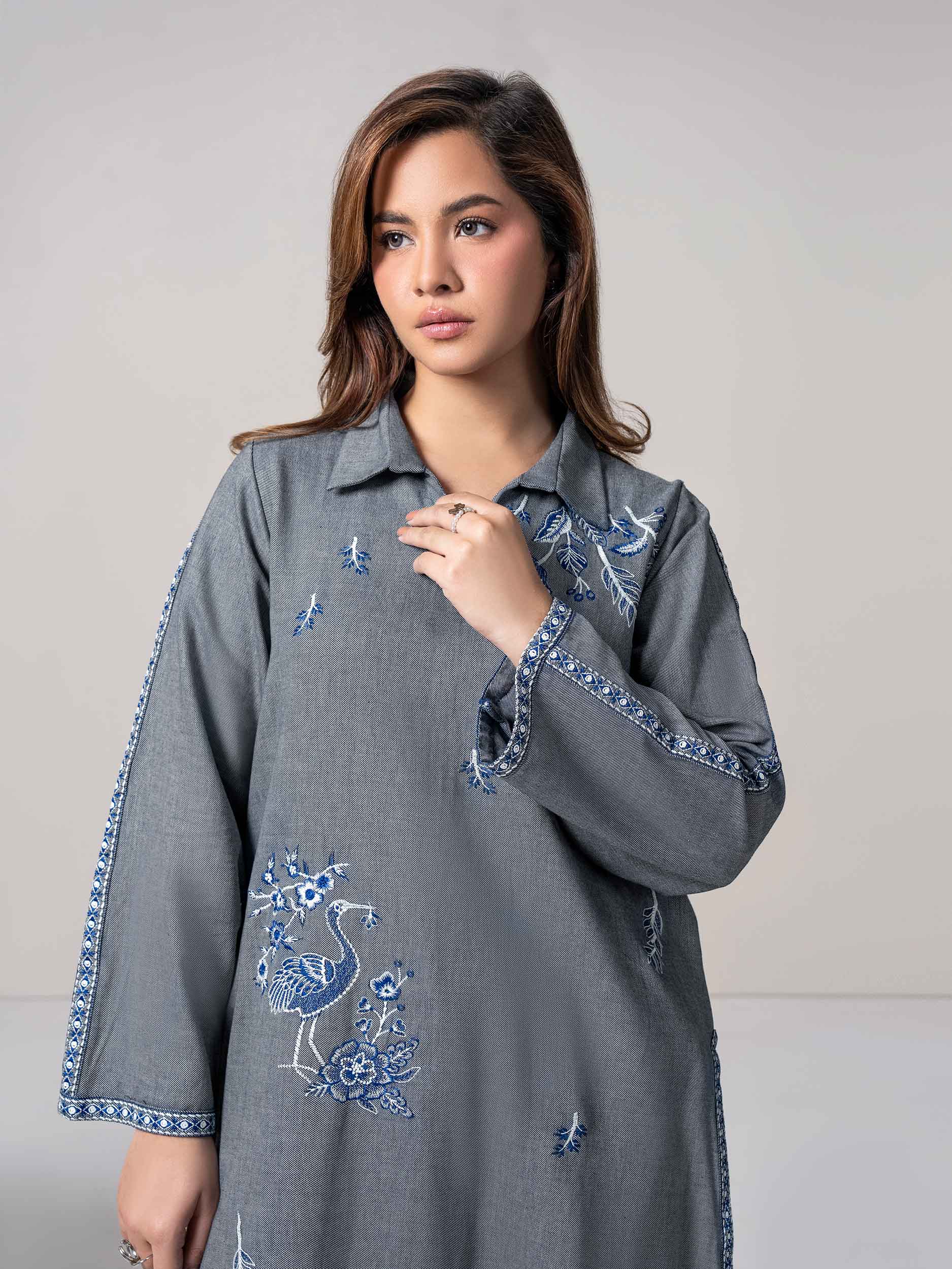 - Embroidered long shirt with collar V-neckline