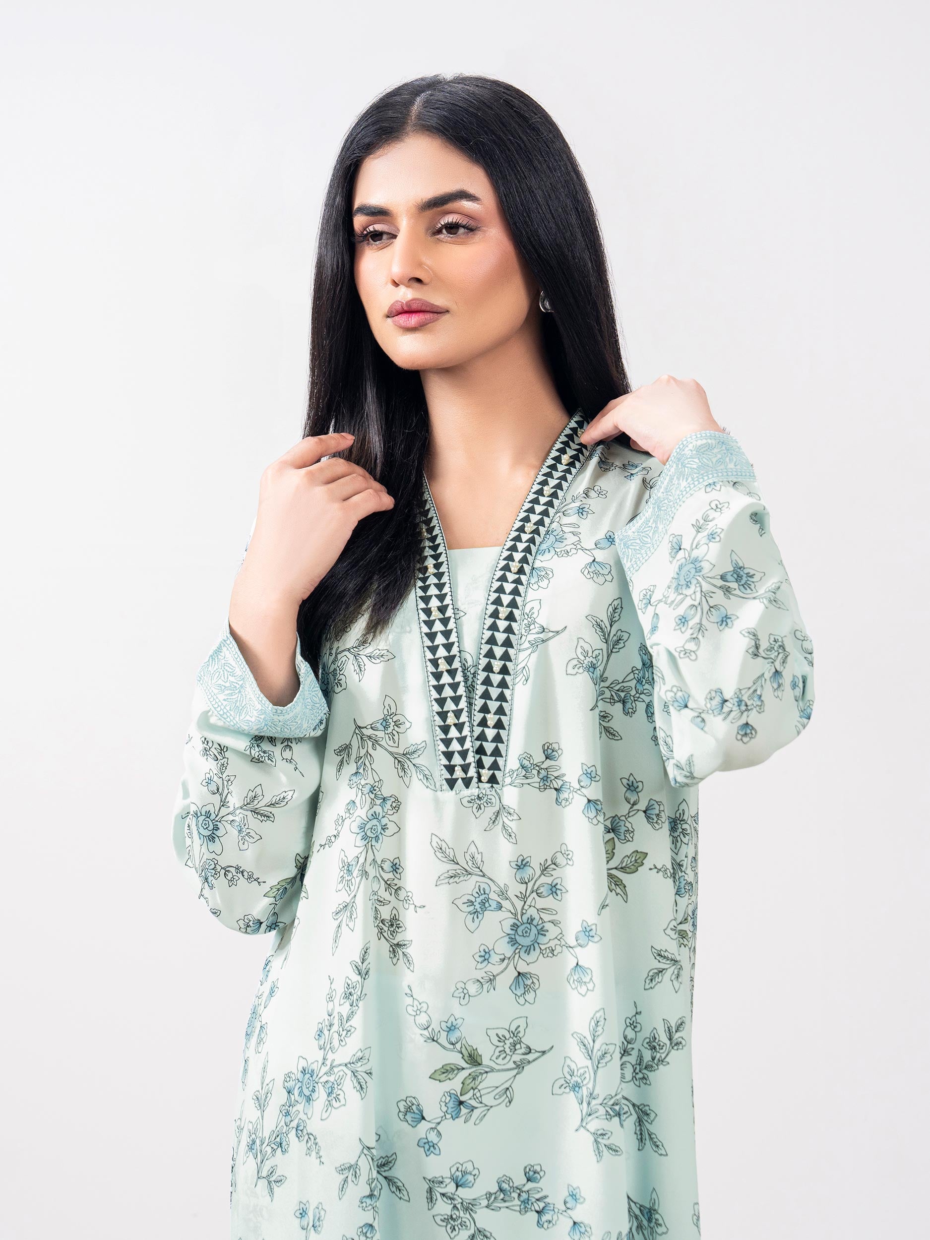 - Printed relaxed-fit long shirt with a V-neckline and low side slits