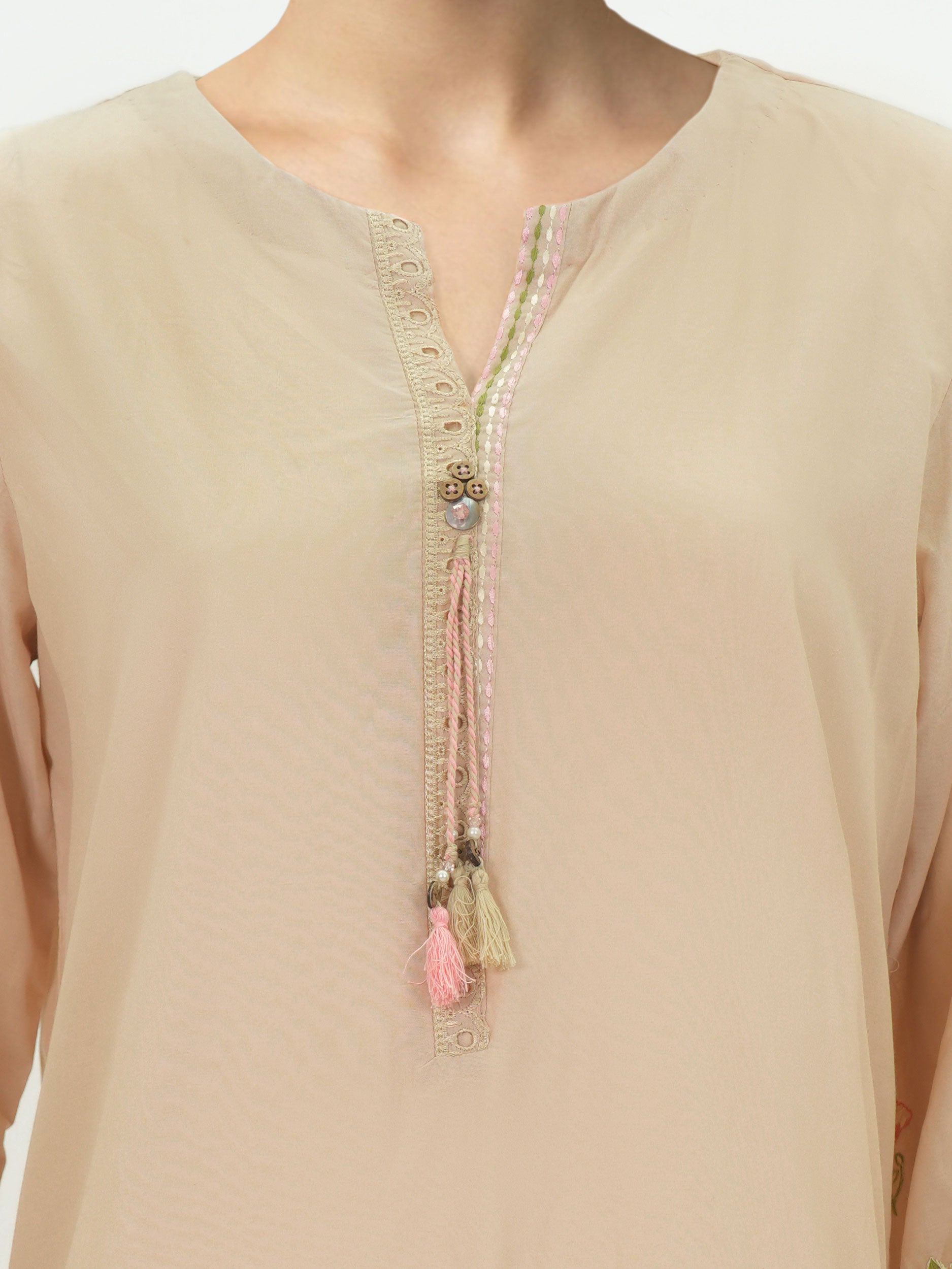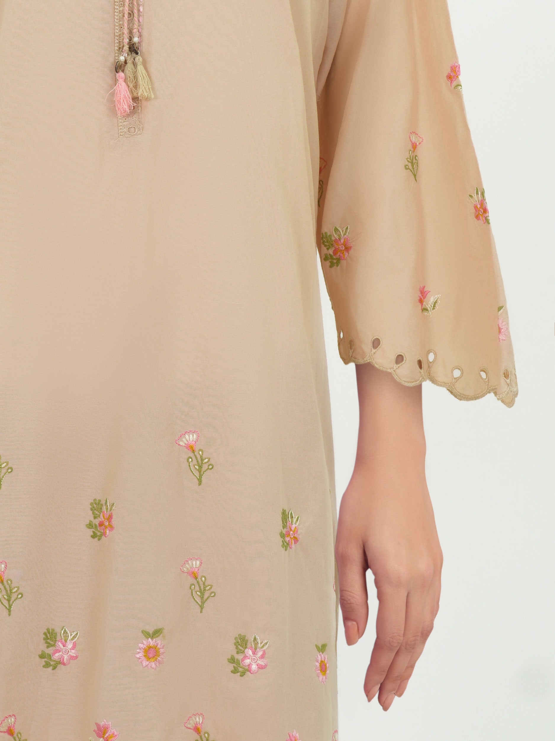 Embroidered shirt with Schiffli scalloped hem and sleeve detailing, finished with a tassel neckline