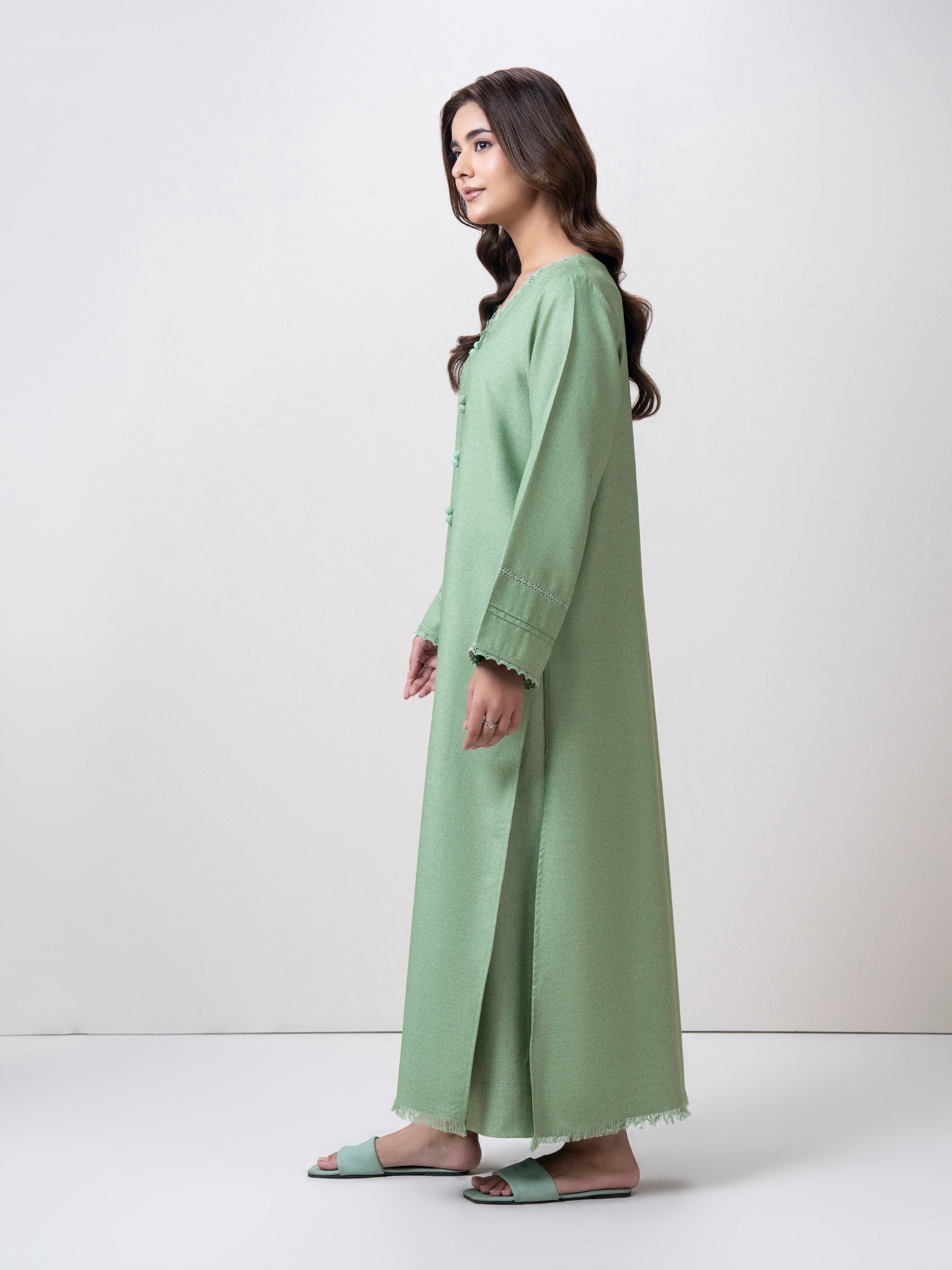- Solid long shirt with a V-neckline, buttoned placket, and fringe hem
