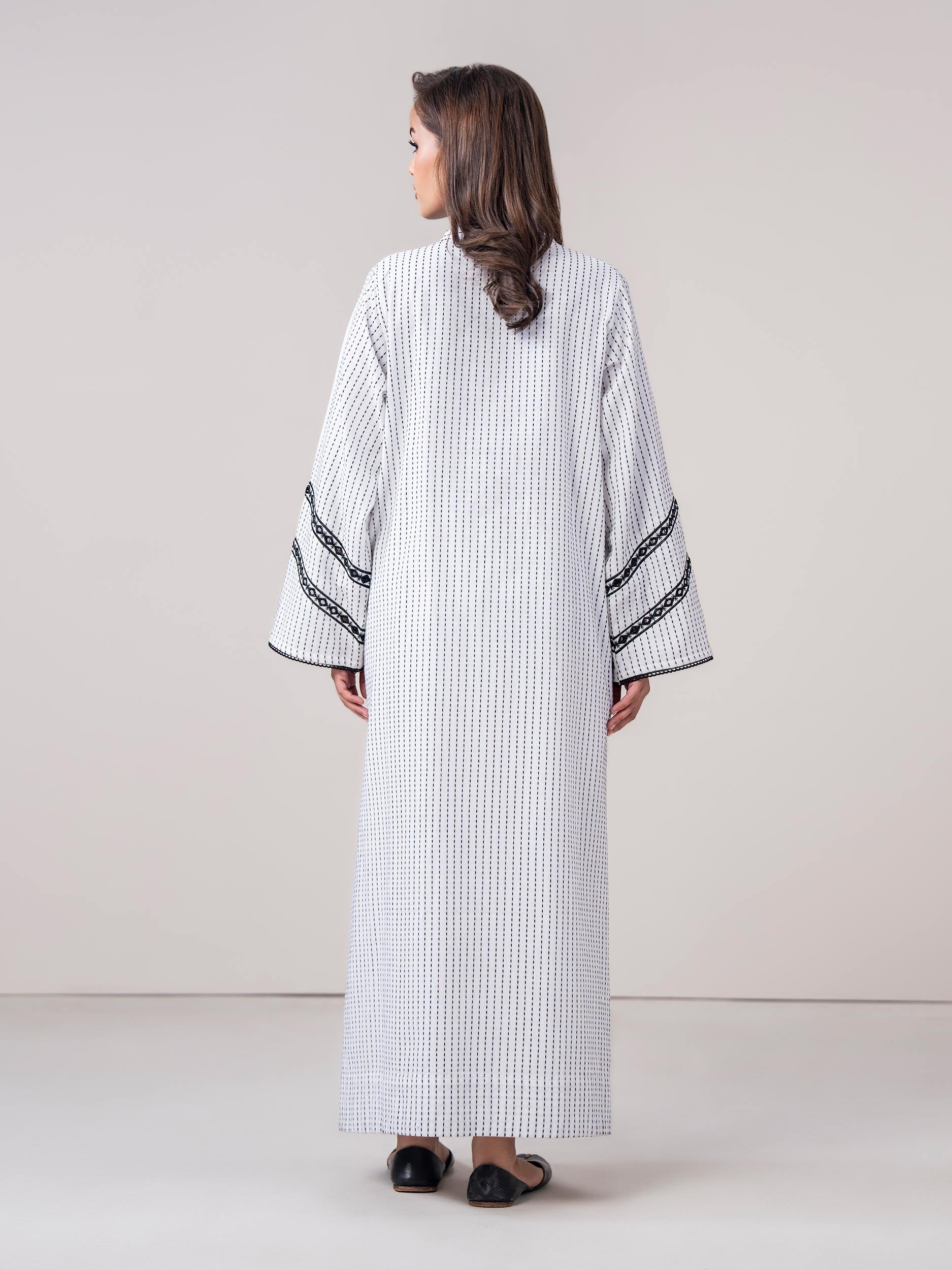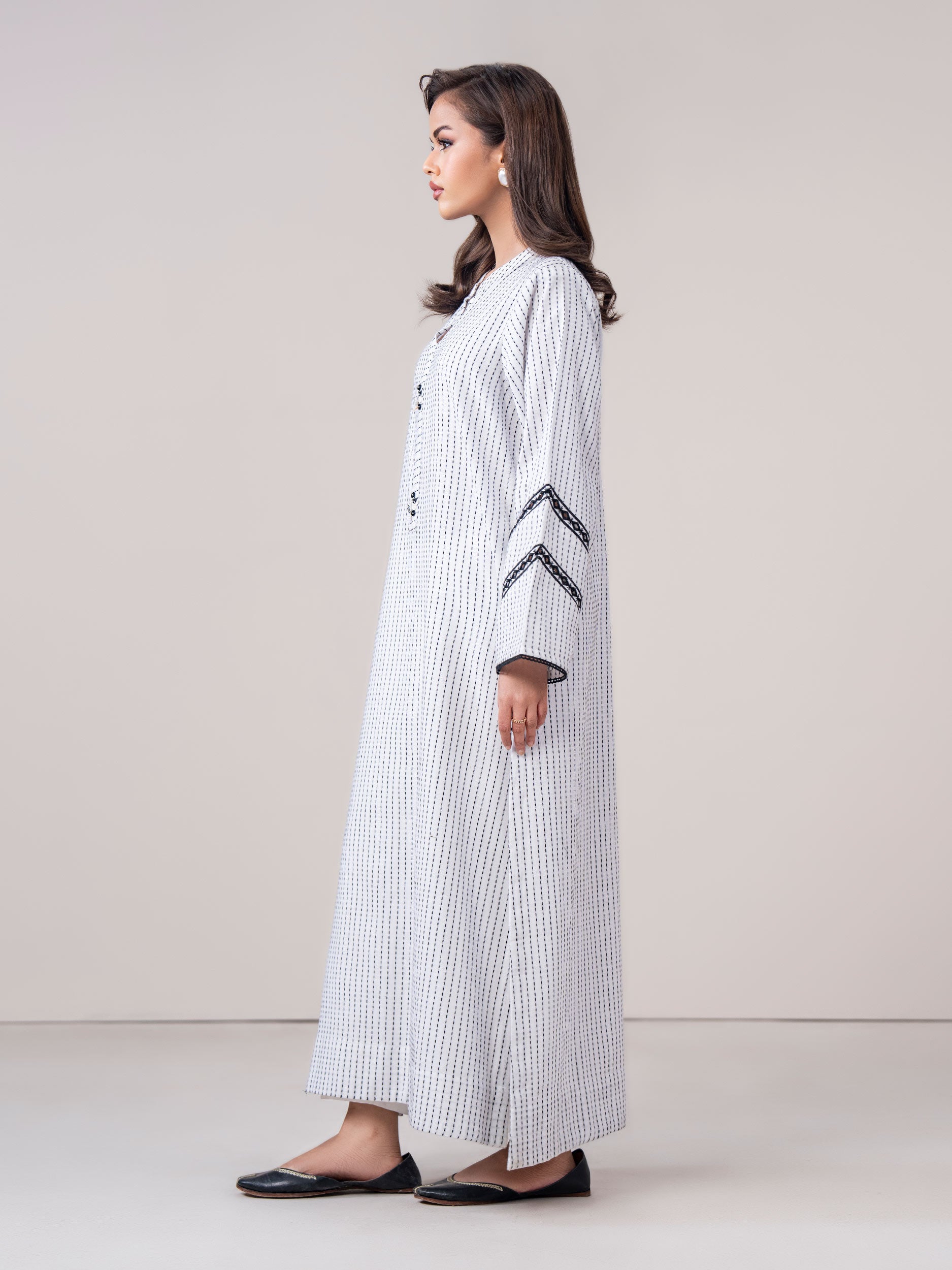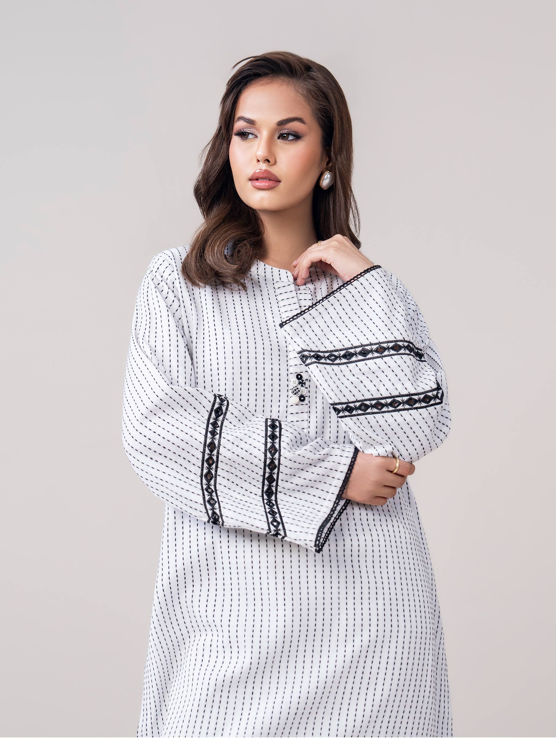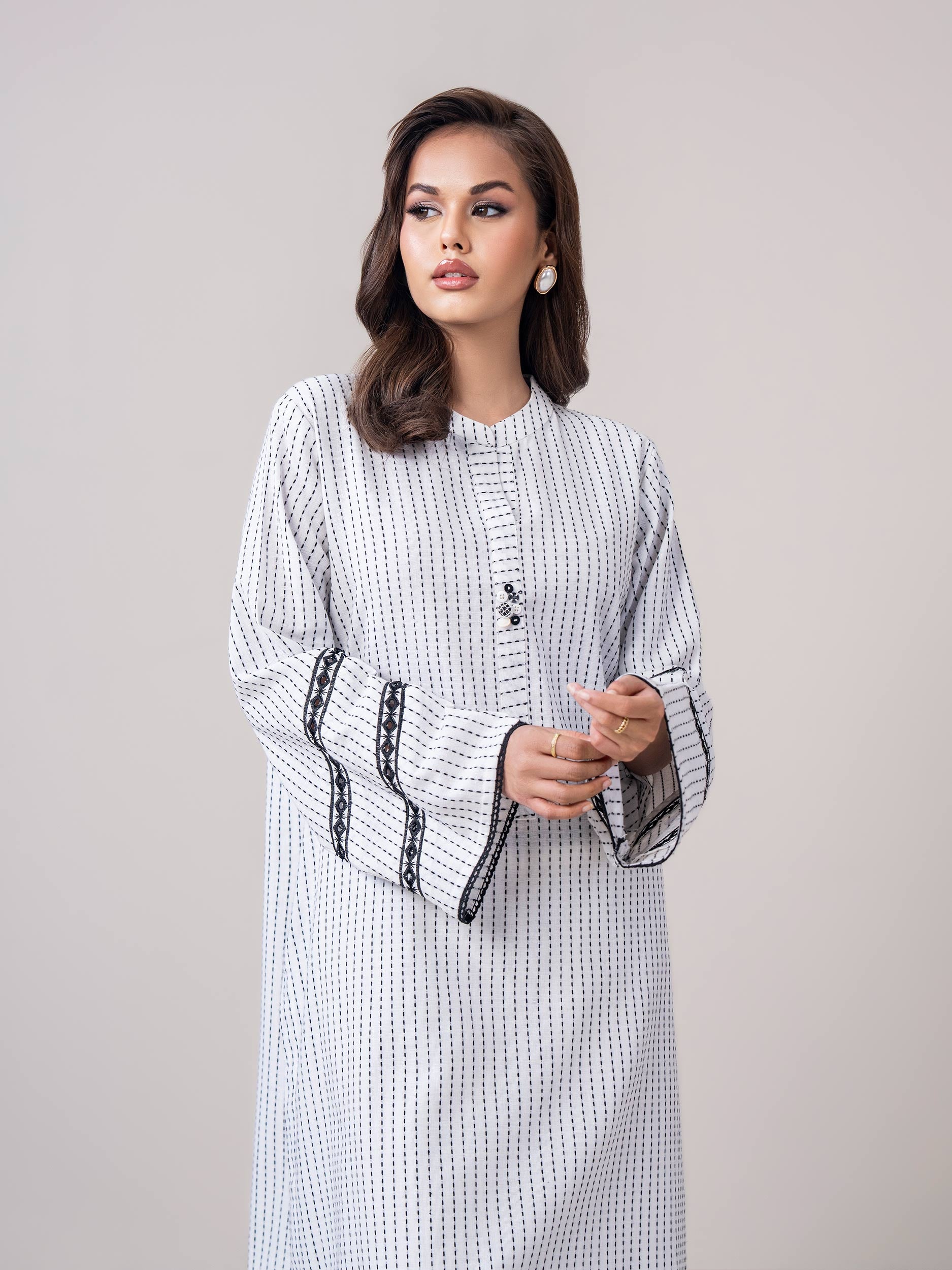 - Relaxed-fit shirt with a band collar, button-detailed neckline, and lace detailing on the