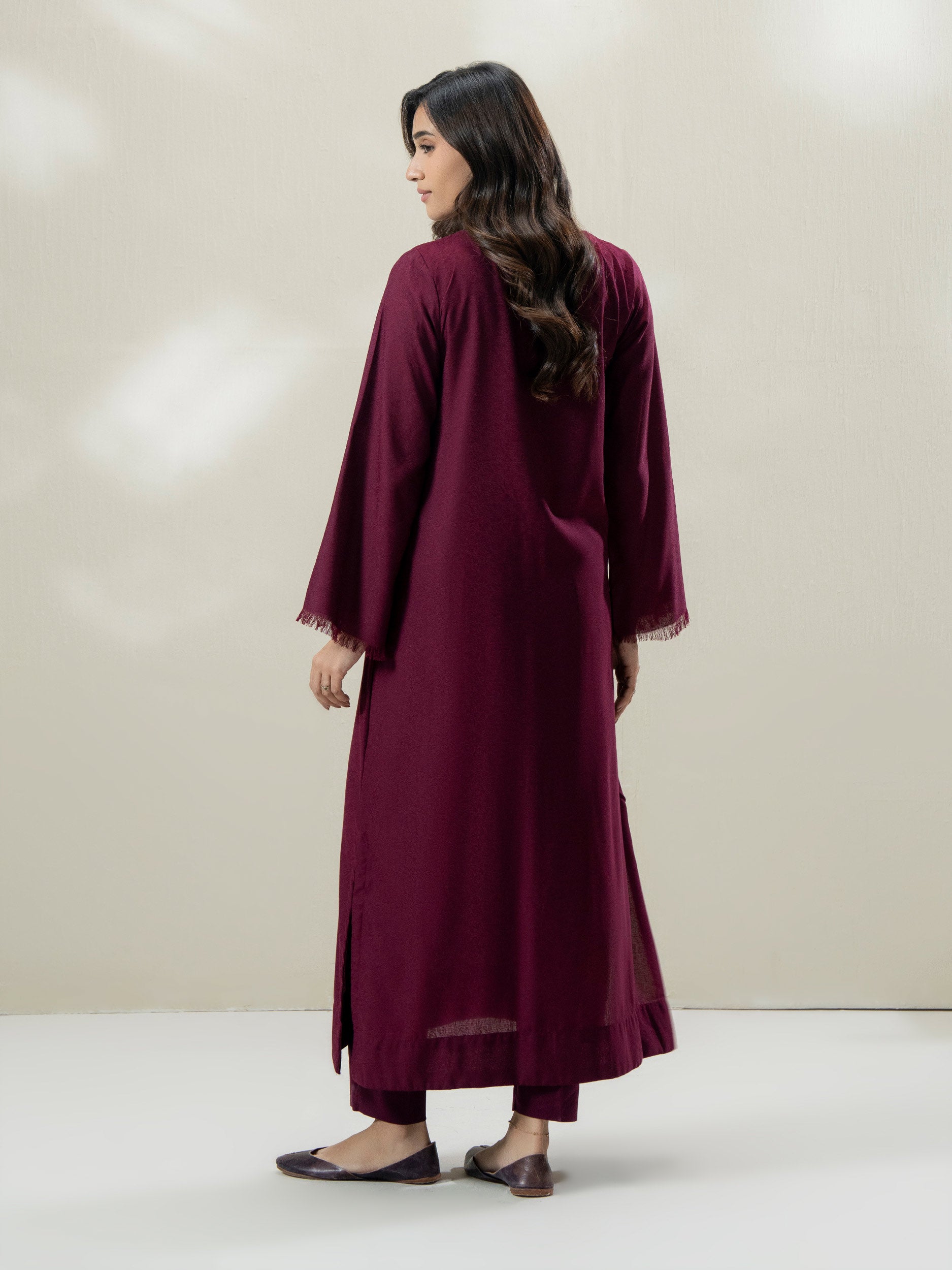 - Solid long shirt with a V-neckline, buttoned placket, and fringe-trimmed