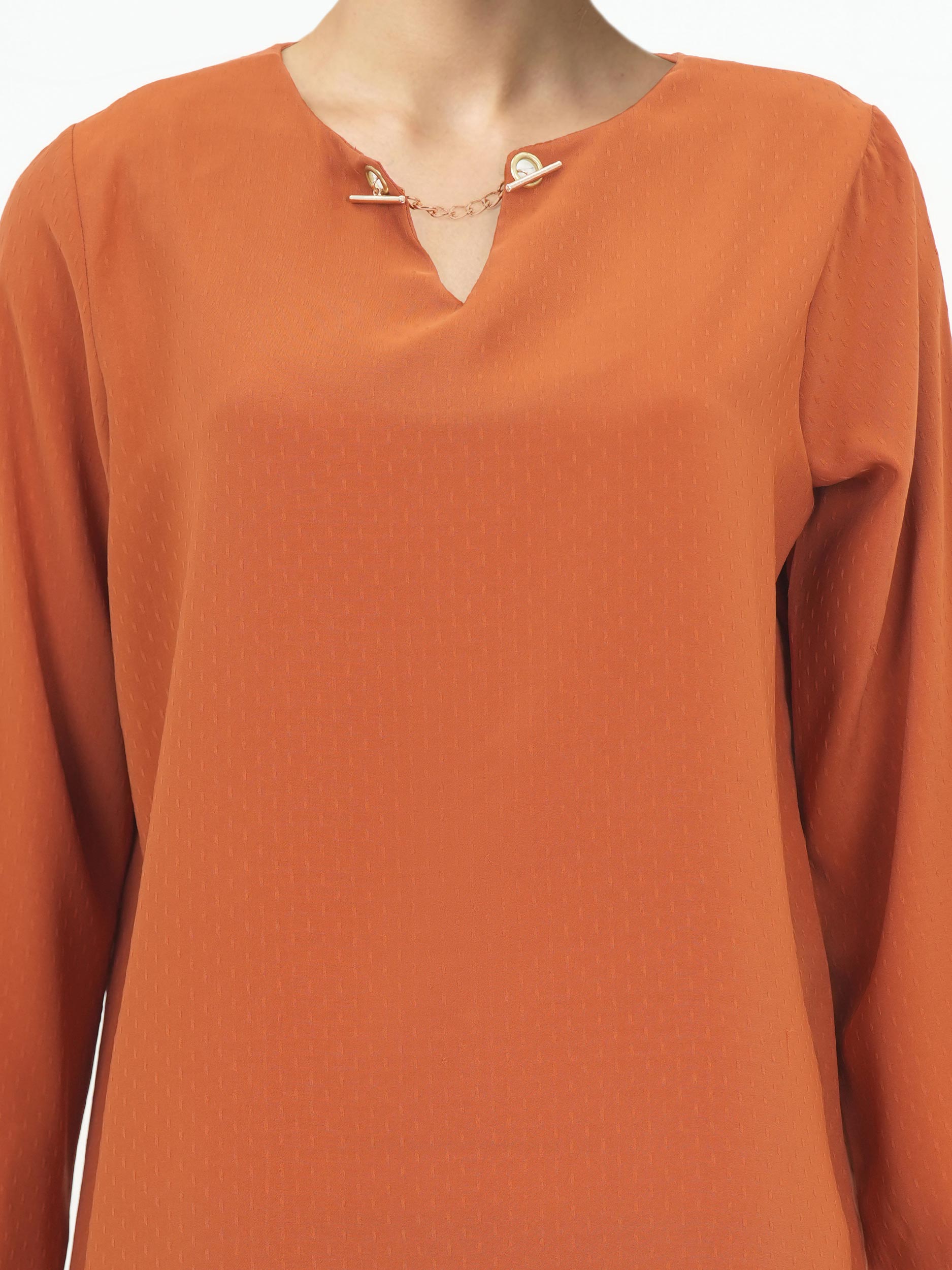- Round neckline self top with a V-slit and metal chain detail, and cuffed sleeves