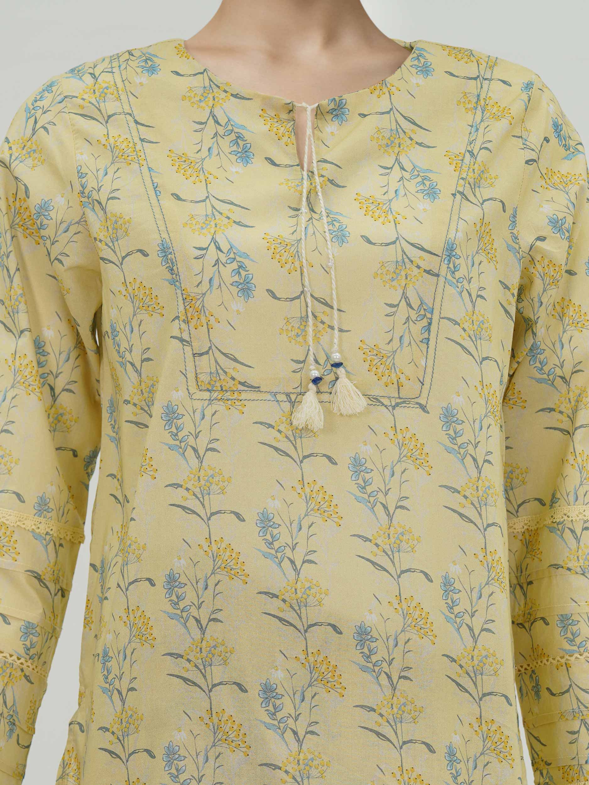 - Printed shirt with tassel neckline, lace and pleat detailing on sleeves