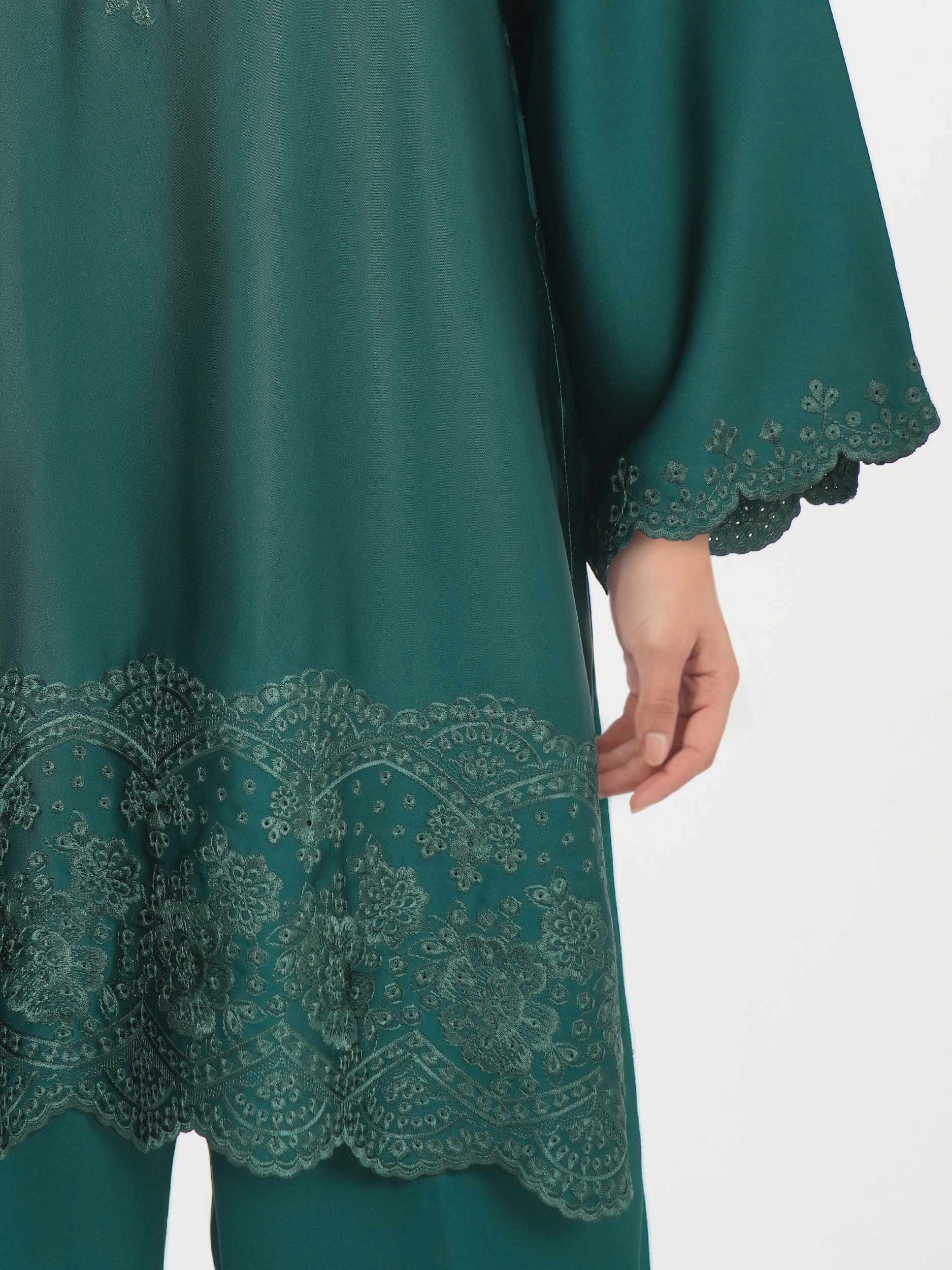 - Wide-leg trousers with an embroidered hem and elasticized waistband