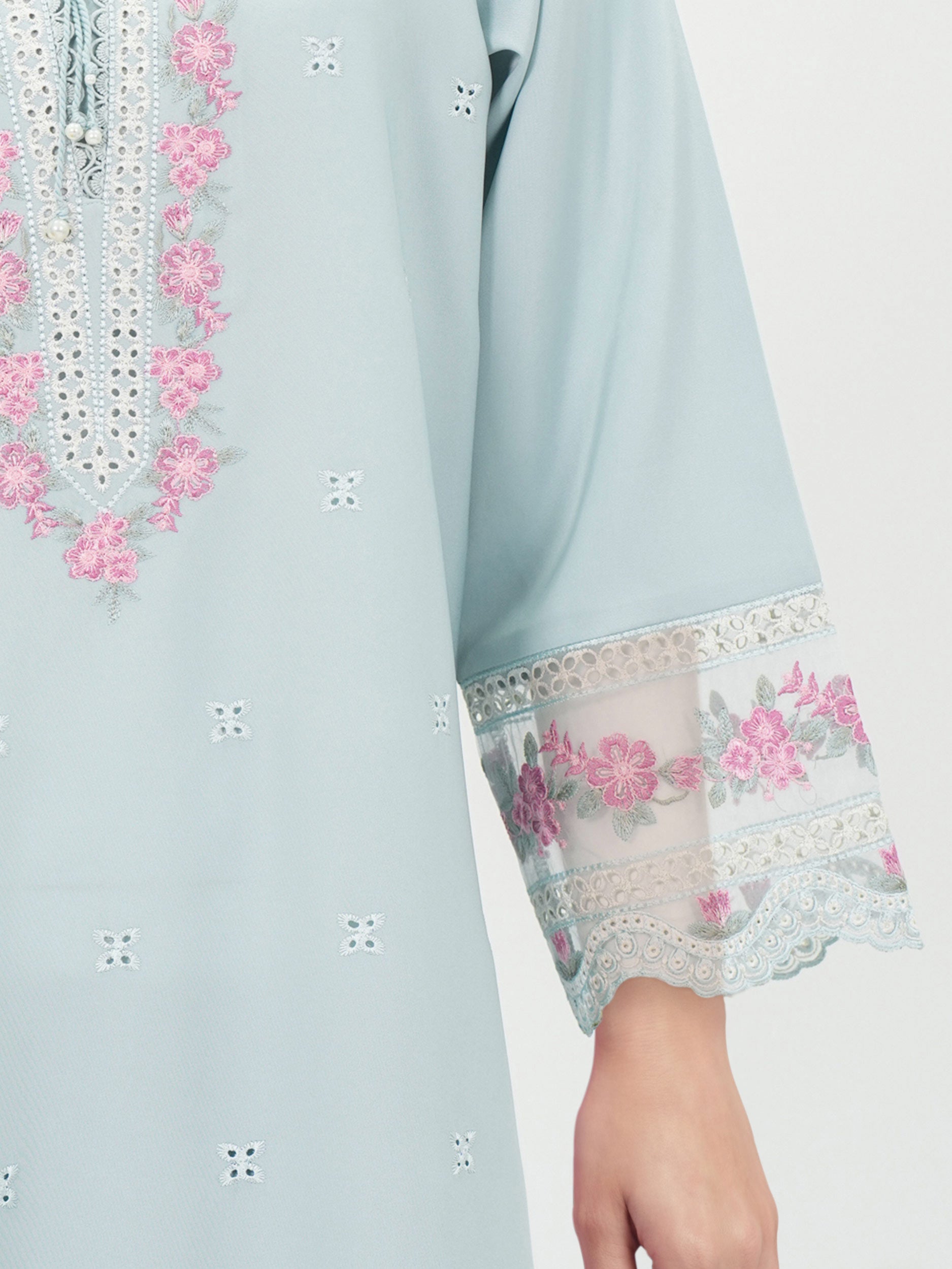 - Long, flowy shirt with cut-dana embroidery, a round neckline, and flowy sleeves with