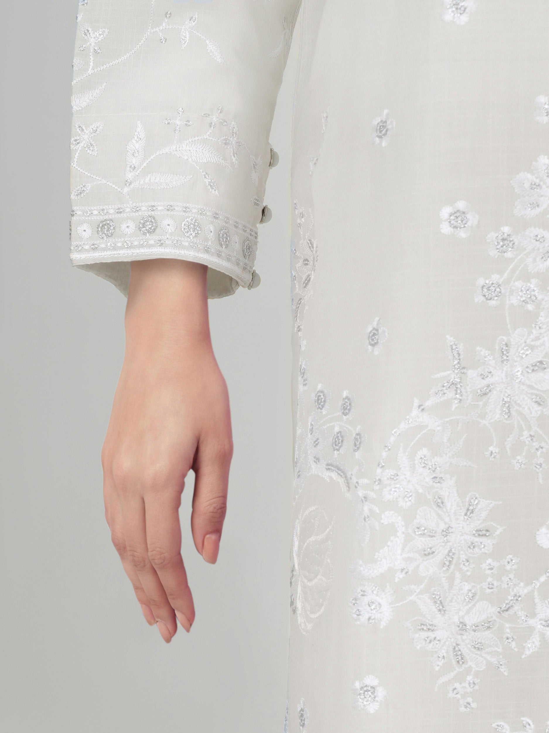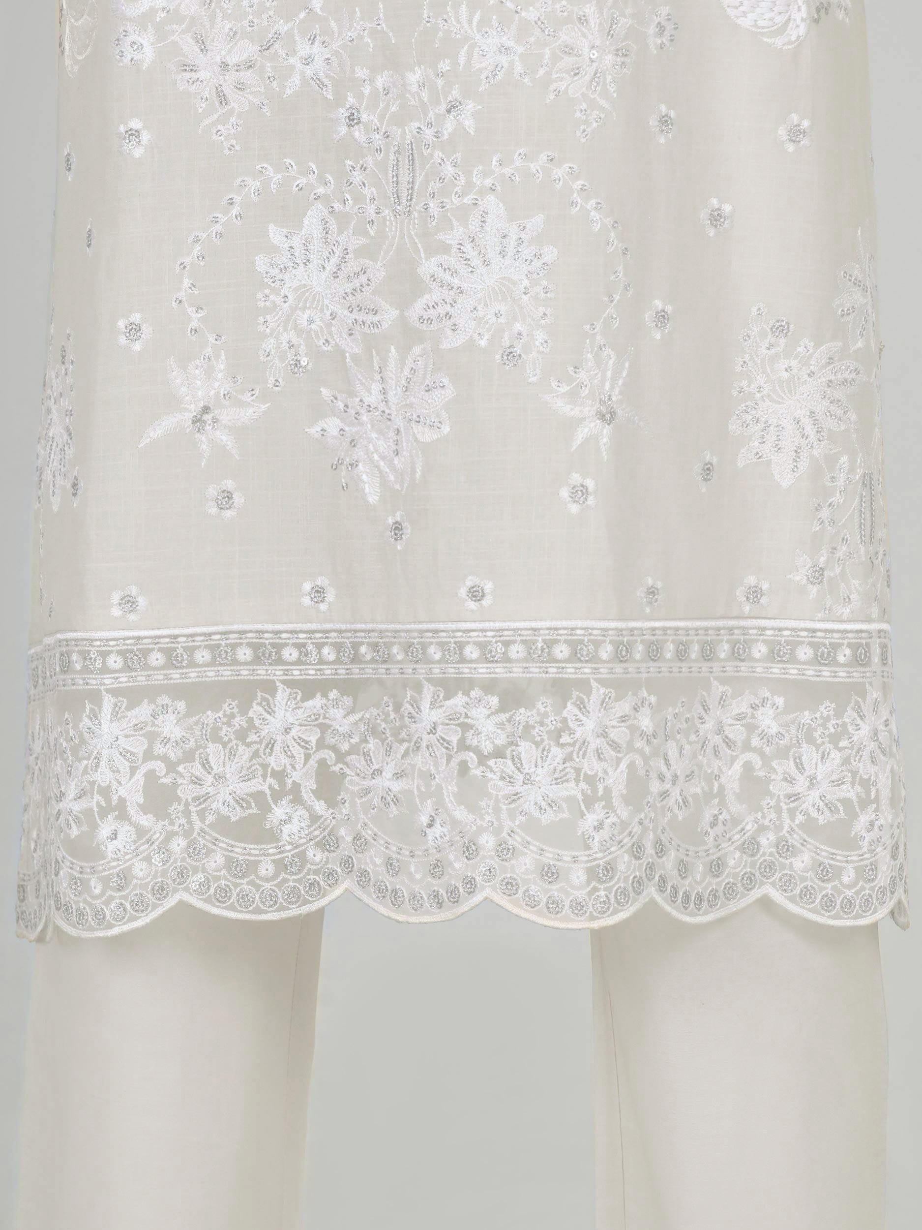 Thread and sequin embroidered shirt with organza scalloped patti on shirt hems and buttoned sleeves