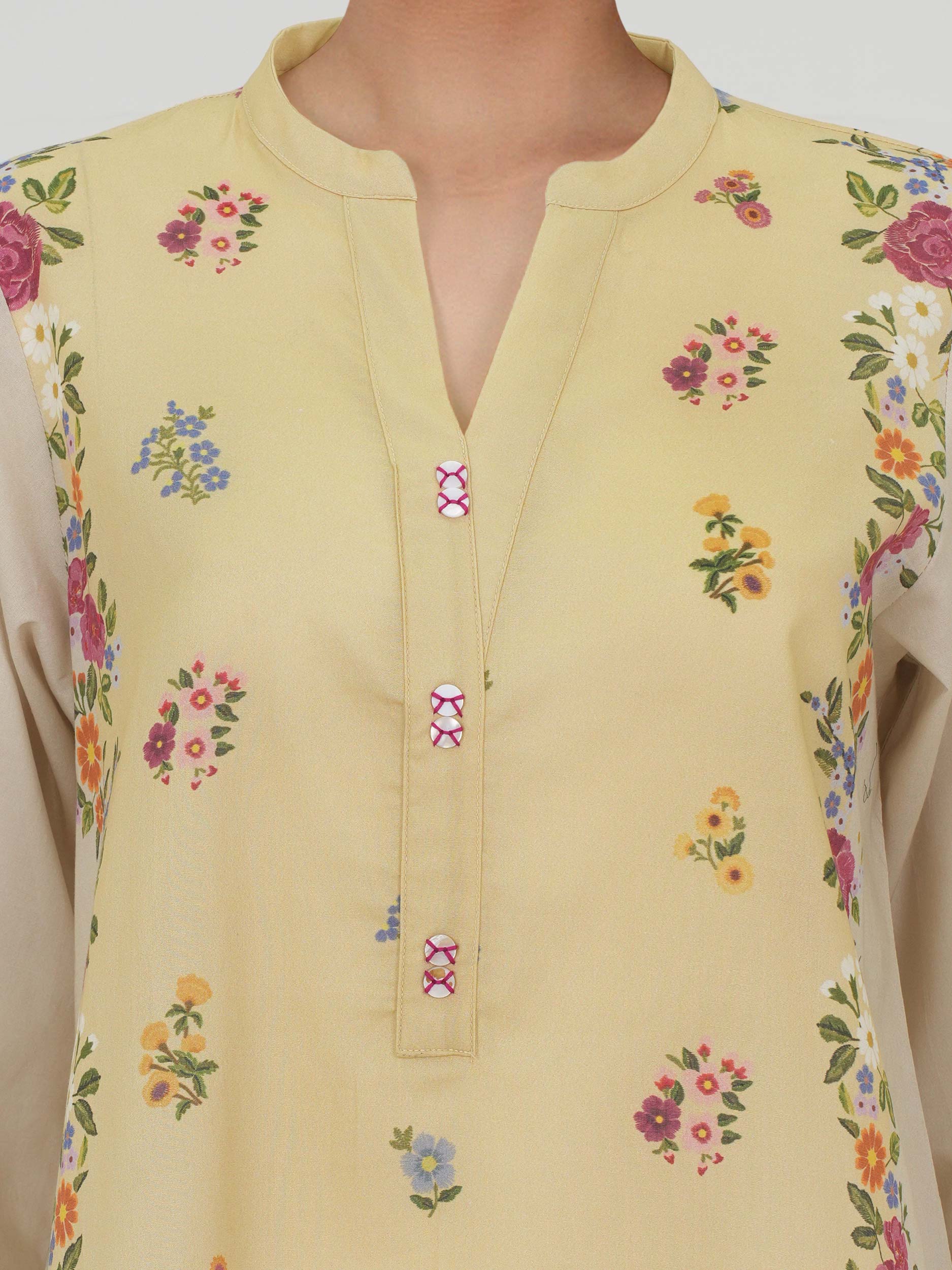 - Printed ombre shirt with V-slit band collar, button detailed placket and round shirt hem