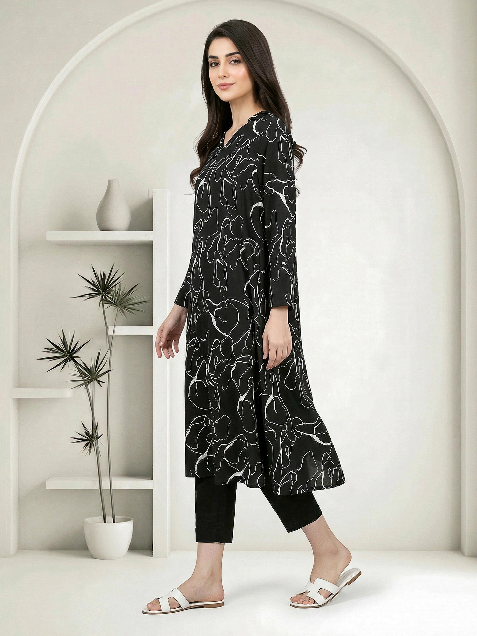 - Printed dress with a soft collar and button-detailed cuffed sleeves