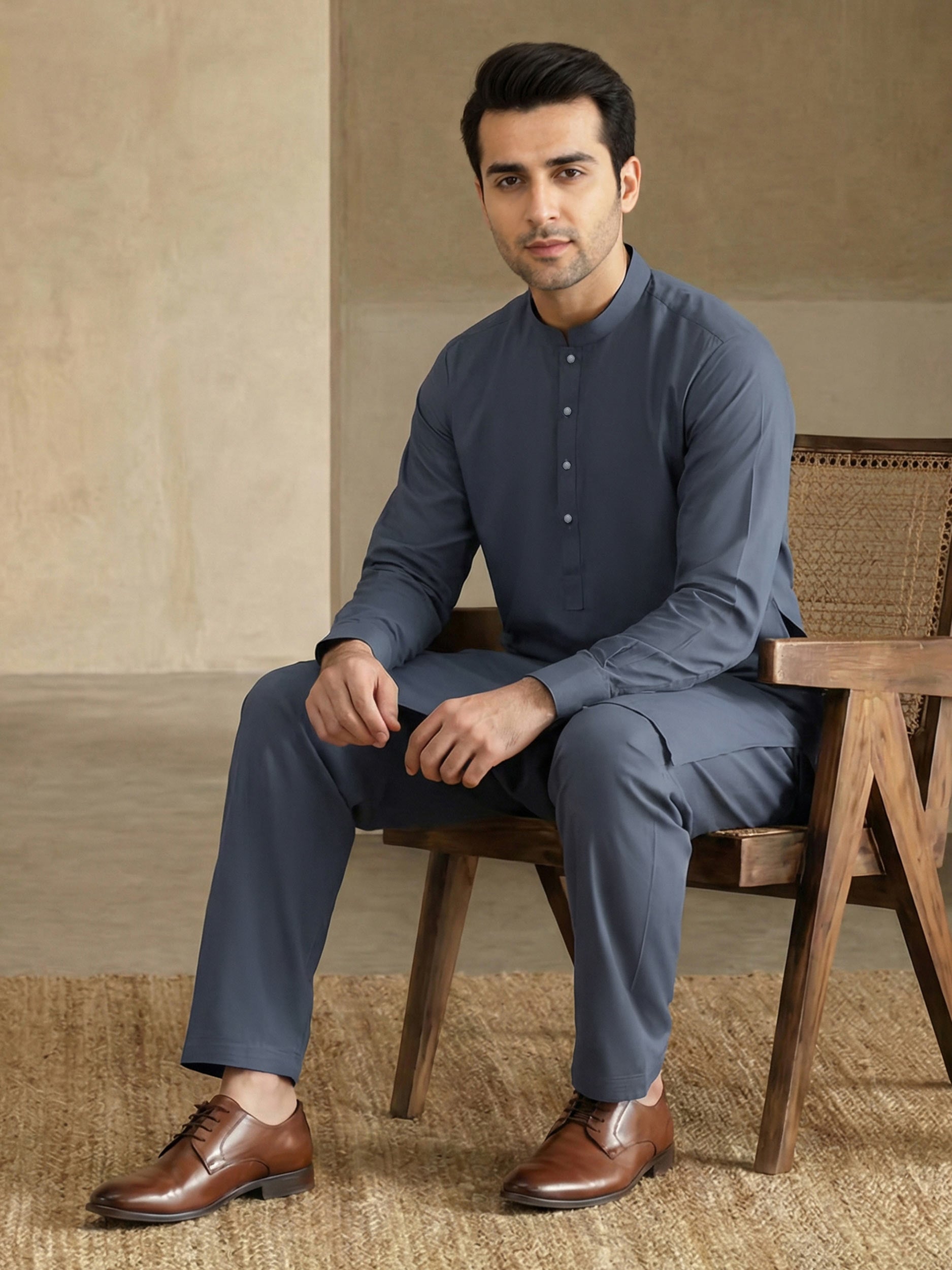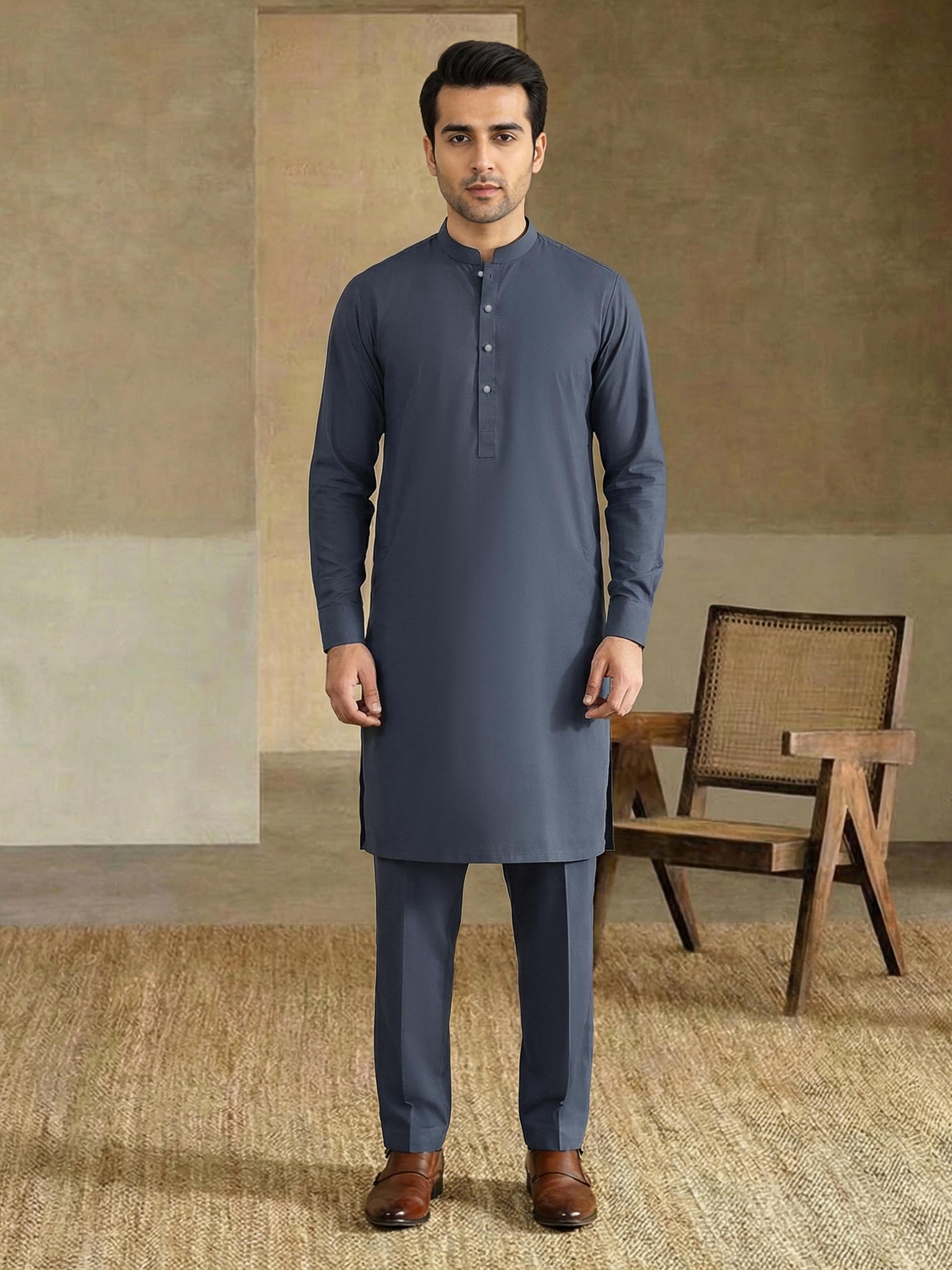 - Kurta with a band collar, buttoned placket, full cuffed sleeves, and two side pockets