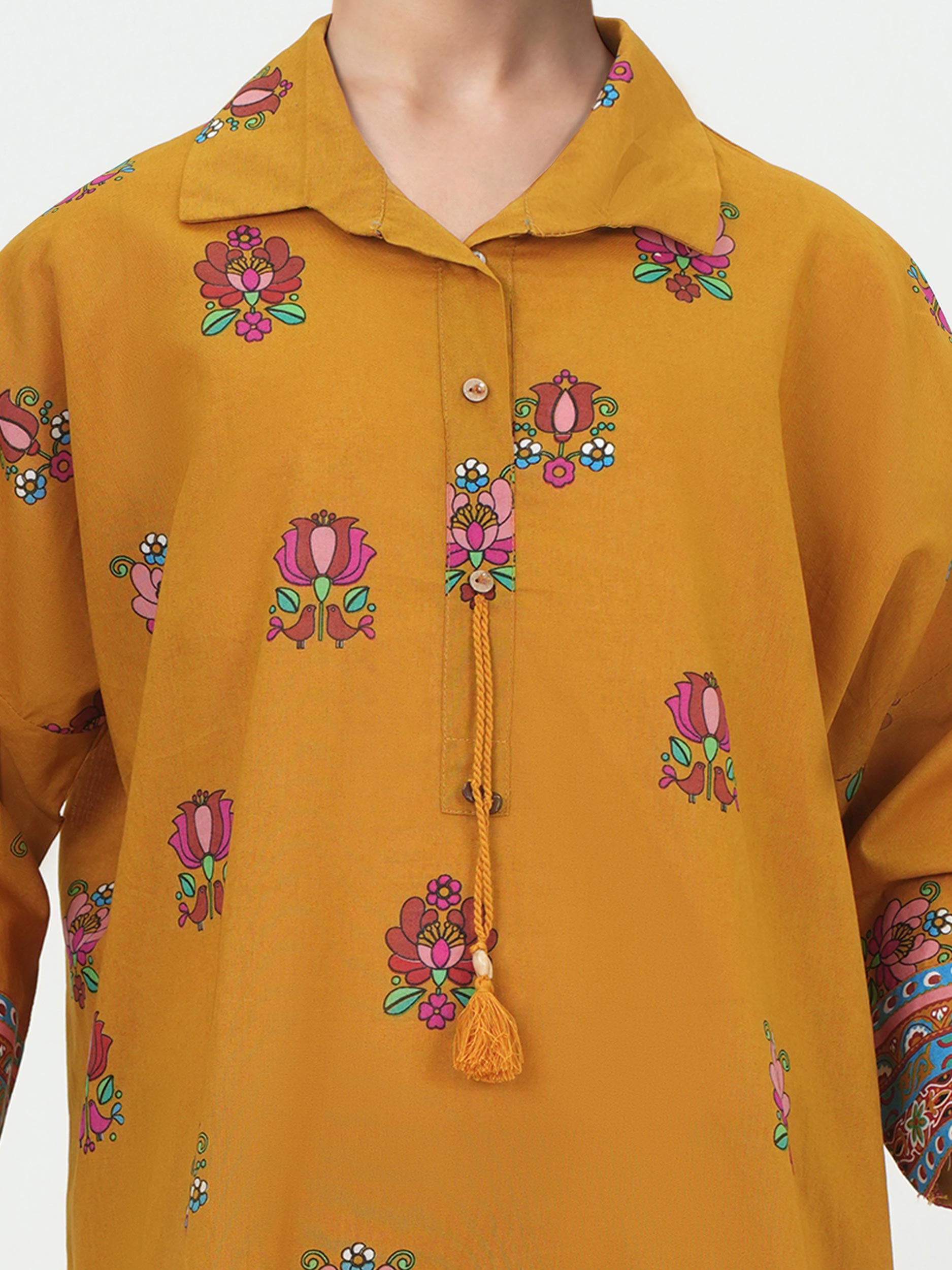 Printed collared shirt with a tassel-tie placket and wide sleeves with printed borders
