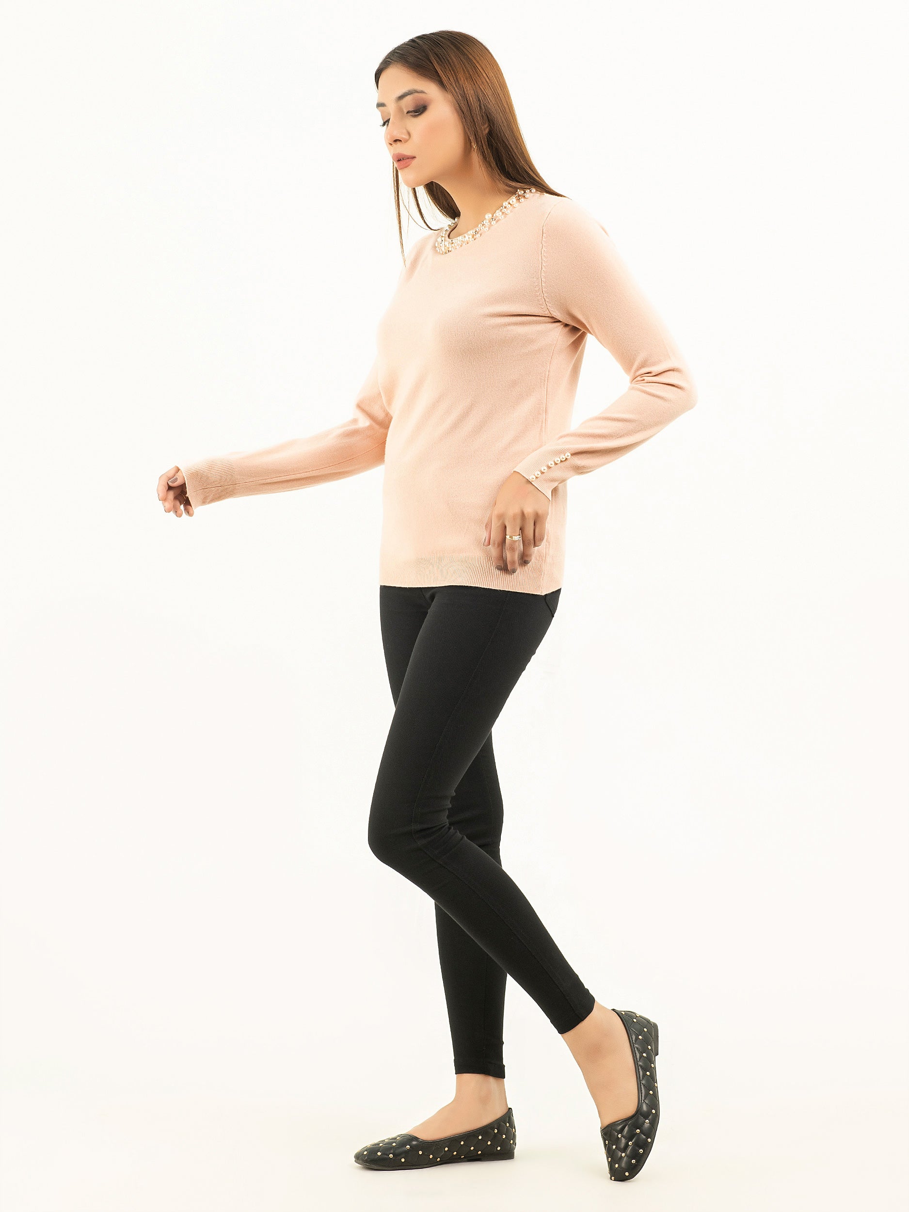 - Full sleeves with pearl beads on the ribbed cuffs