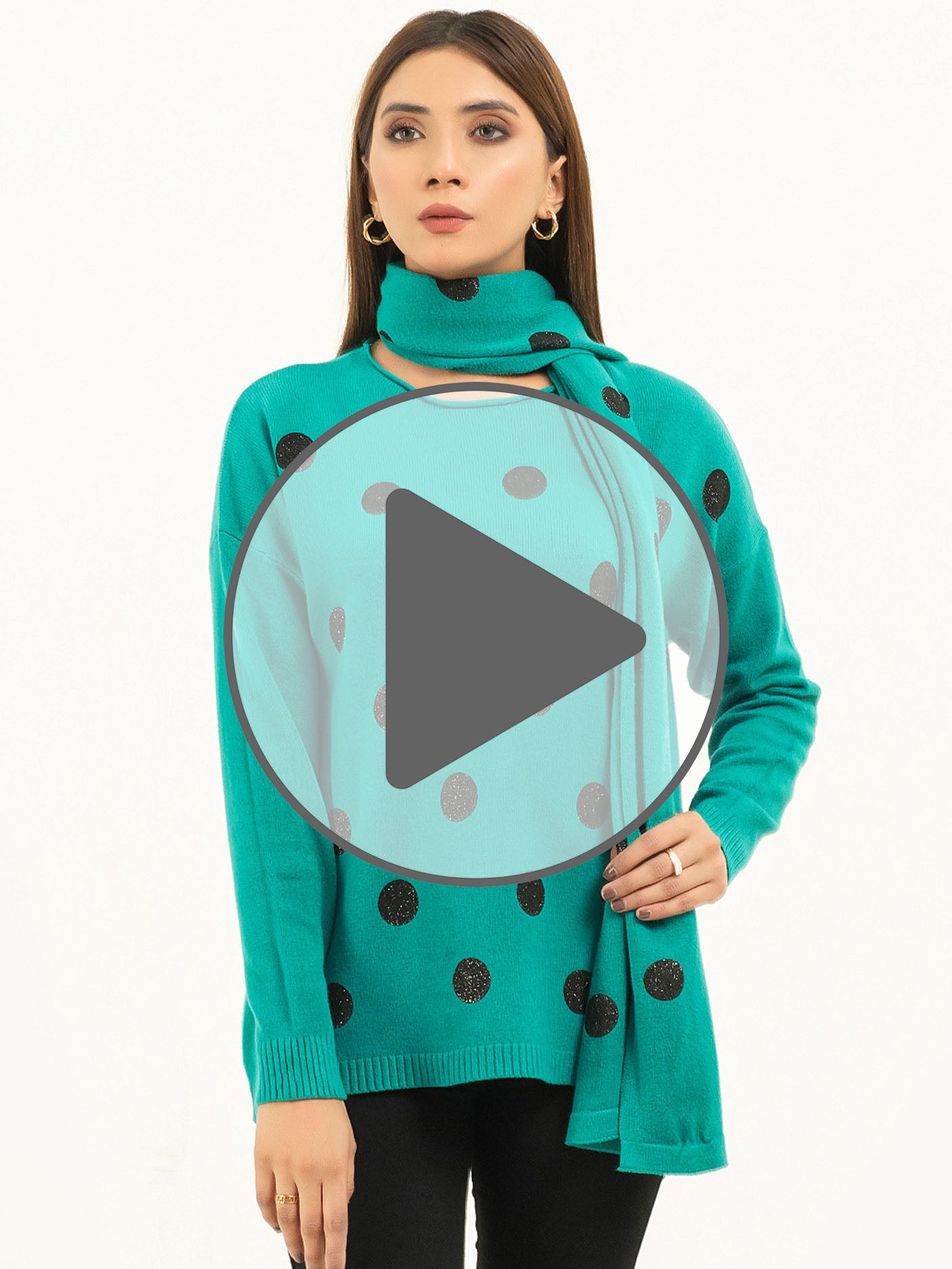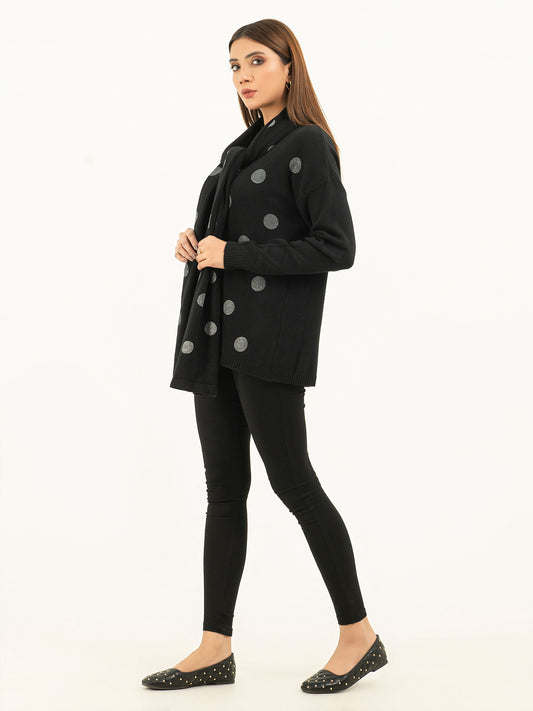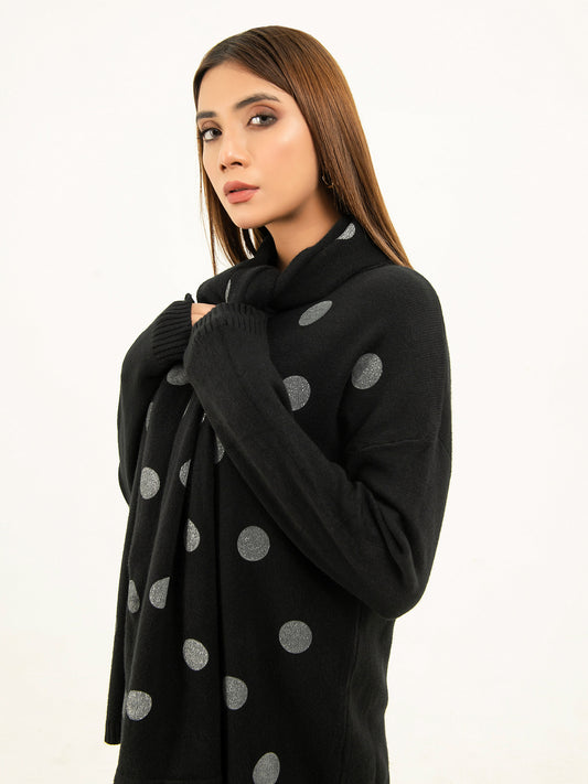 - Glittery polka dot pattern on the sweater's front and scarf