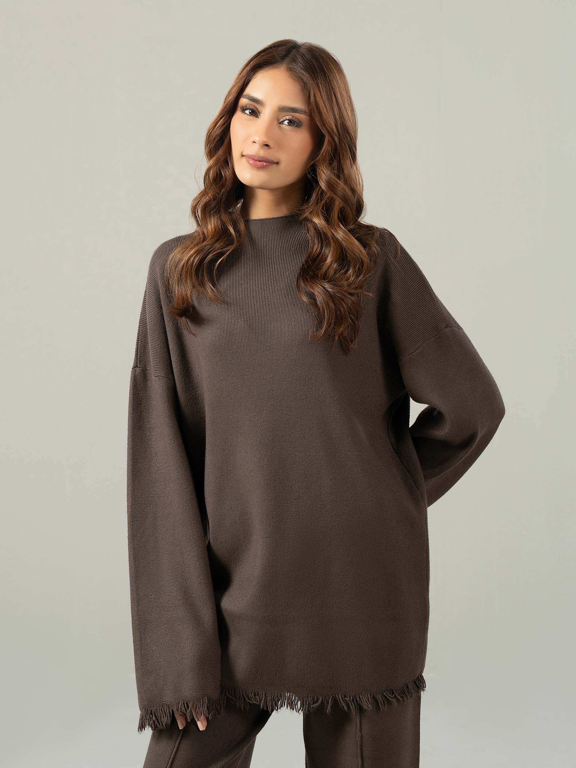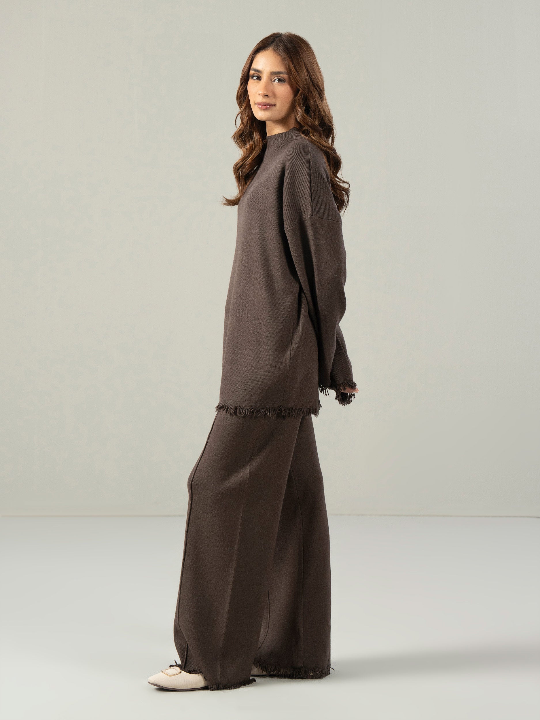 - Knitted wide-leg pants with raw edges and an elasticised waistband