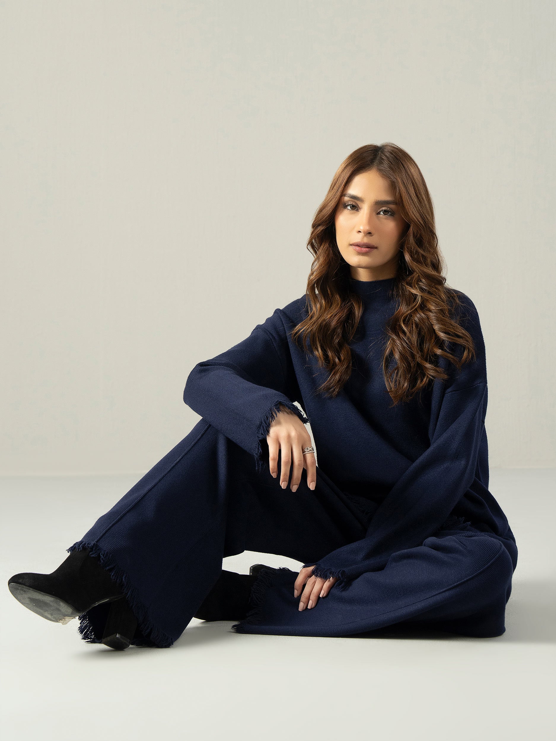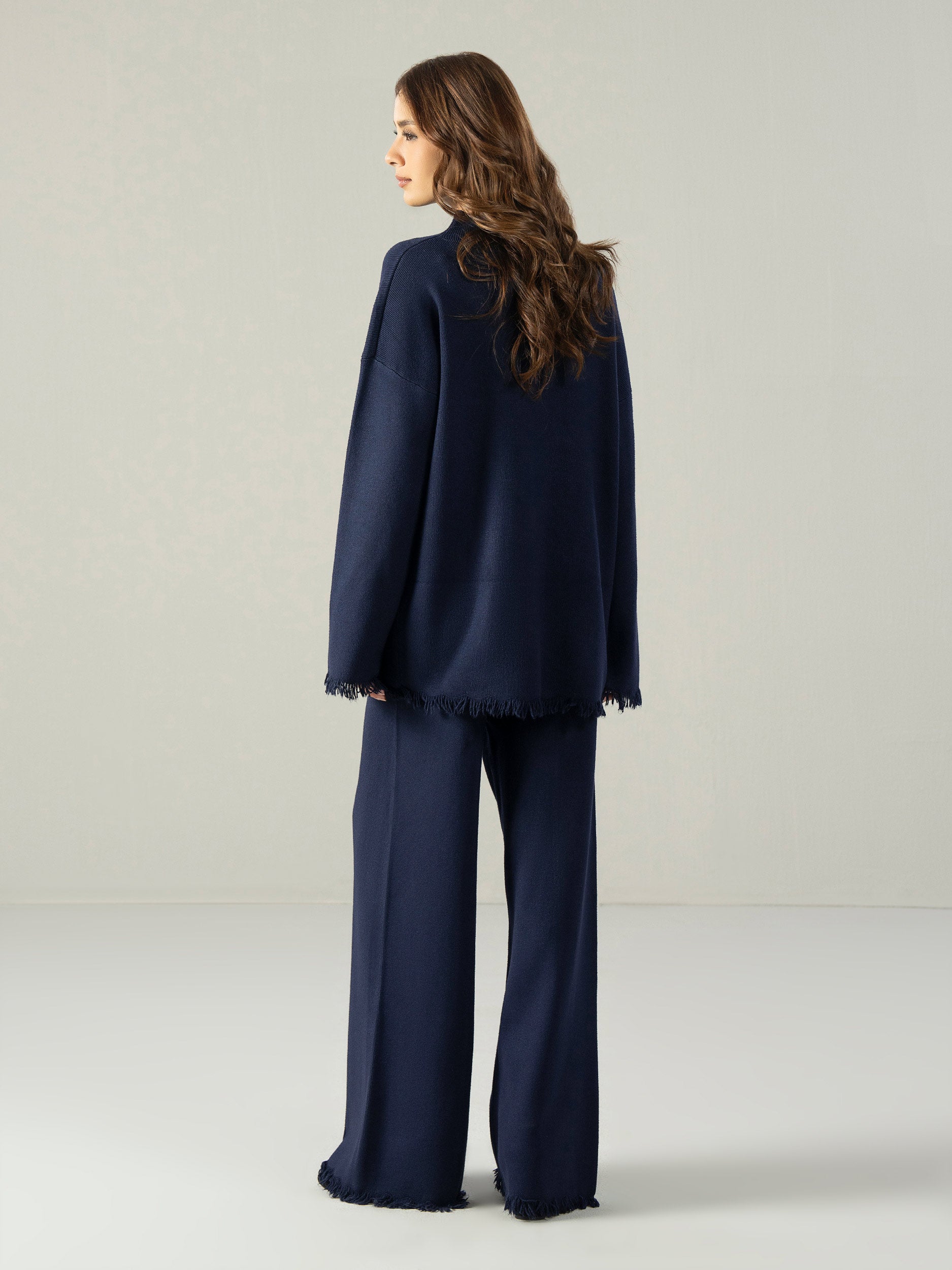 - Knitted wide-leg pants with raw edges and an elasticised waistband