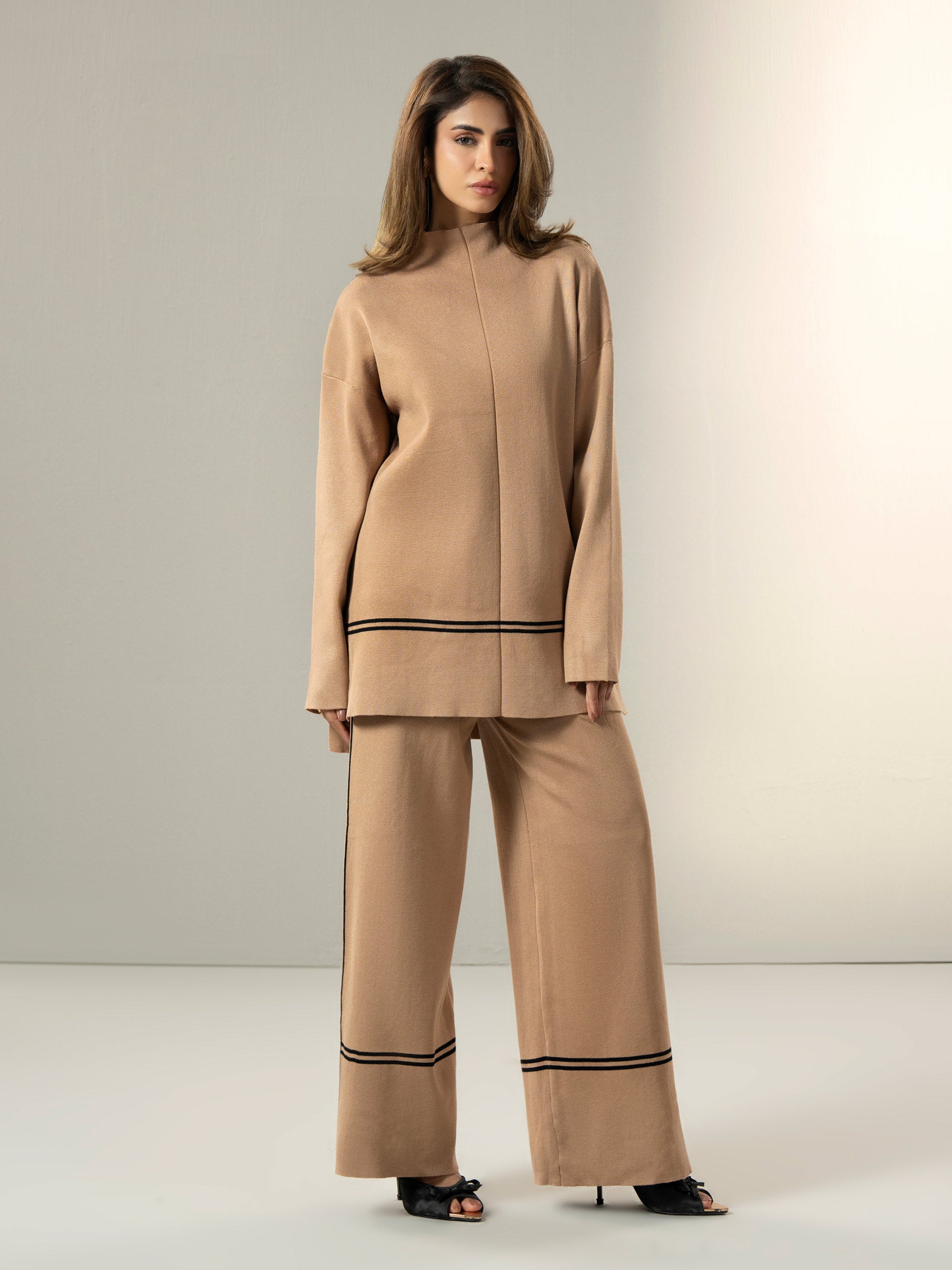 - Knitted wide-leg pants with black stripes and an elastic waistband