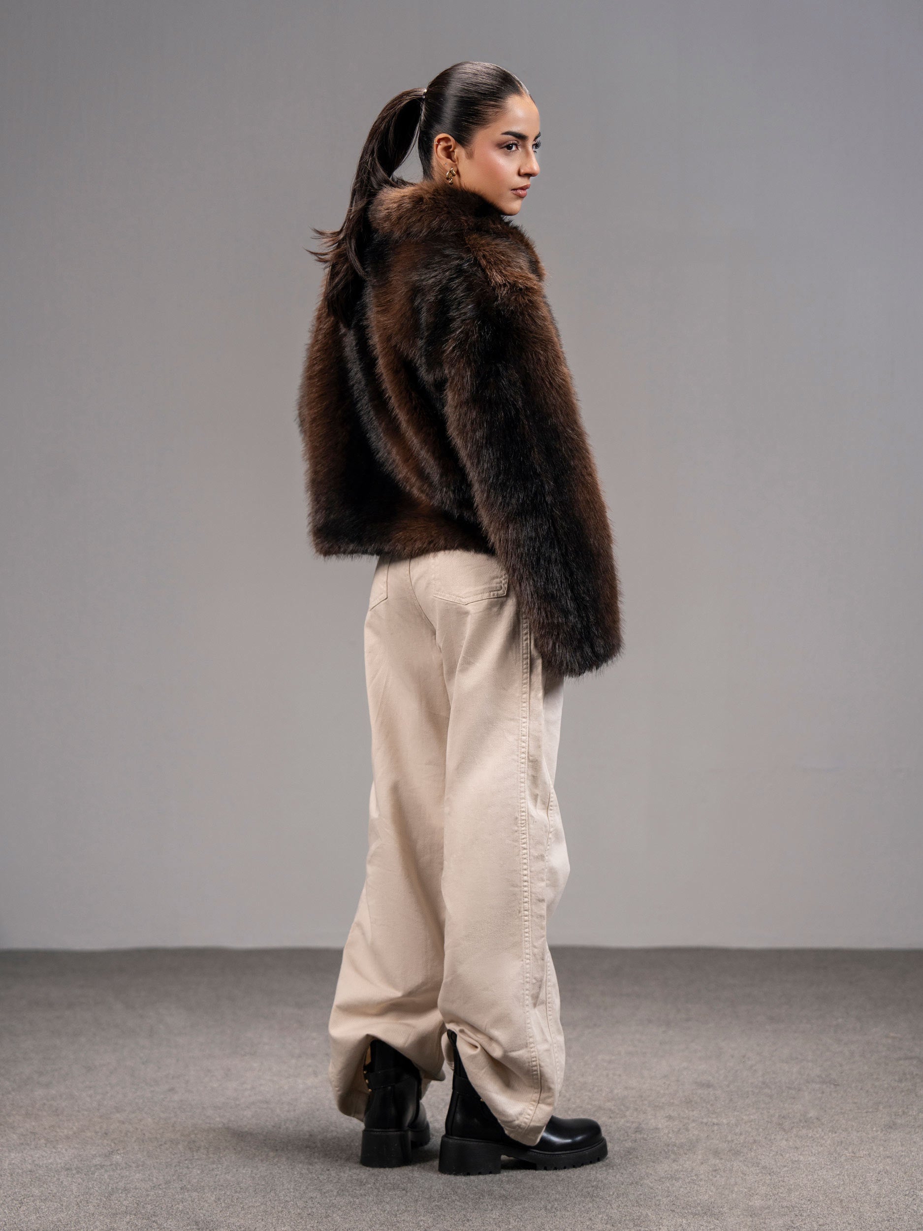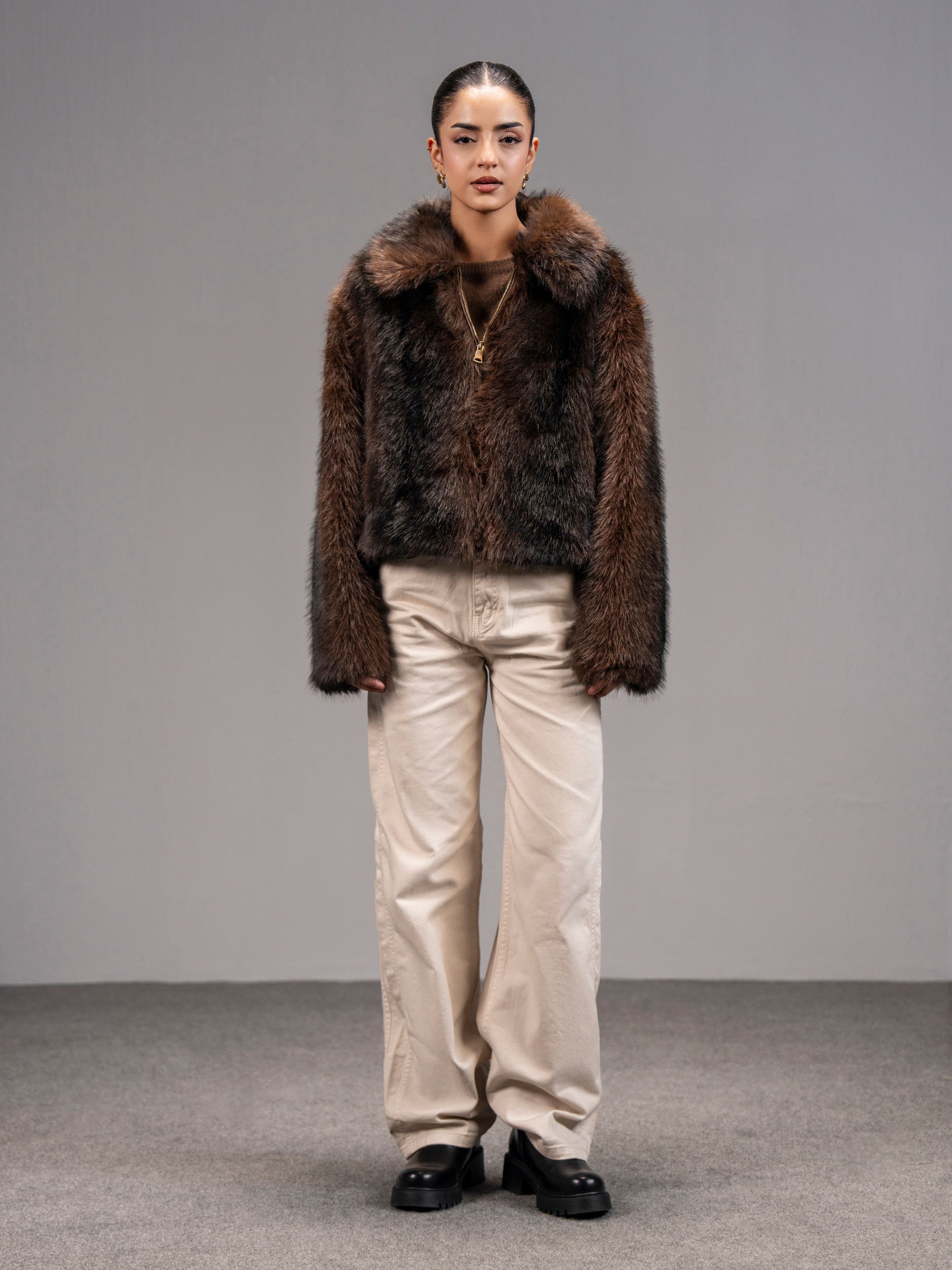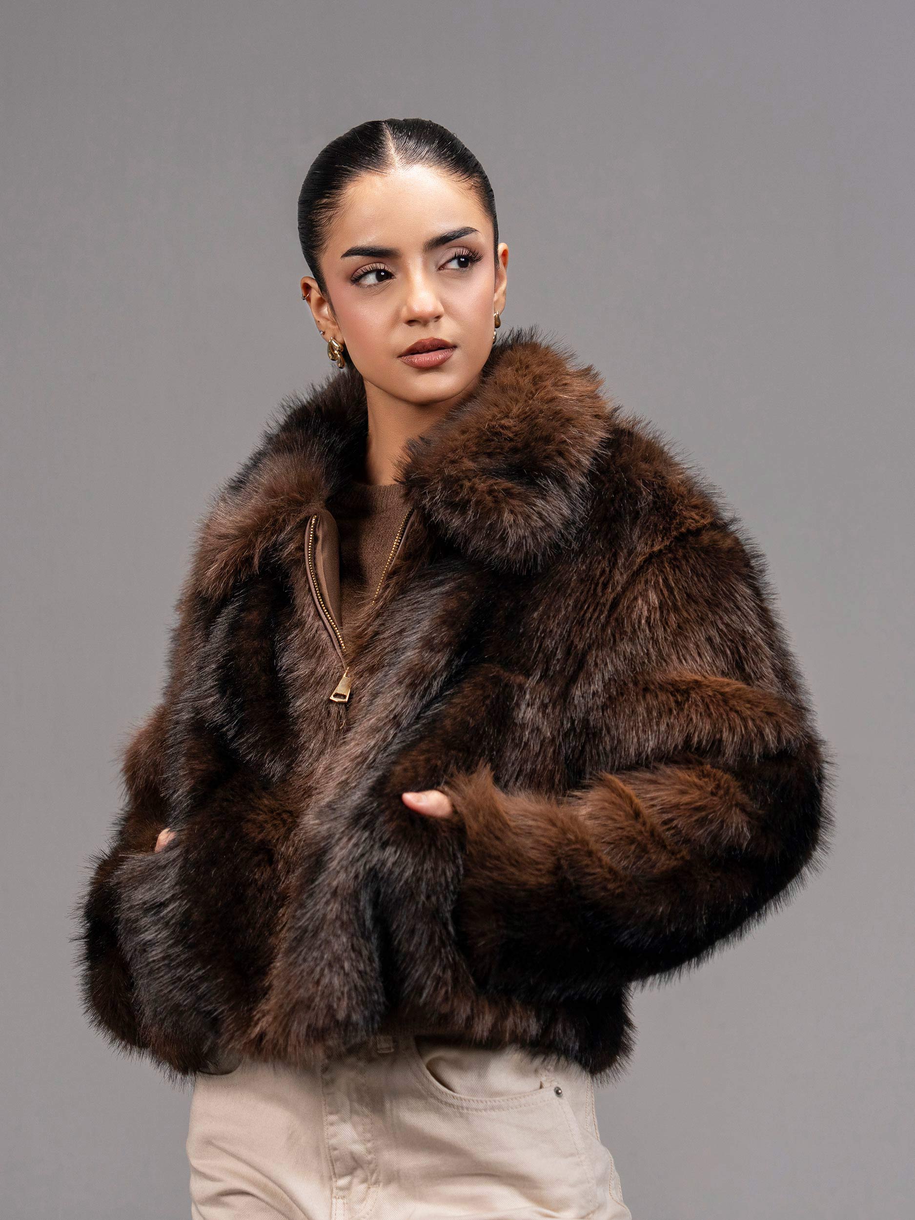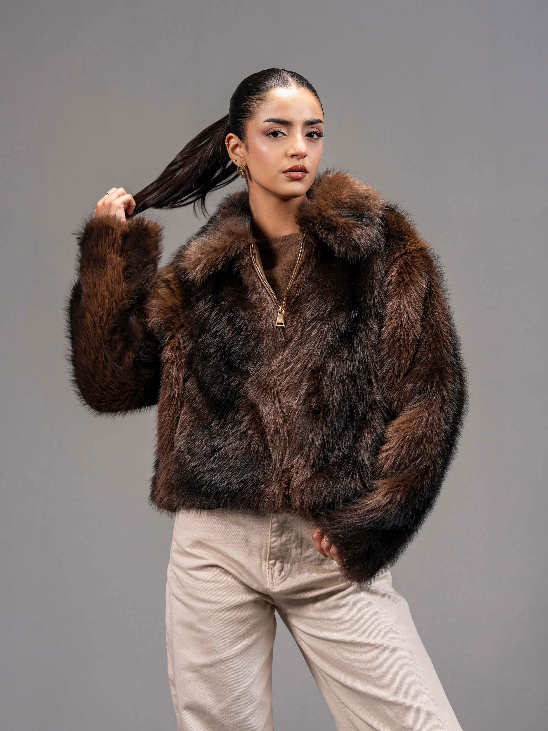 - Two-tone faux fur–trimmed jacket with a zip closure