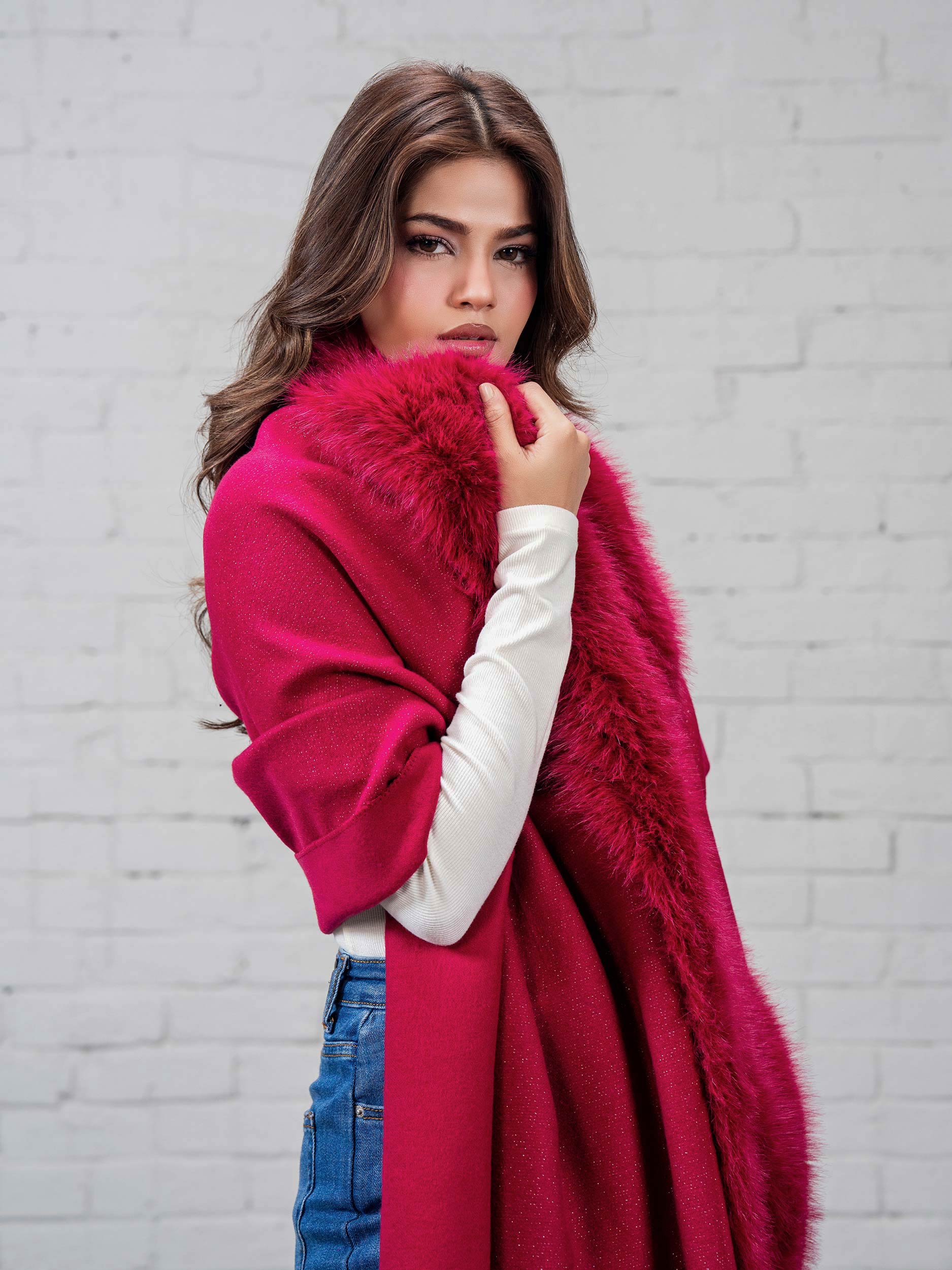 - Shimmer cape with fur-trimmed edges and a wrap-style closure
