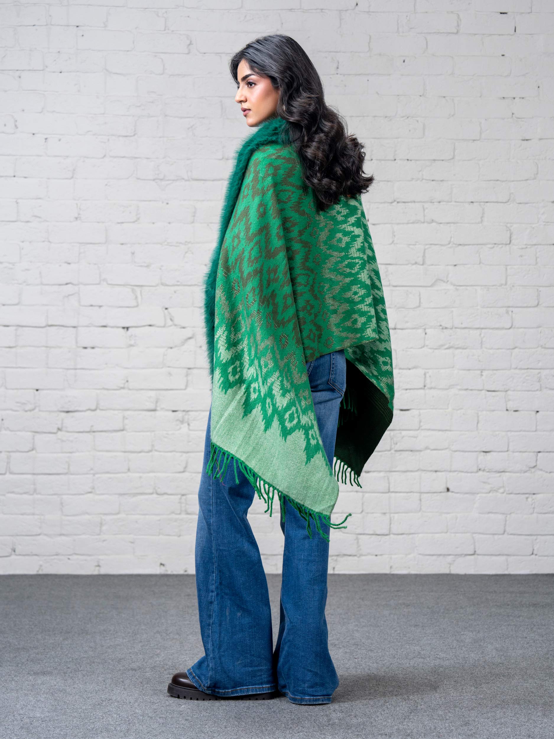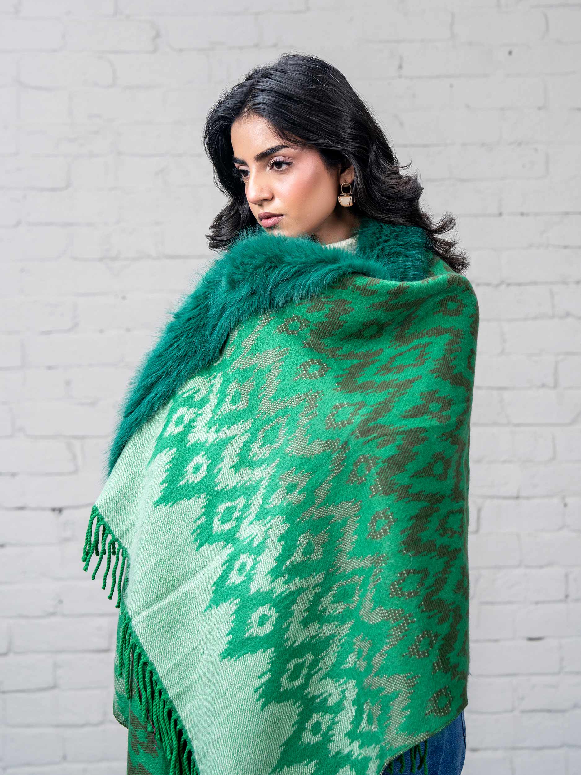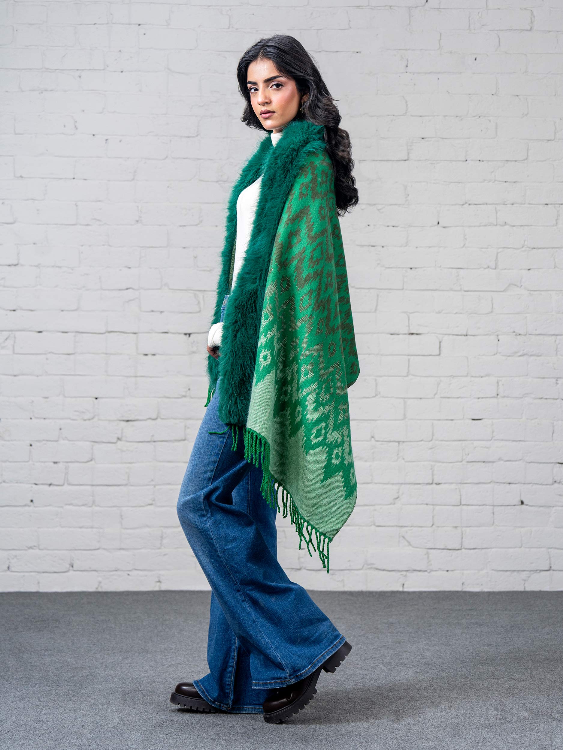 - Two-tone paisley-patterned cape shawl with one-sided faux-fur trim and a fringed