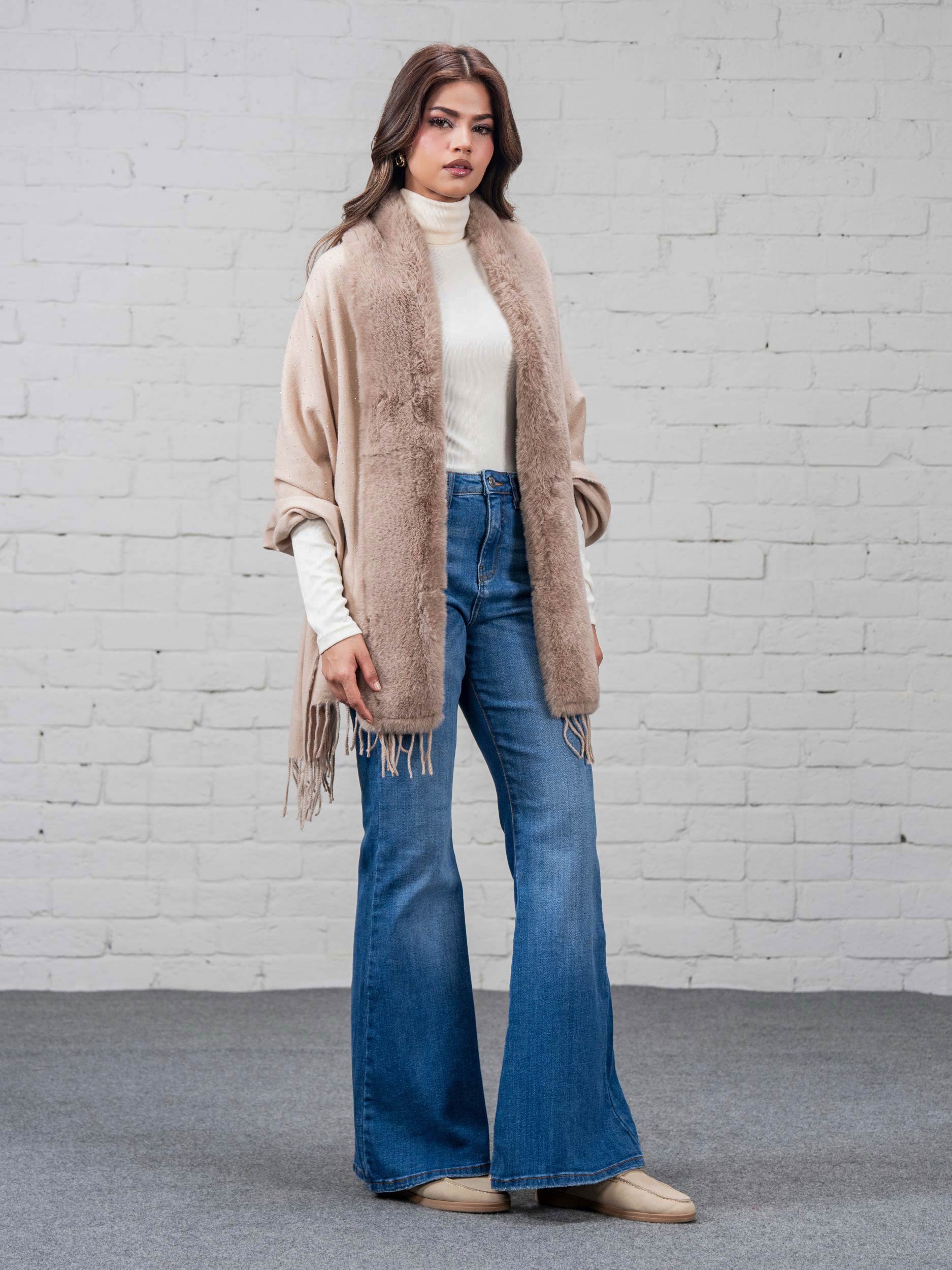 Rhinestones embellished cape shawl with faux-fur trim on one side and a fringed hem