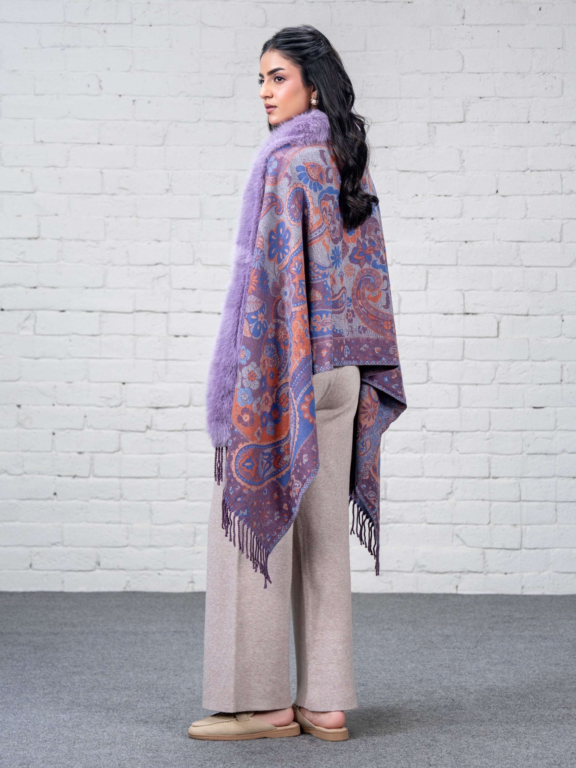 - Multi-colored woven-patterned cape shawl with one-sided faux-fur trim and a fringed