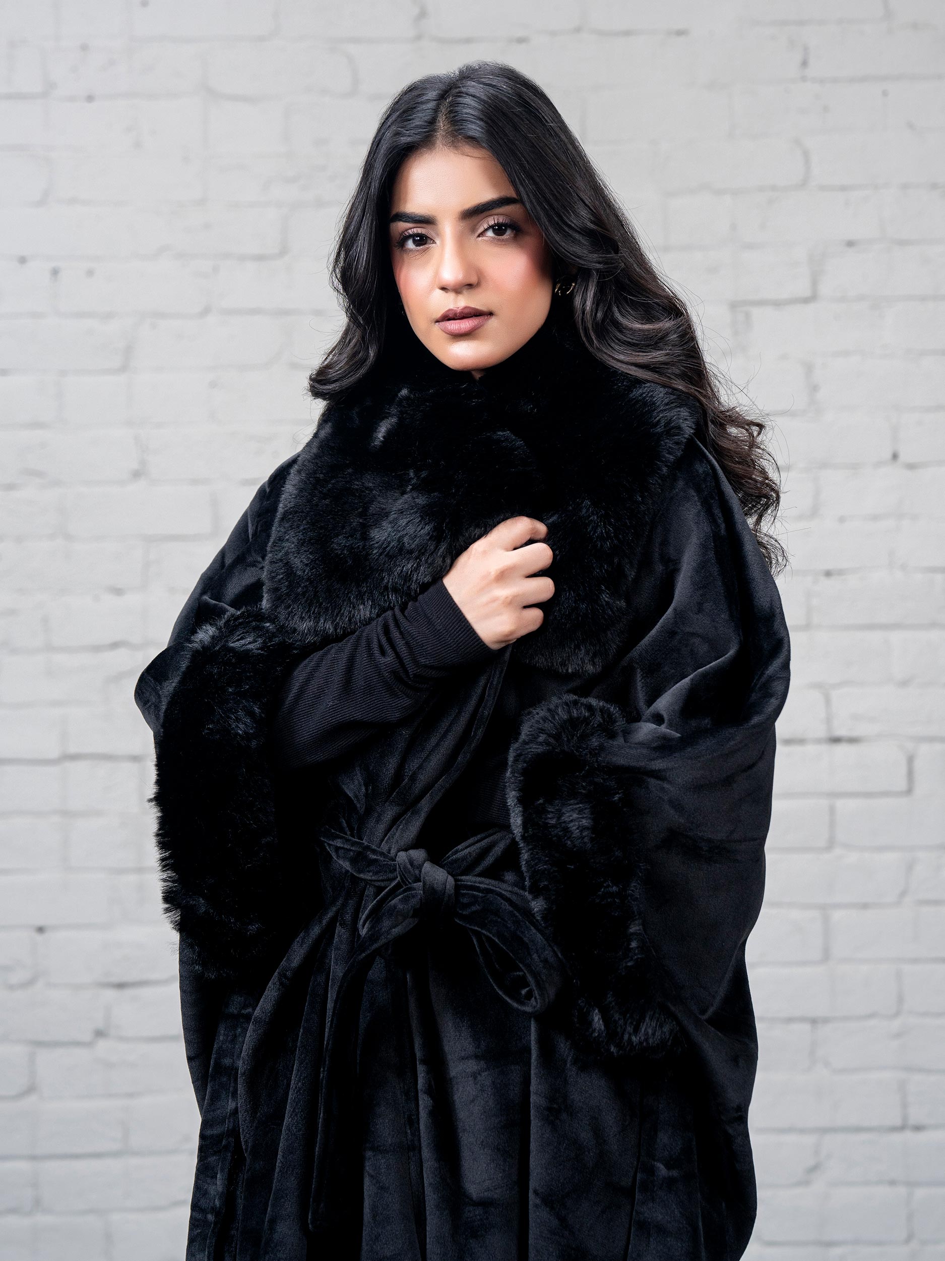 - Heavy fur collar with fur-trimmed sleeve hems and a waist belt