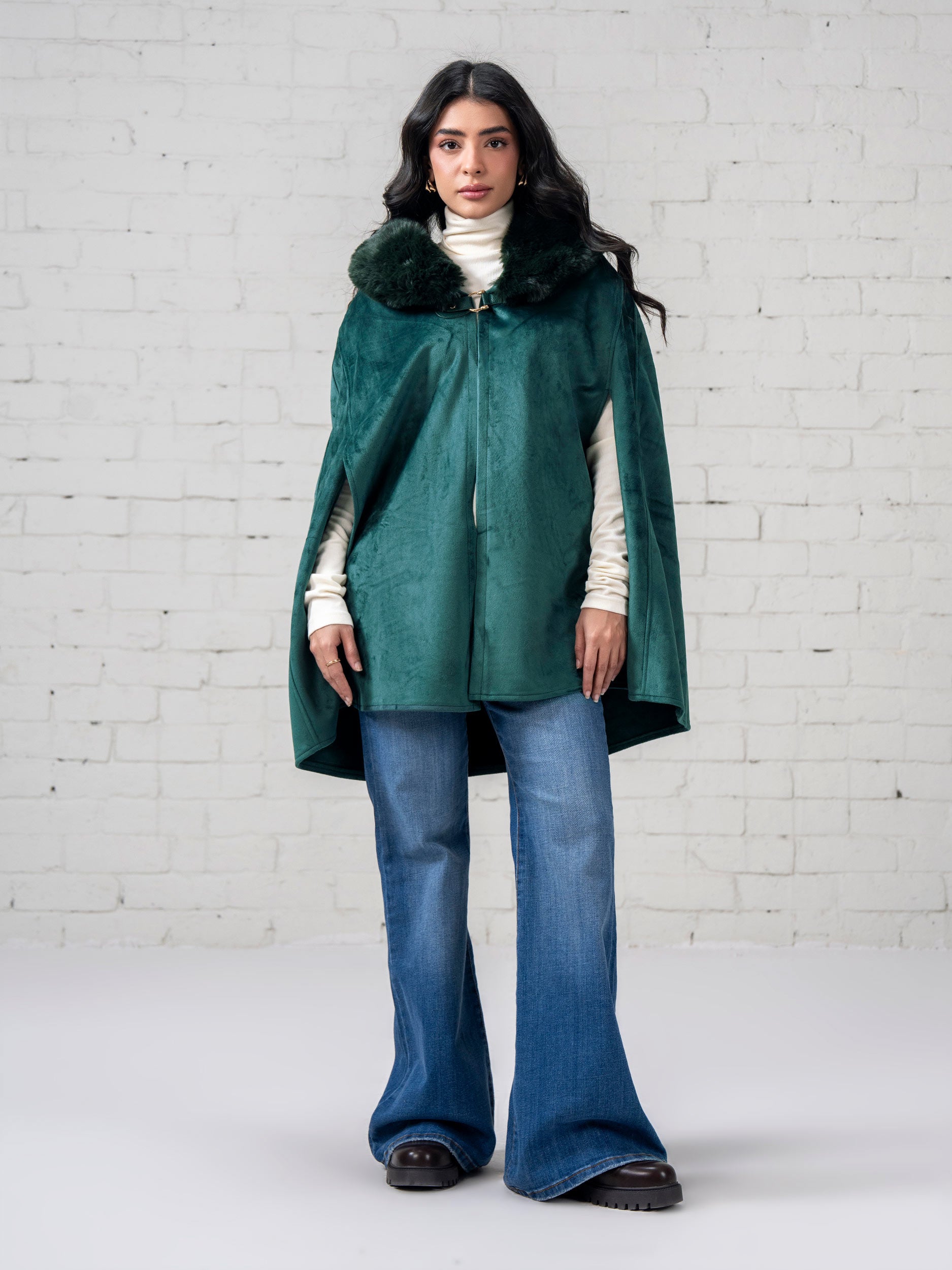 - Fur-trimmed collar cape with slit sleeves and a top button closure
