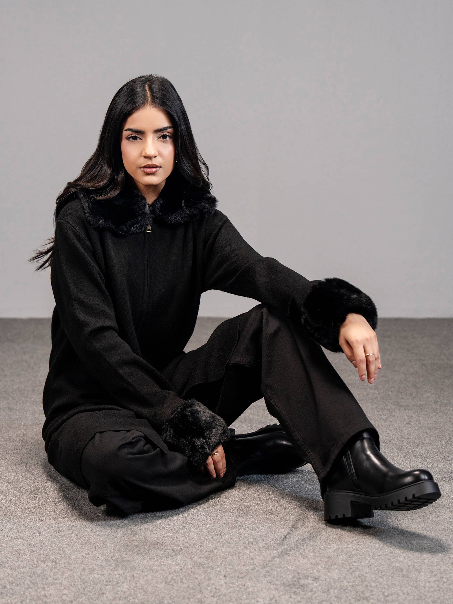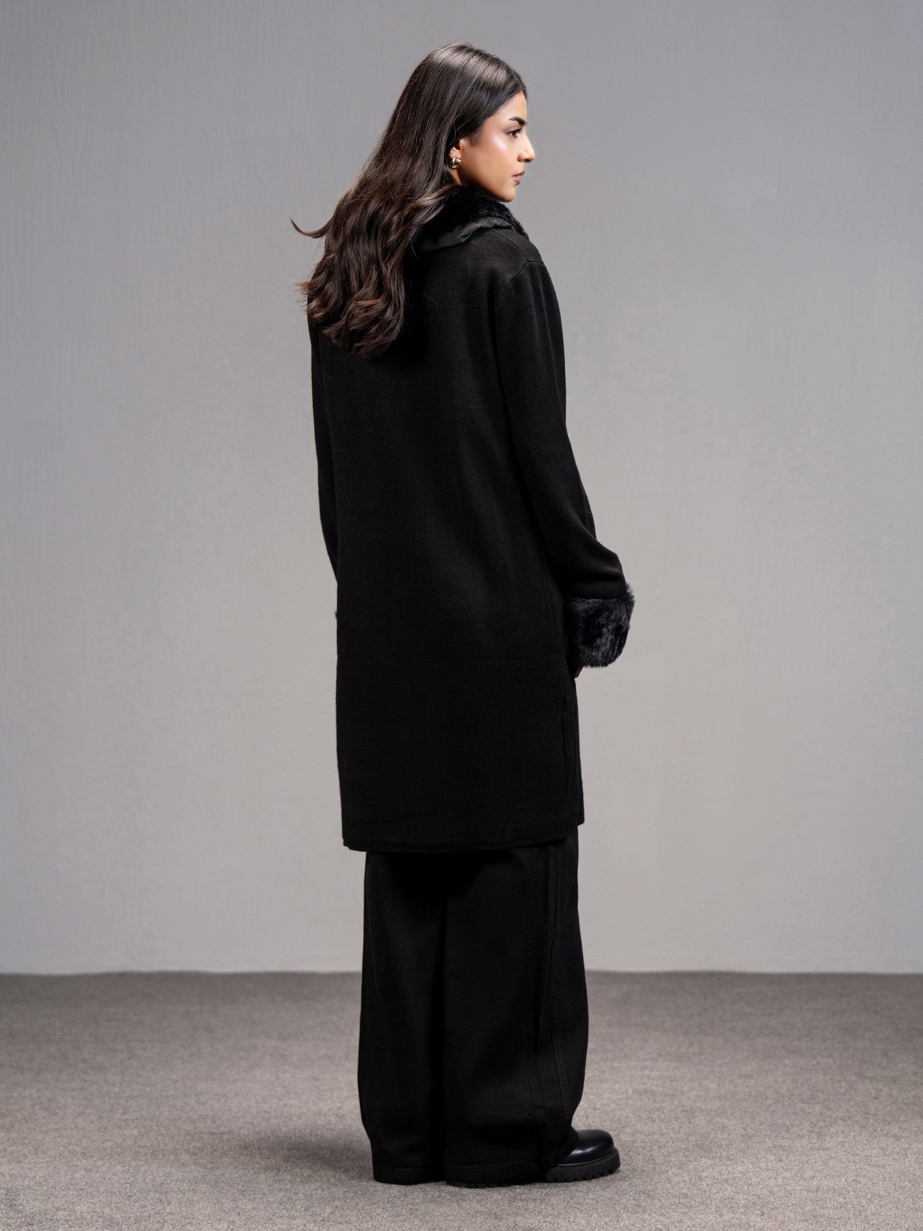 - Long cardigan with a fur-trimmed collar and sleeve hems