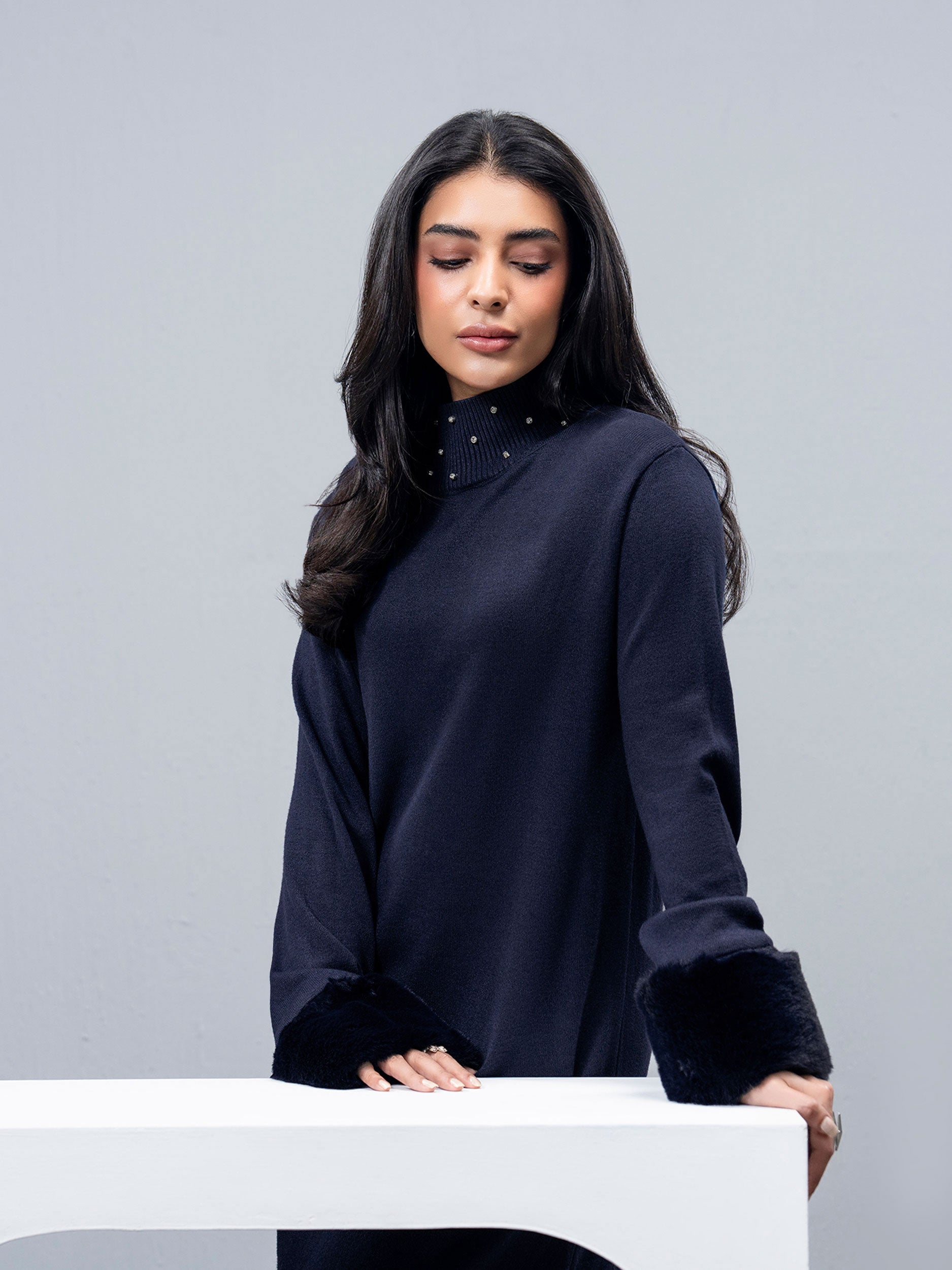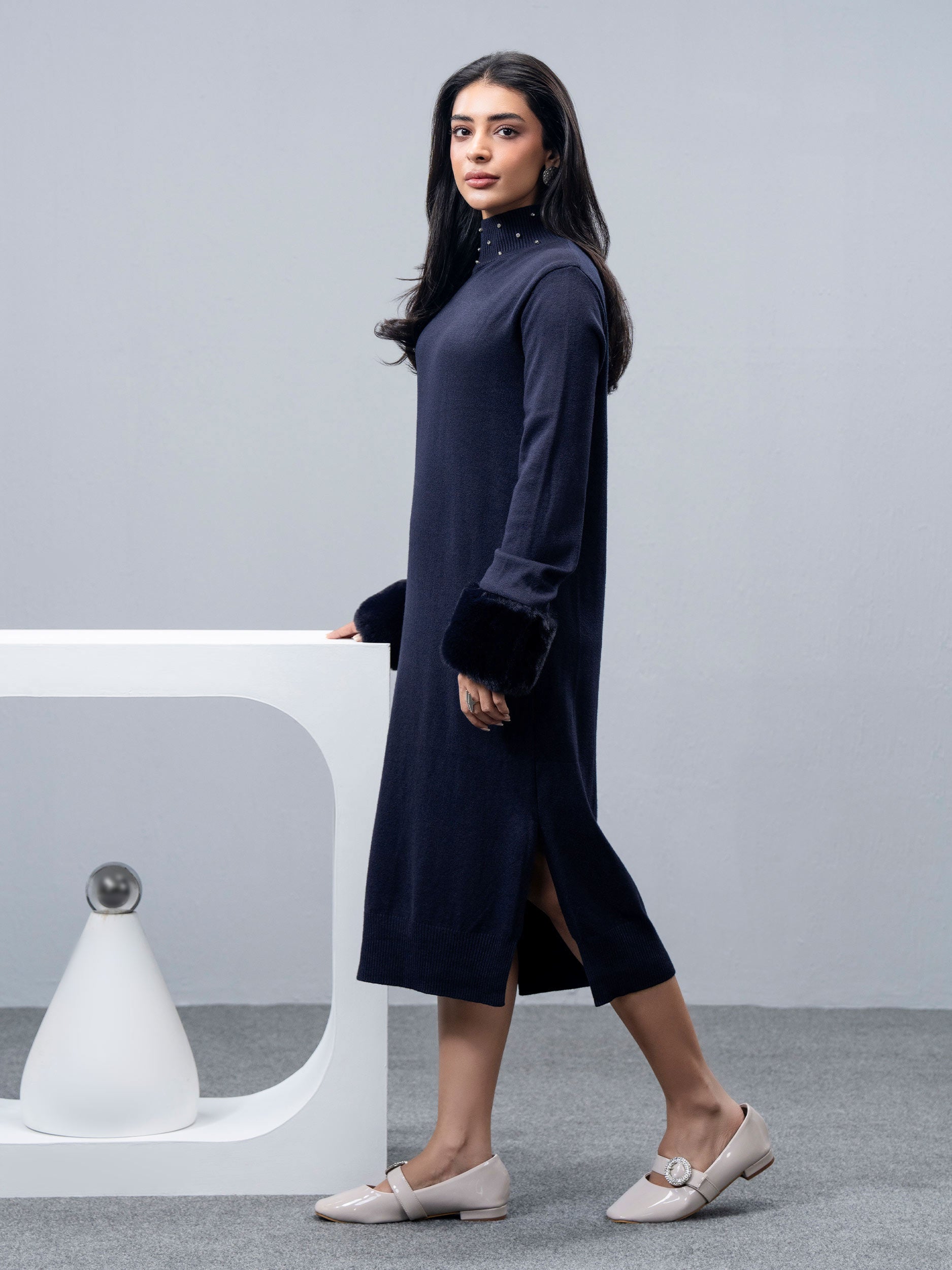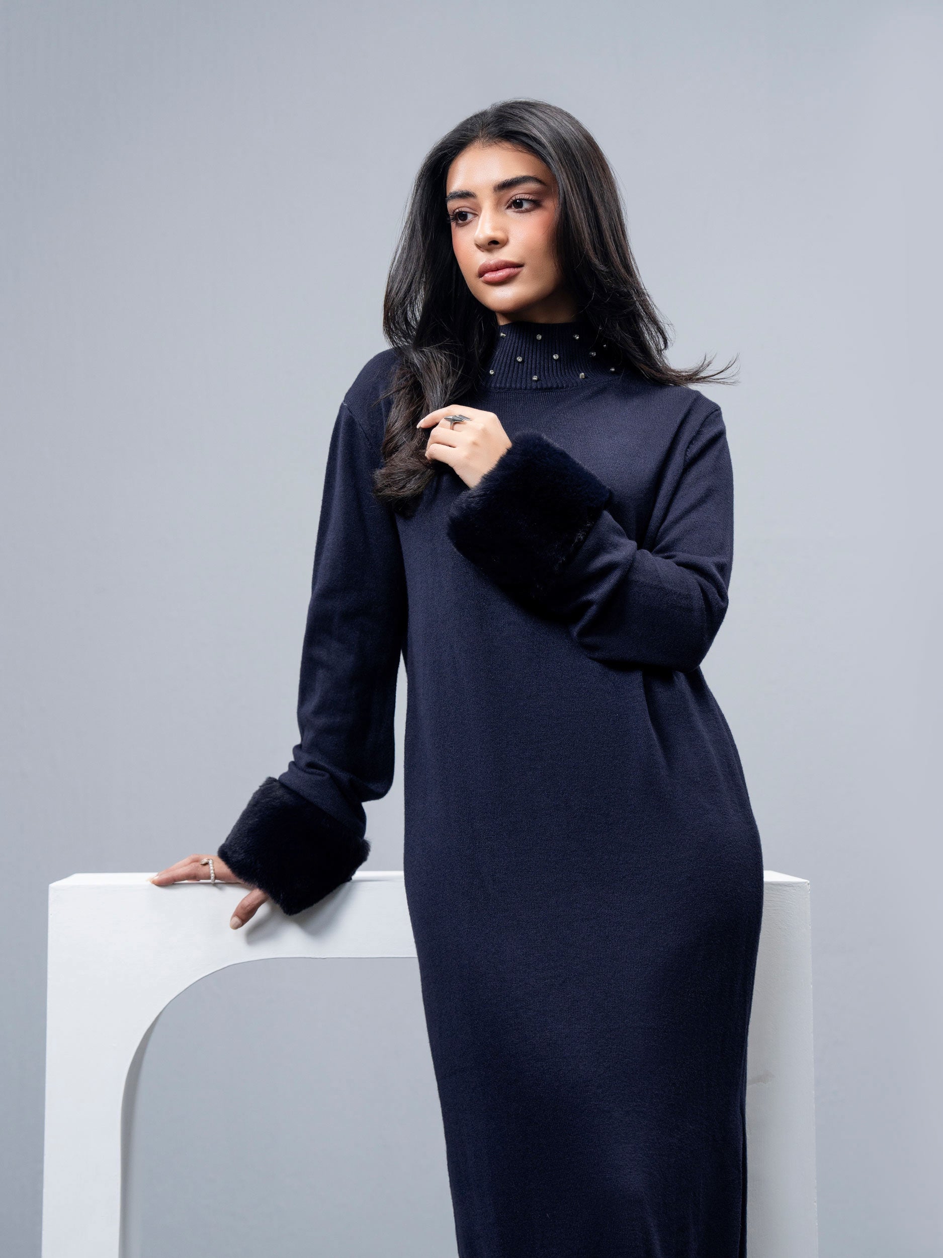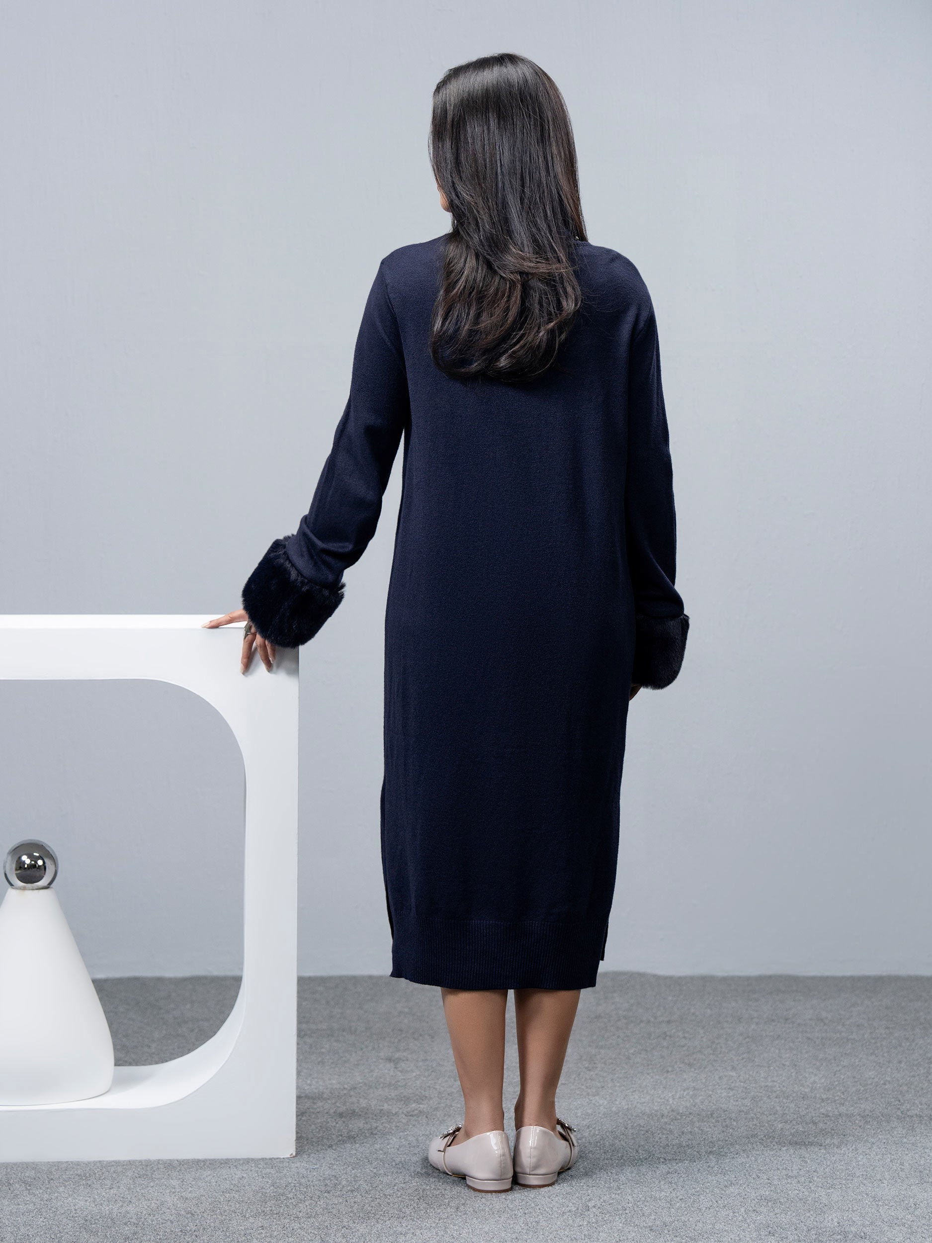 - Knitted dress with fur neckline