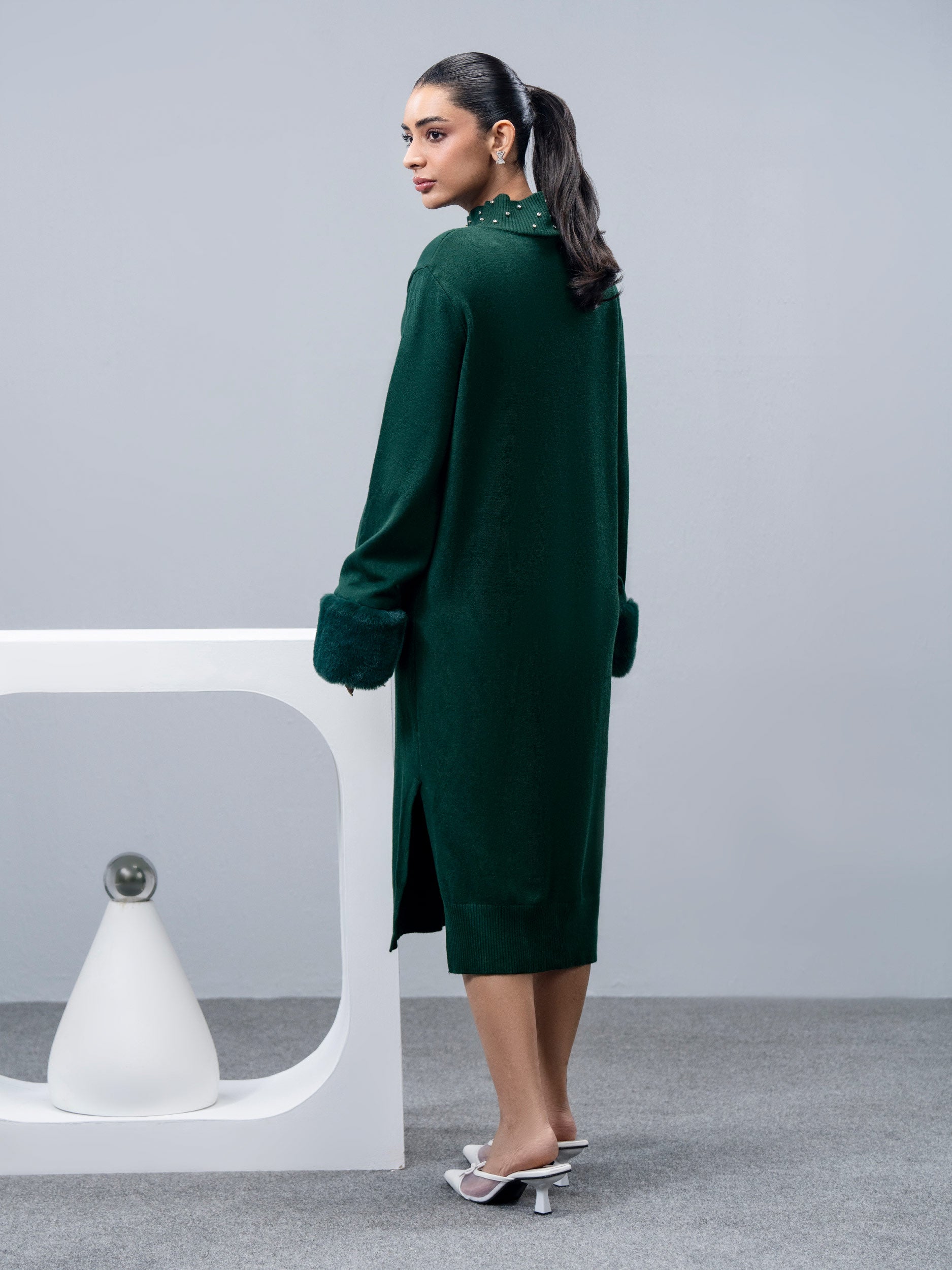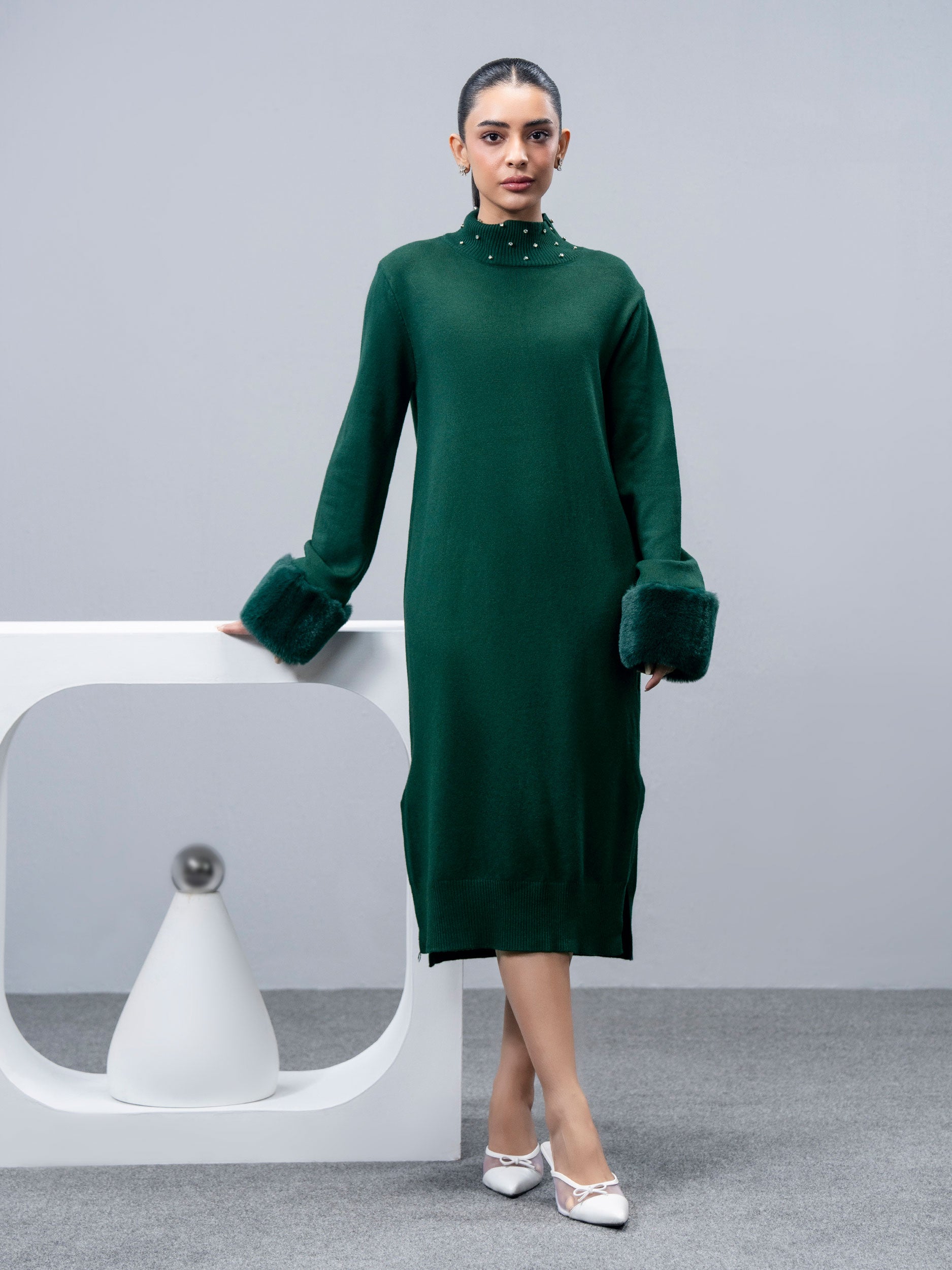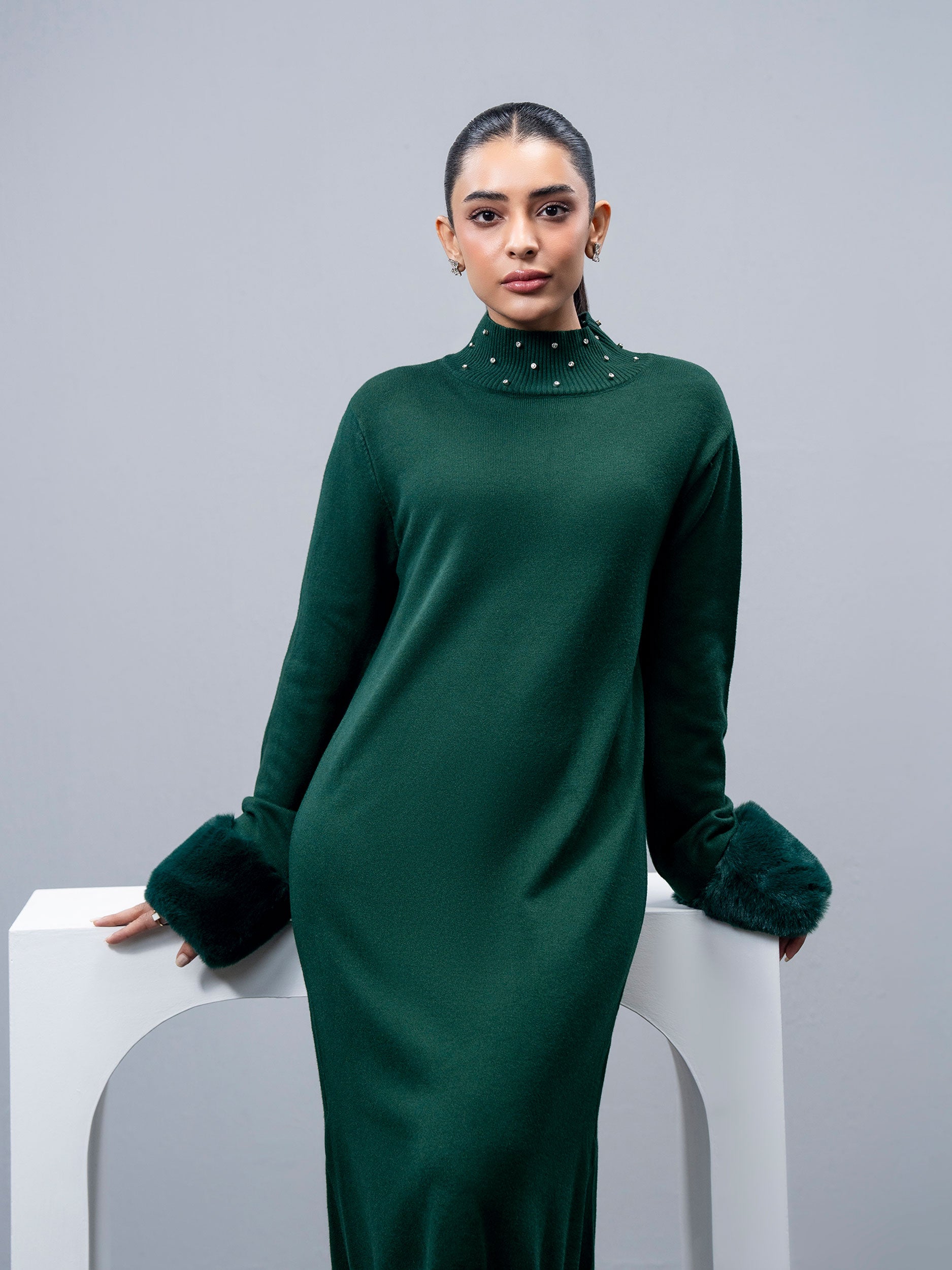 - Drop-shoulder embellished round-neck knitted dress with fur-trimmed