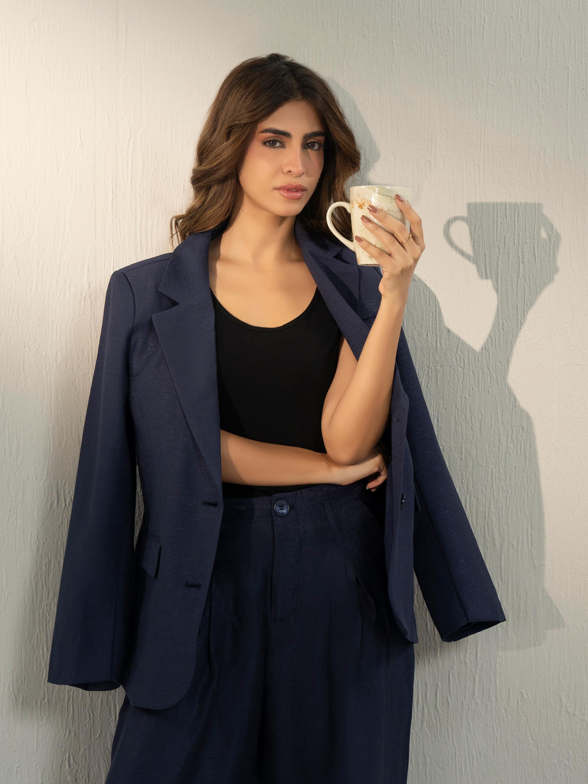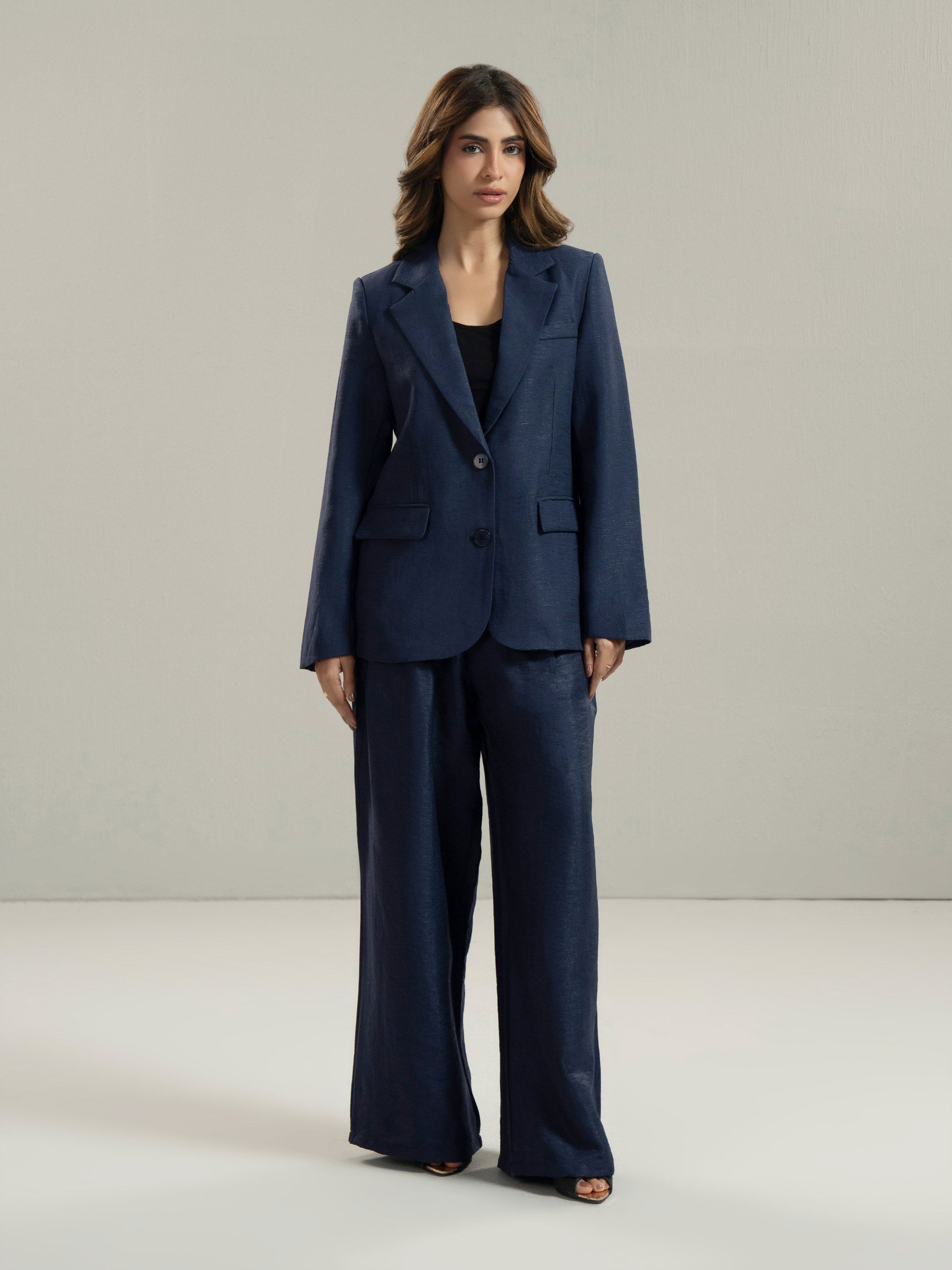 - Metallic sheen blazer with two-button closure and front pockets