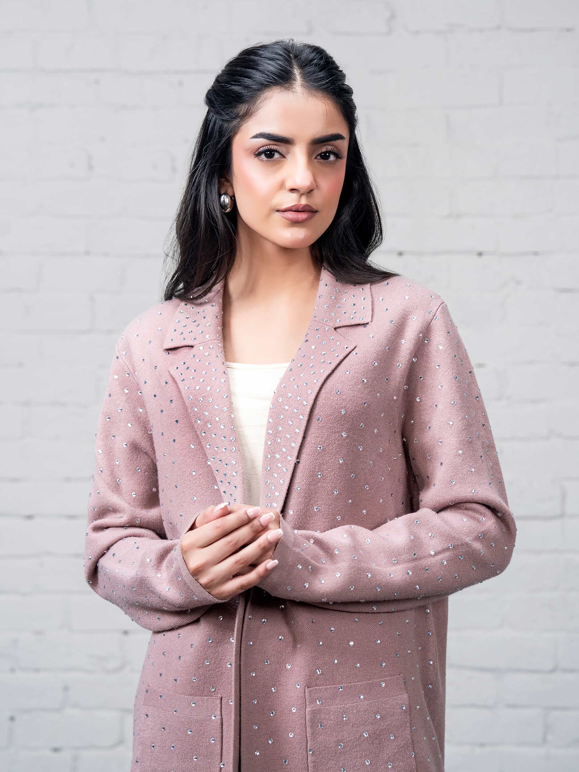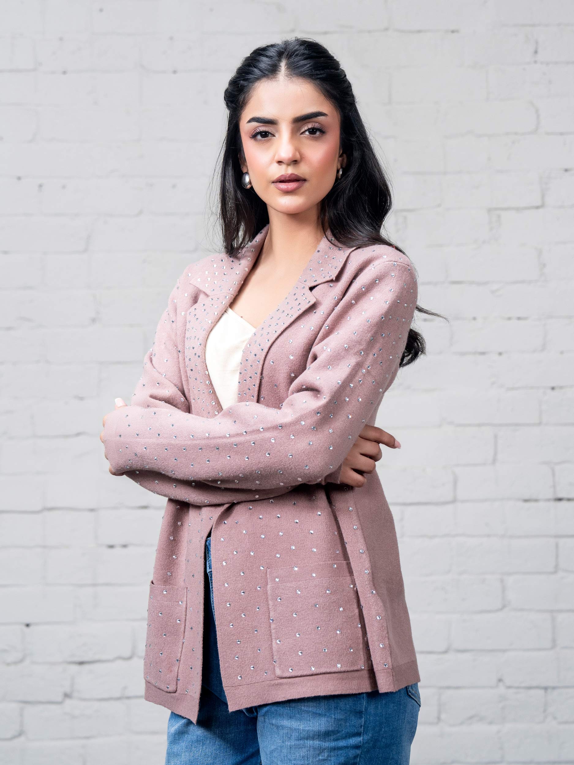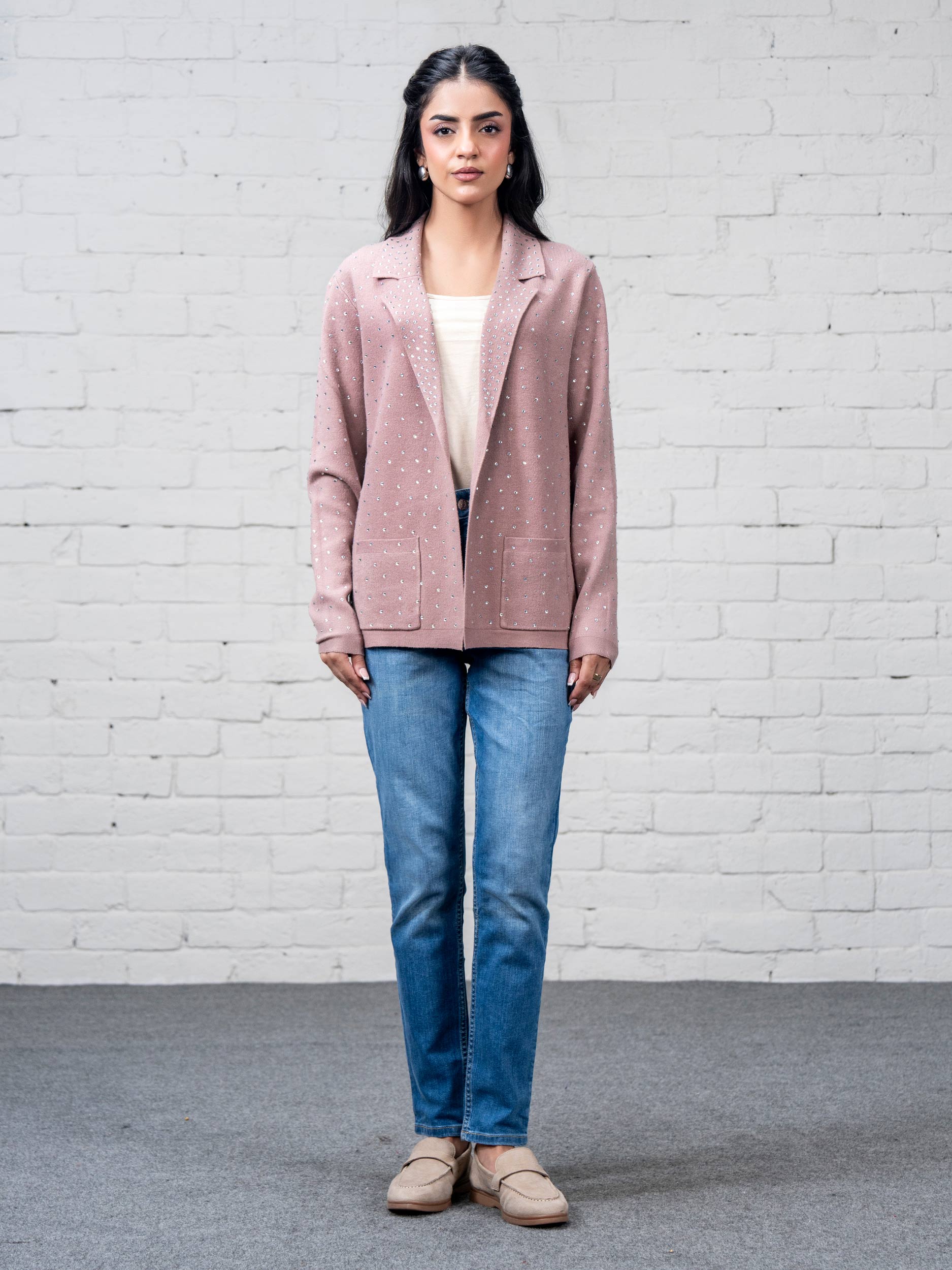 - Soft knitted blazer with rhinestone detailing and front pockets