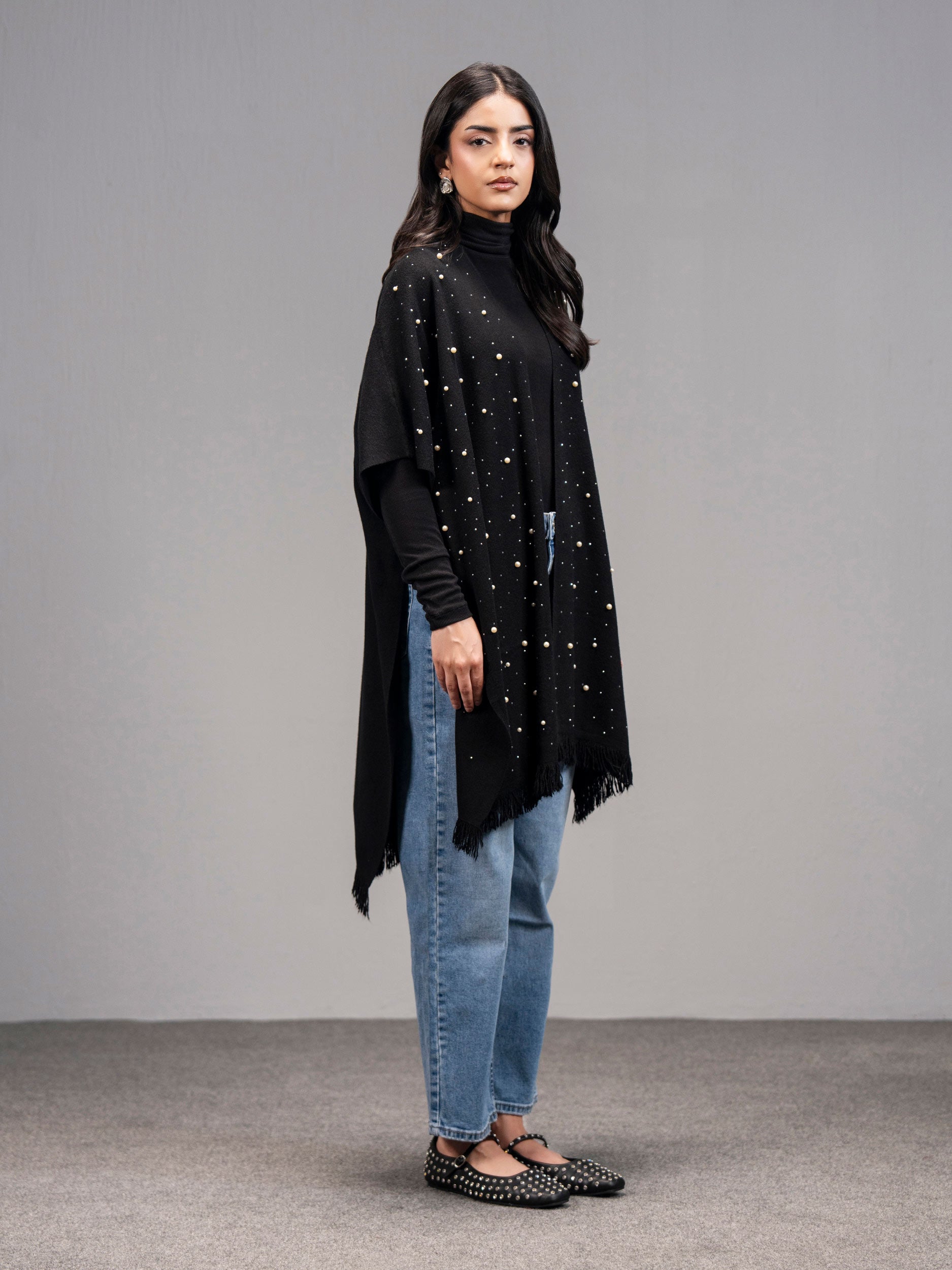 - Stone and pearl embellished cape with open sleeves and side buttons
