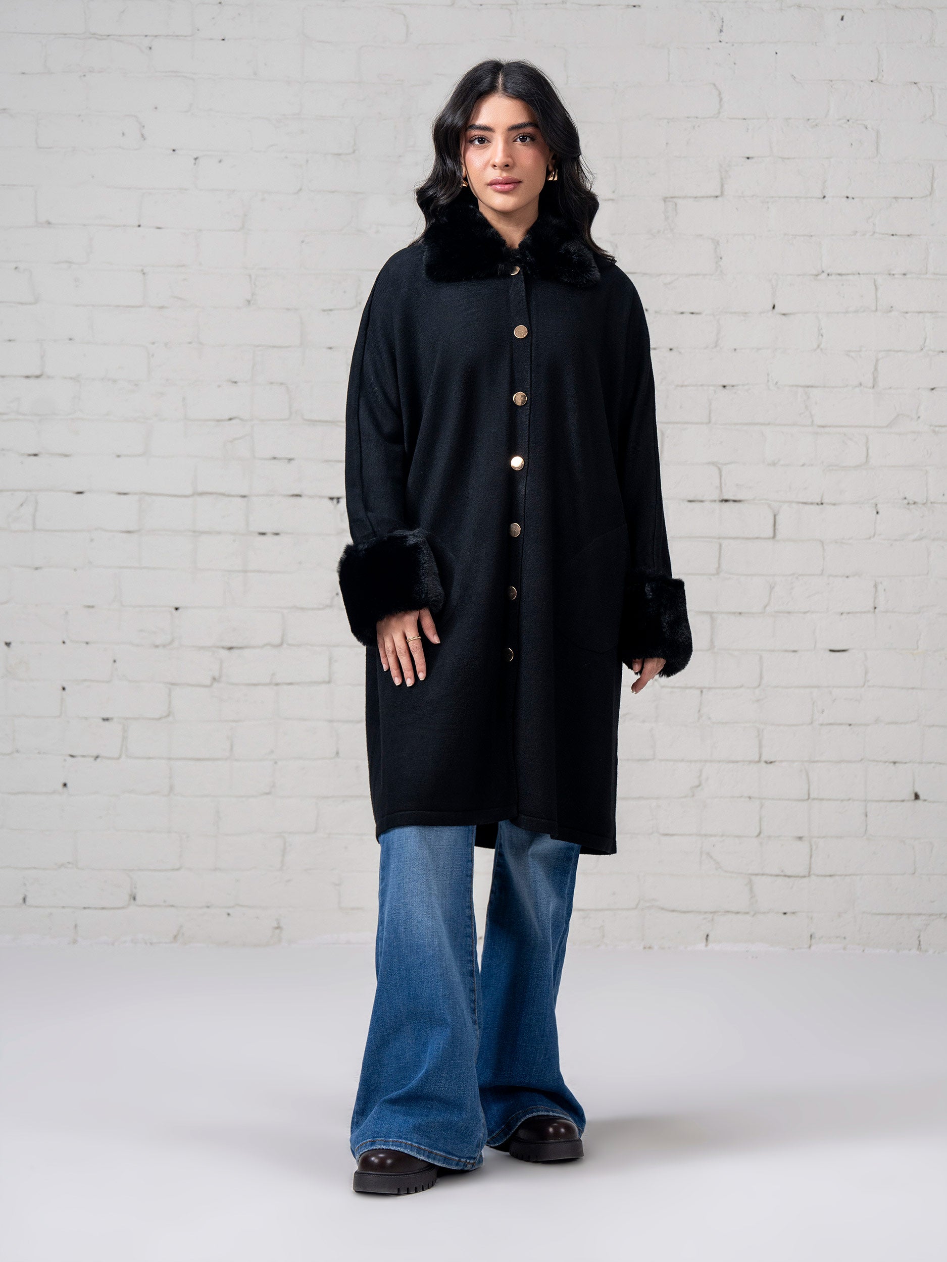 - Oversized button-down long coat with a soft faux-fur collar and cuffs