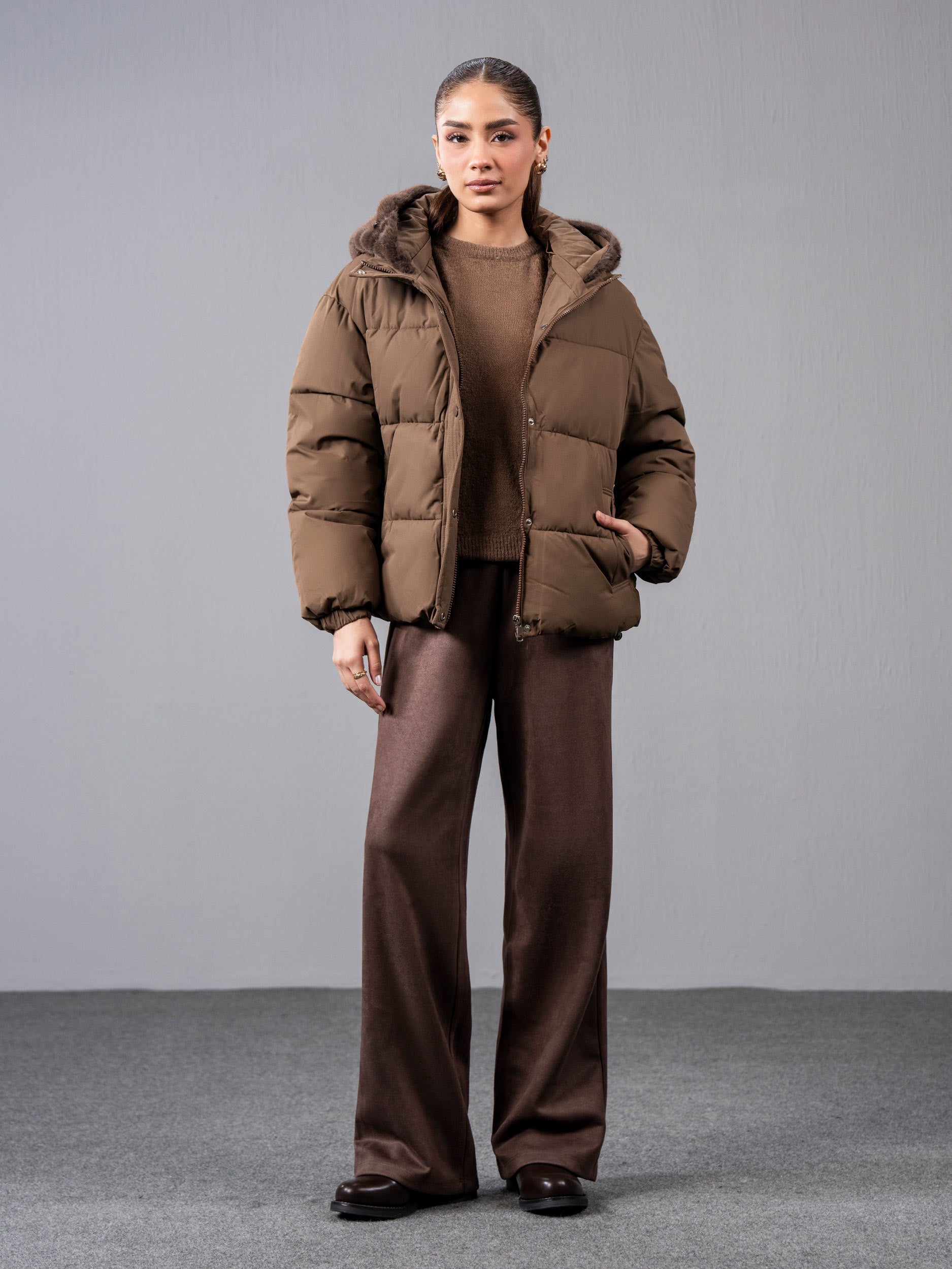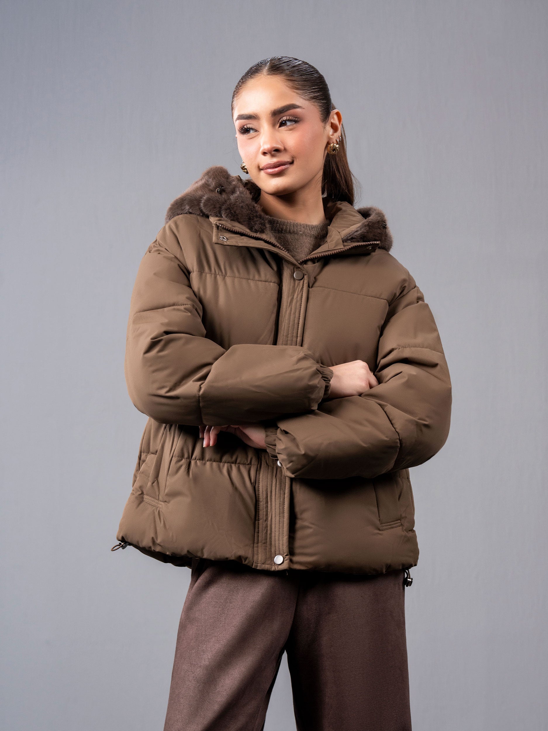 - Puffer jacket with zip and button closure, a detachable fur-trimmed hood, and side