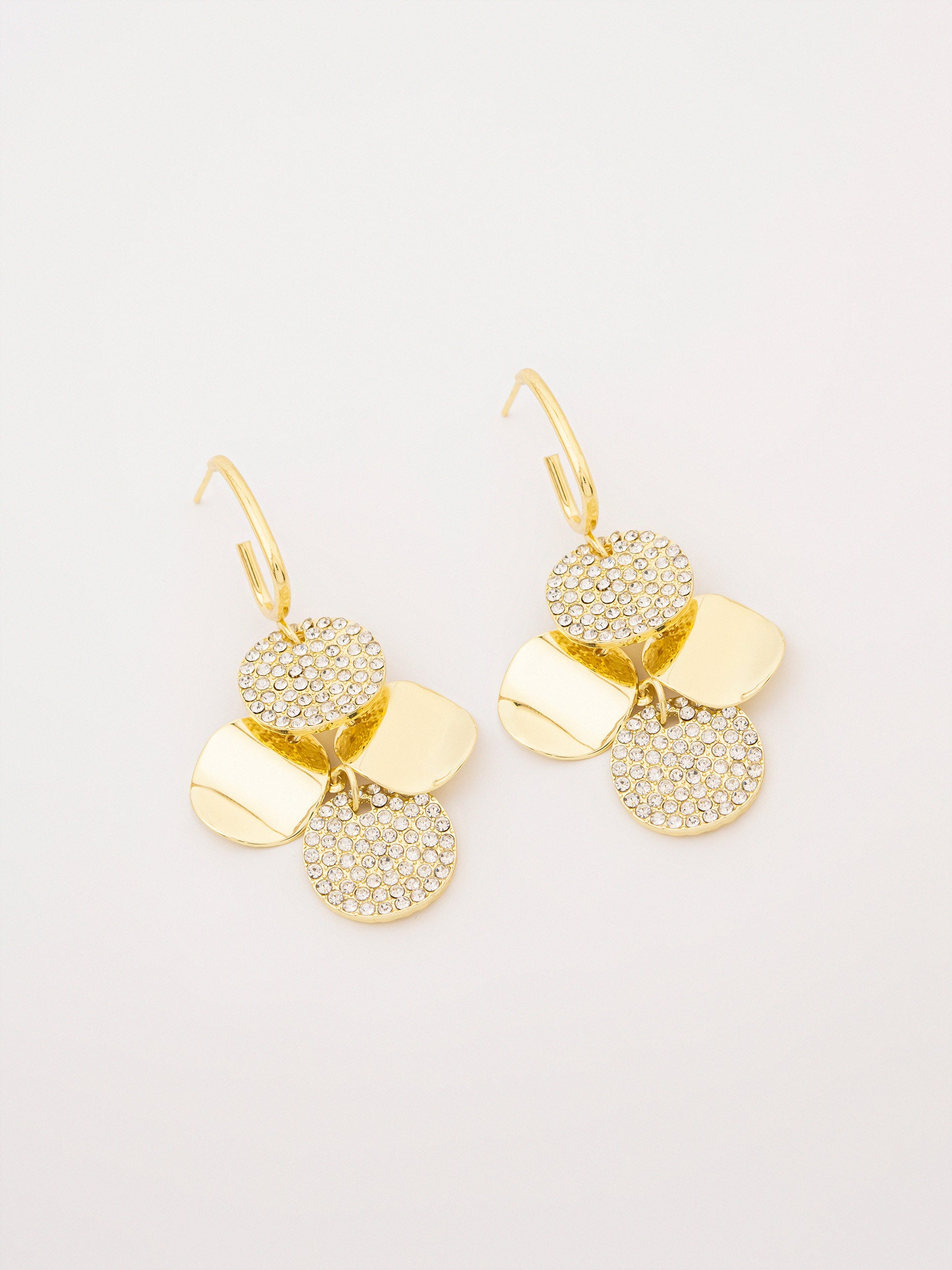 - Drop earrings with crystal discs and smooth metal detailing