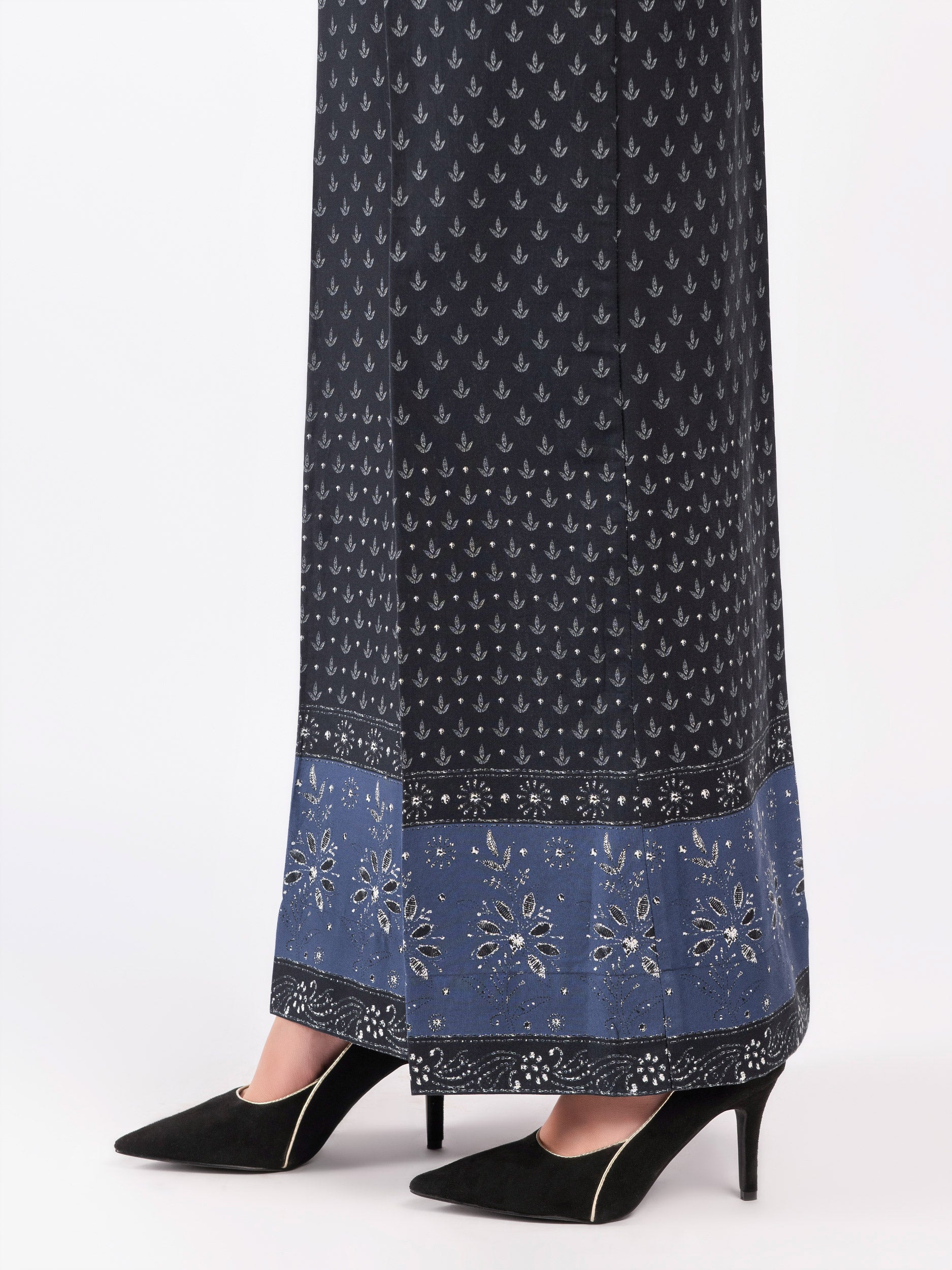 - Black and white floral pattern on light blue shade hem