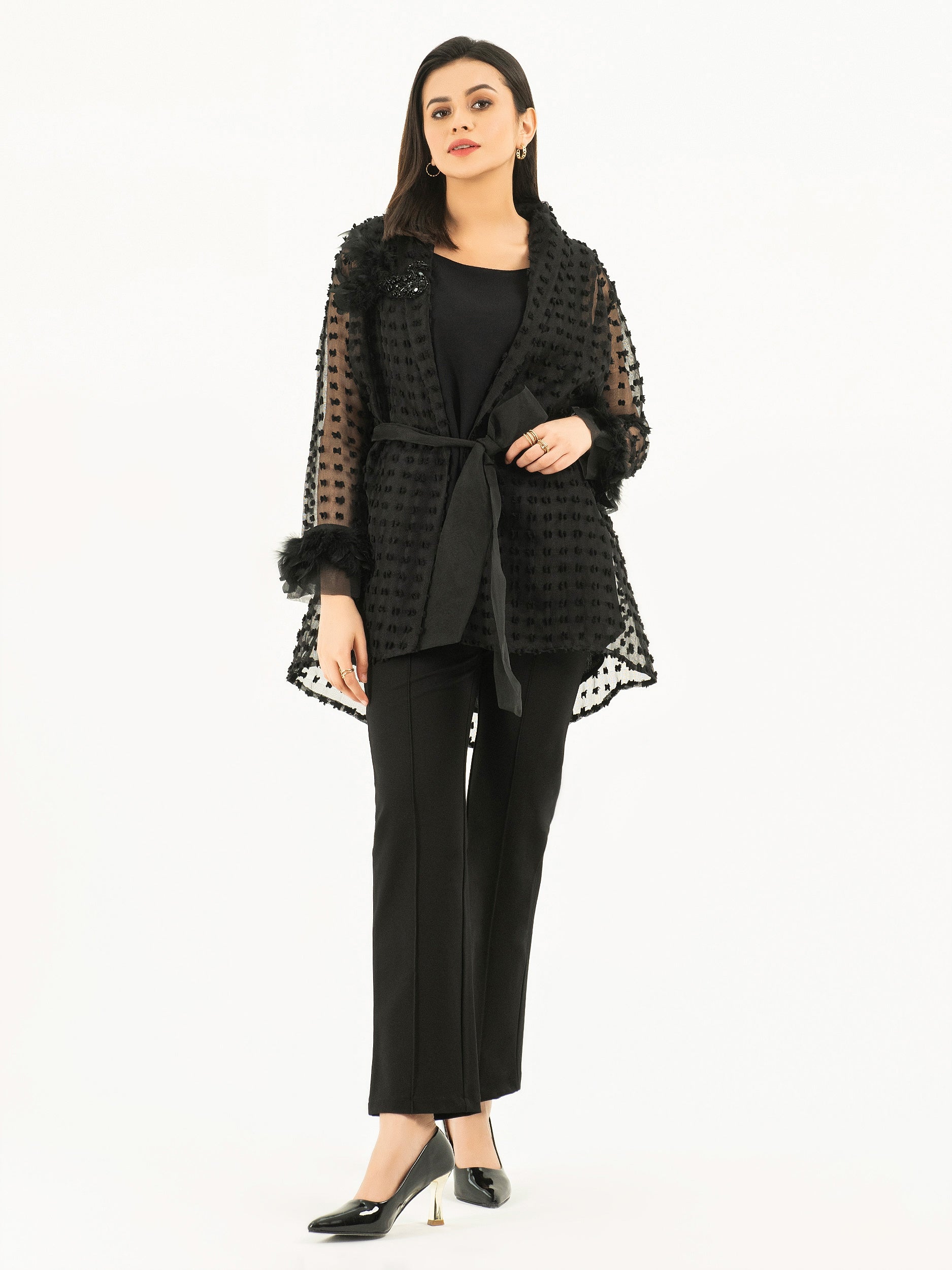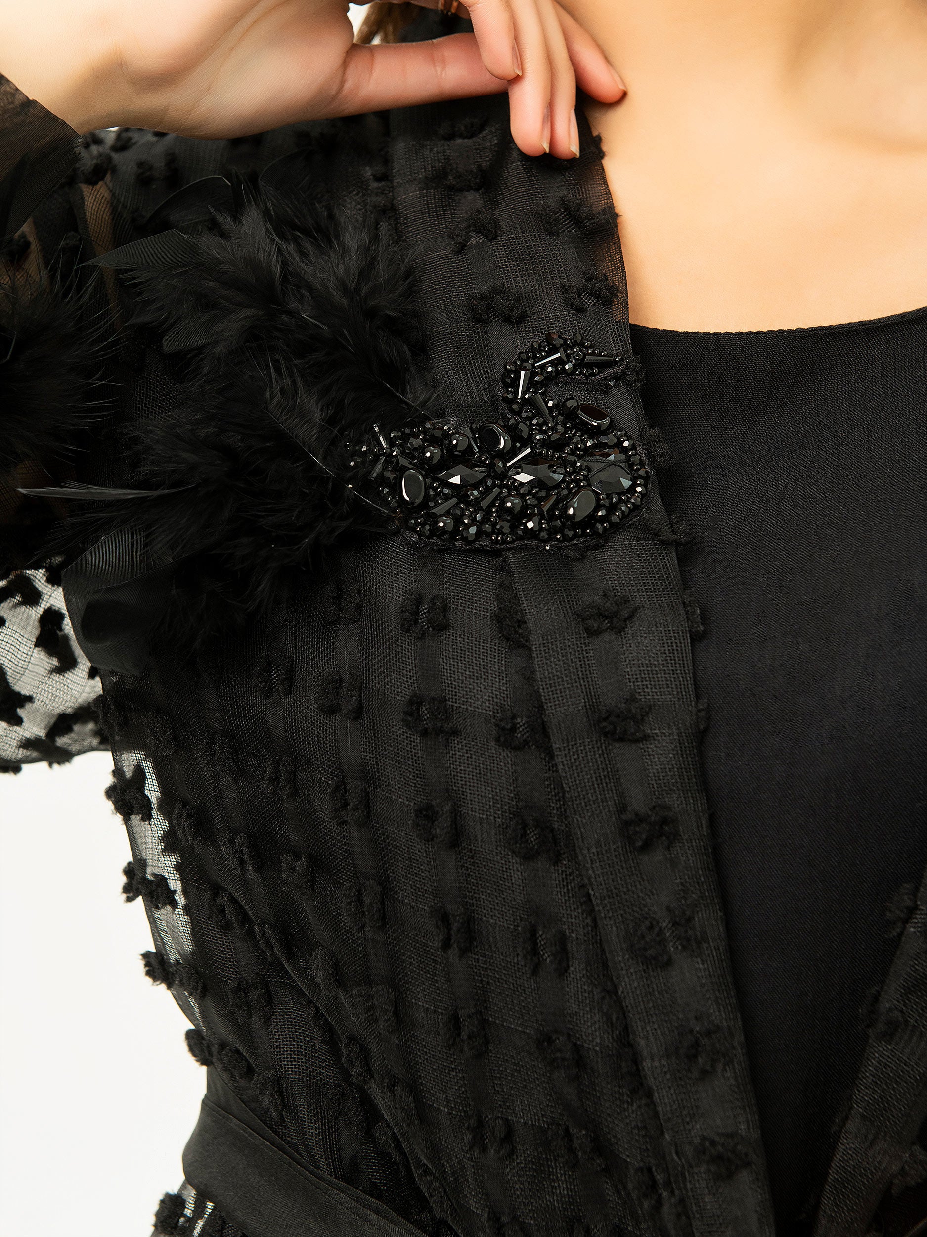 - Full sleeves with faux fur and feather detailing on the cuffs