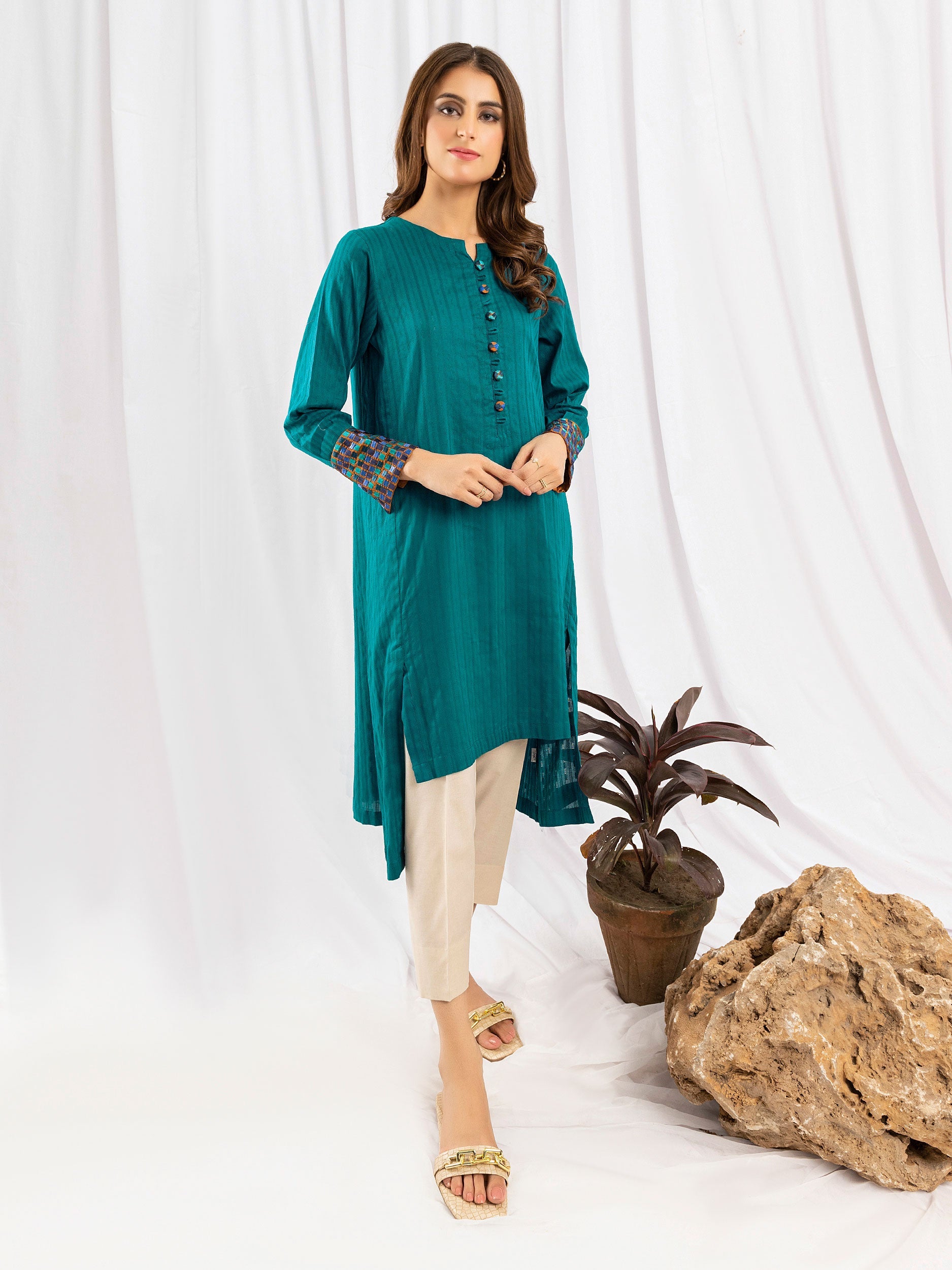 - Hi-Low shirt with button detailing on placket and embroidered cuffs.