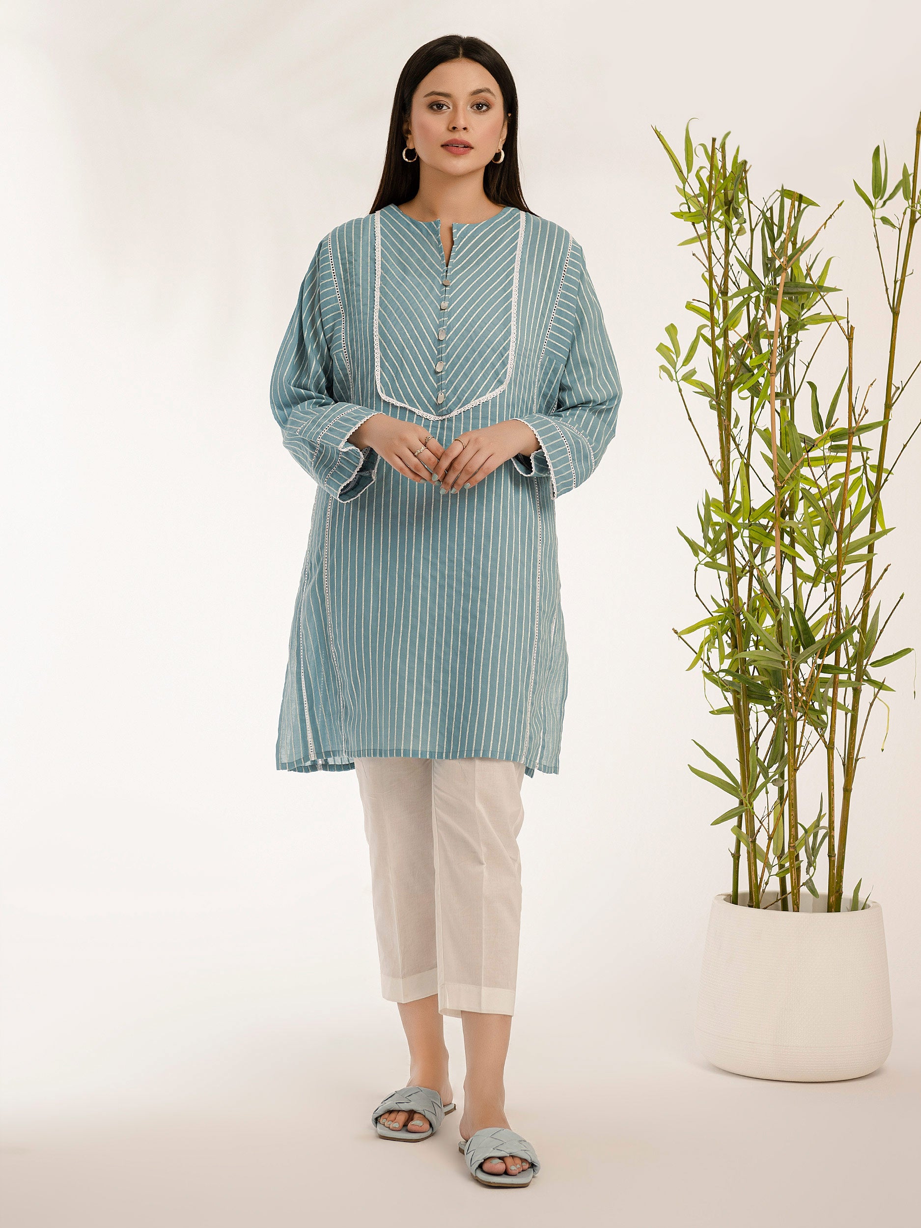 - Dyed A-line Kurti with over all lace and button detailing on the placket