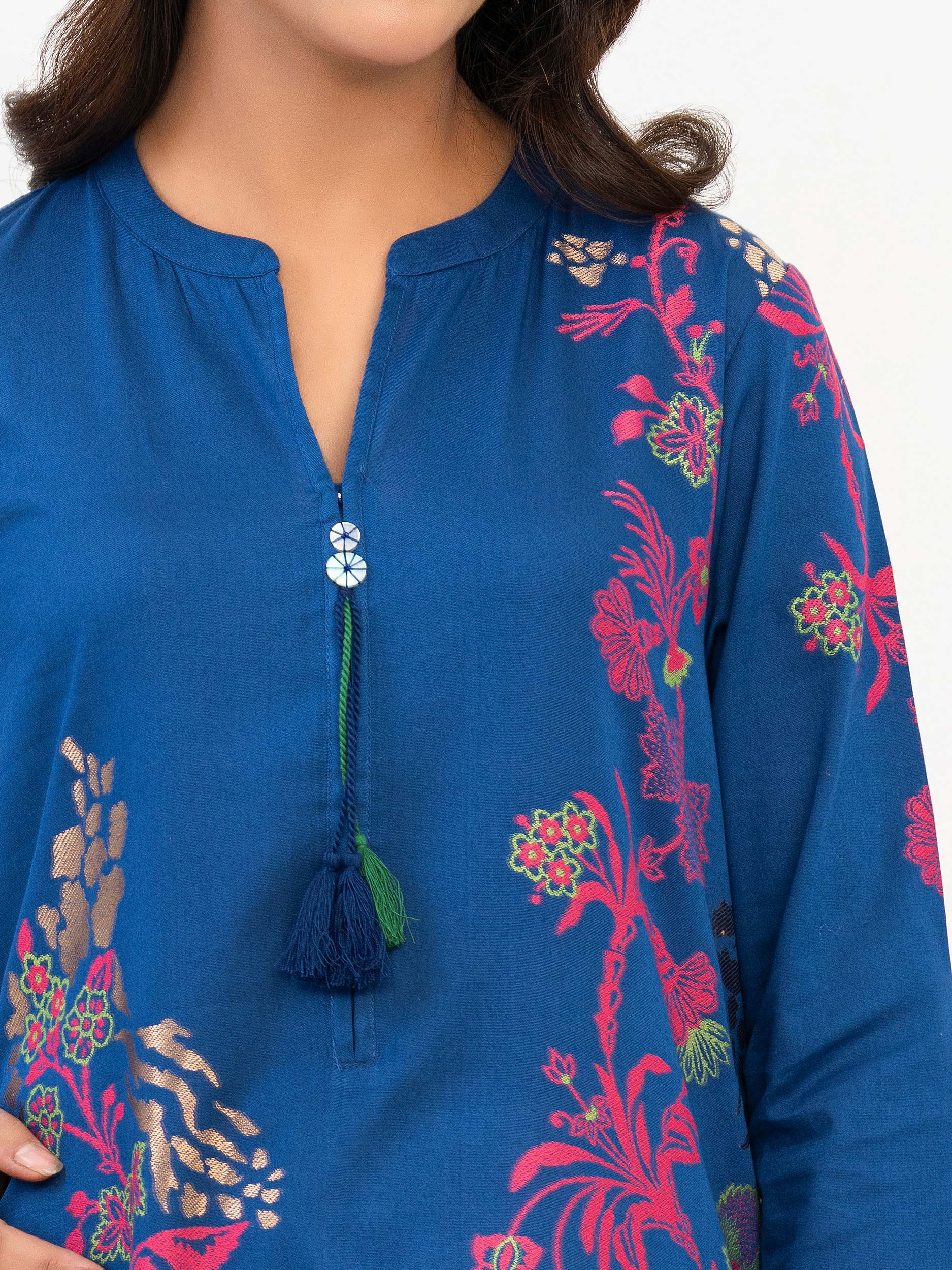 - Dyed jacquard shirt with dori tassel at the neckline and sleeves with button closure