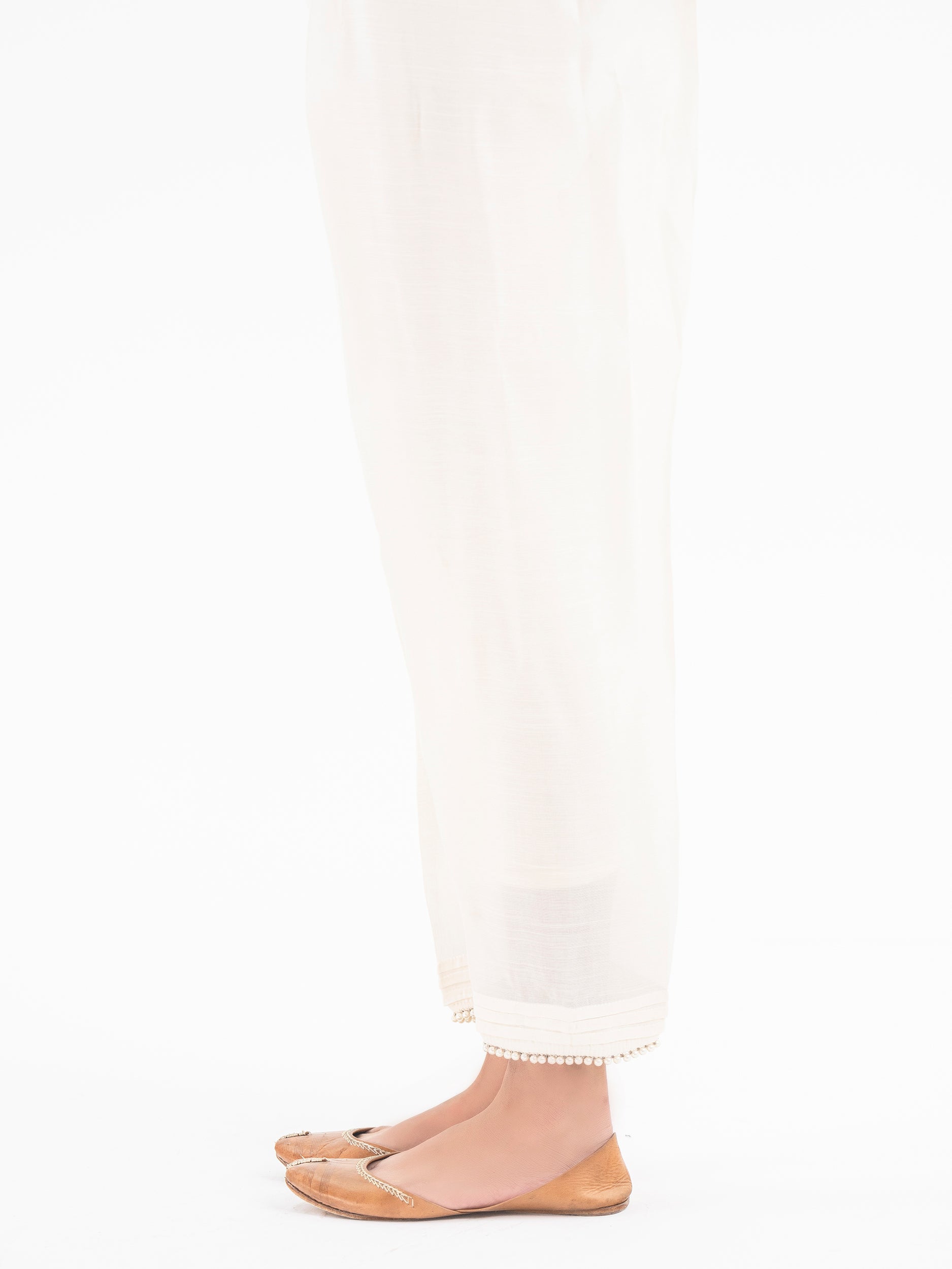 - Dyed narrow leg trouser with pleates and pearl lace on hemline