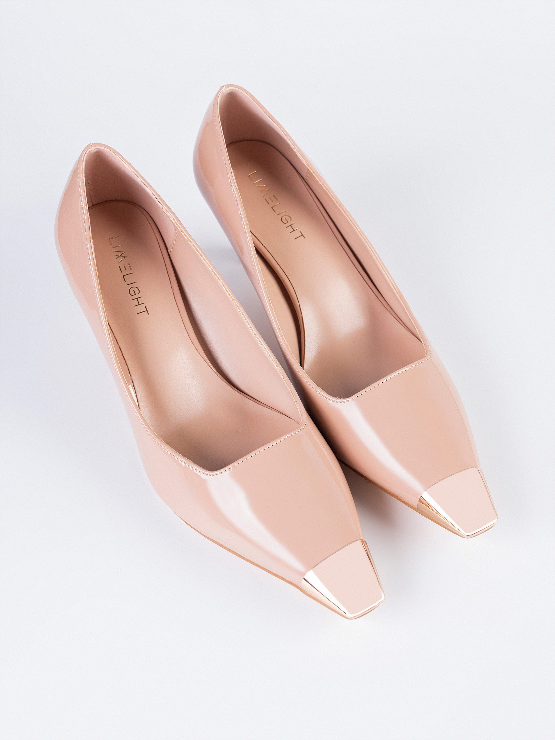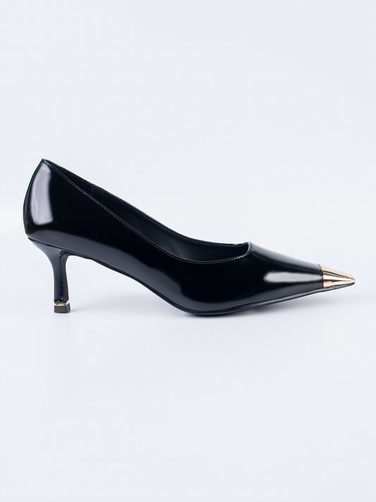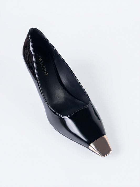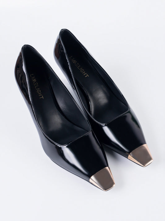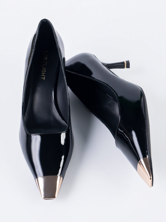 - Pointed-toe patent heels with a metallic toe cap and slim heel