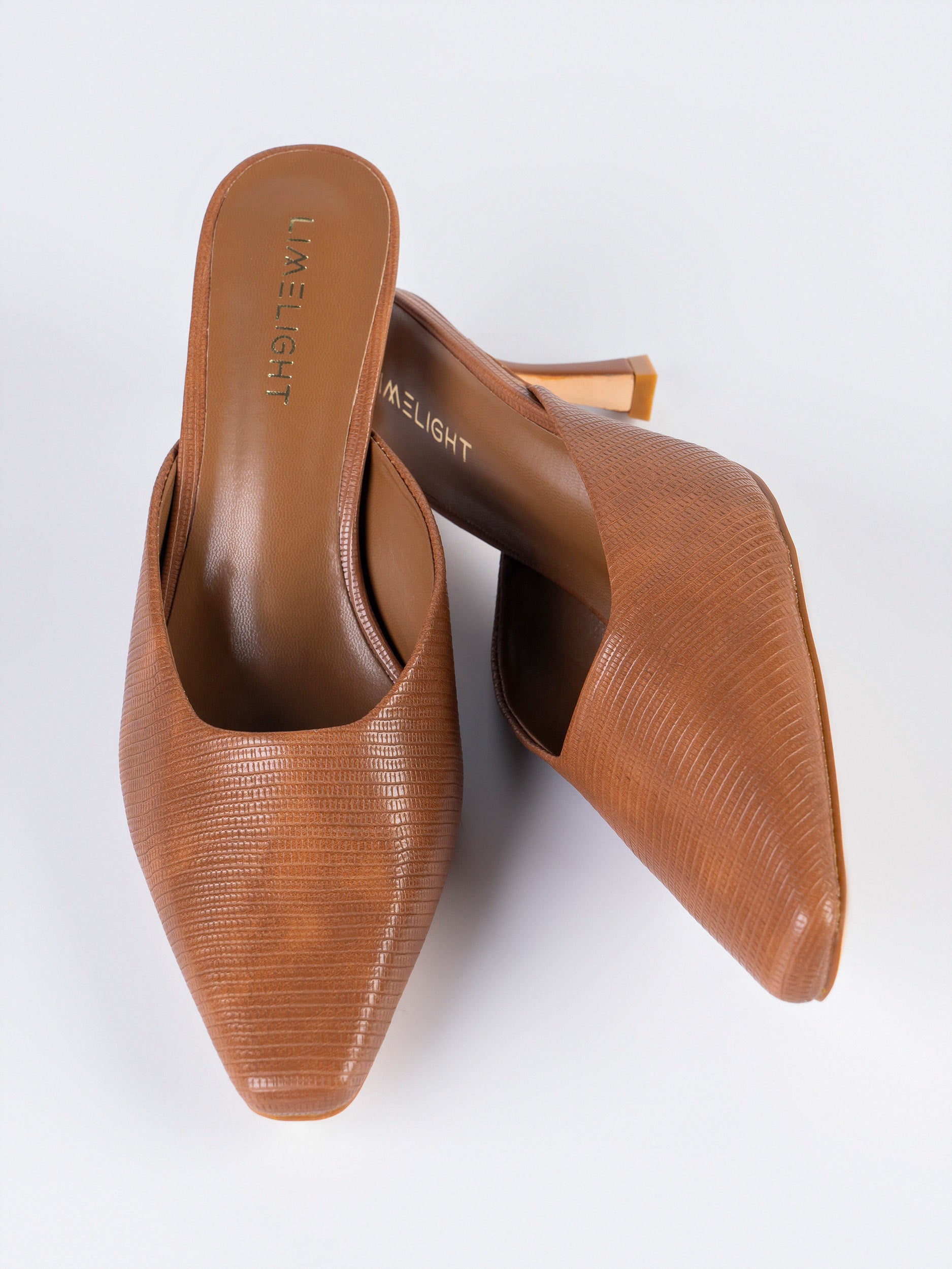 - Pointed-toe textured heels with a crocodile-embossed texture and kitten