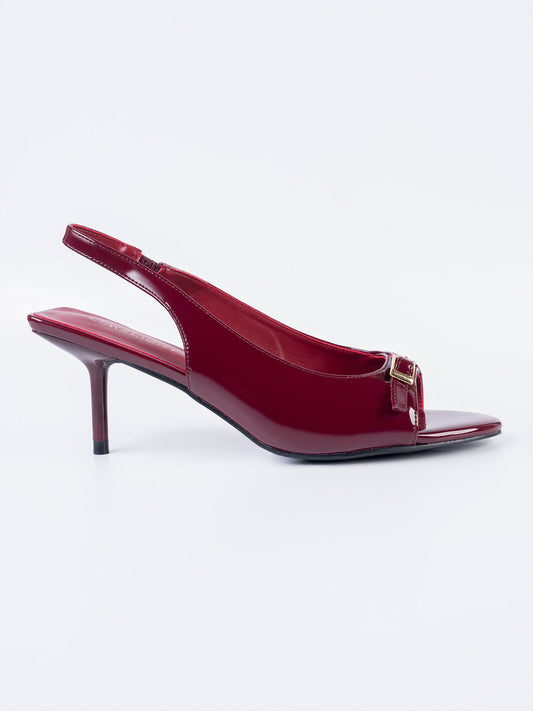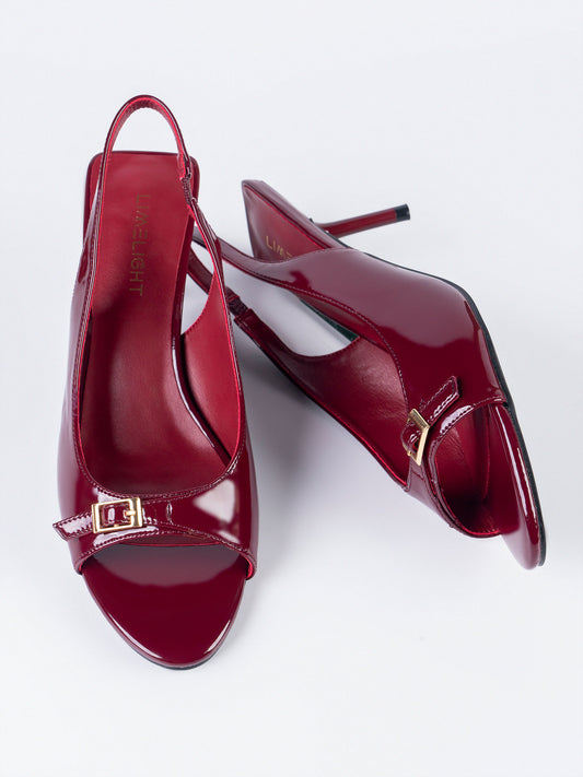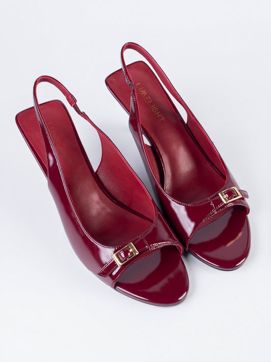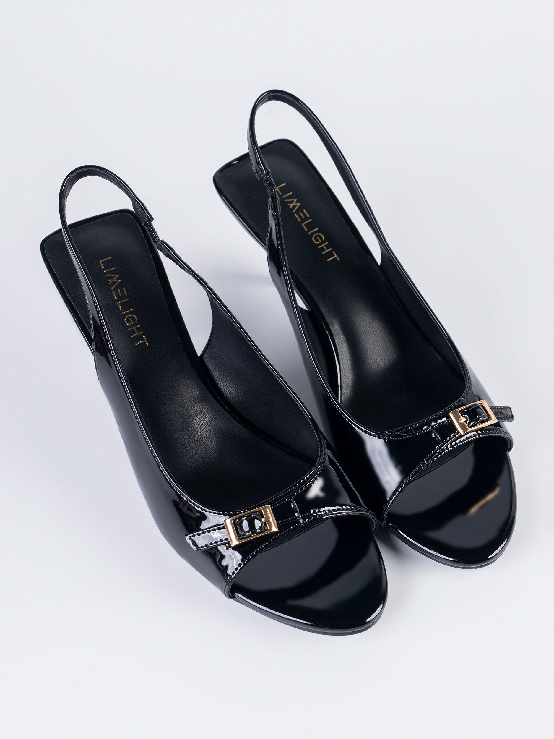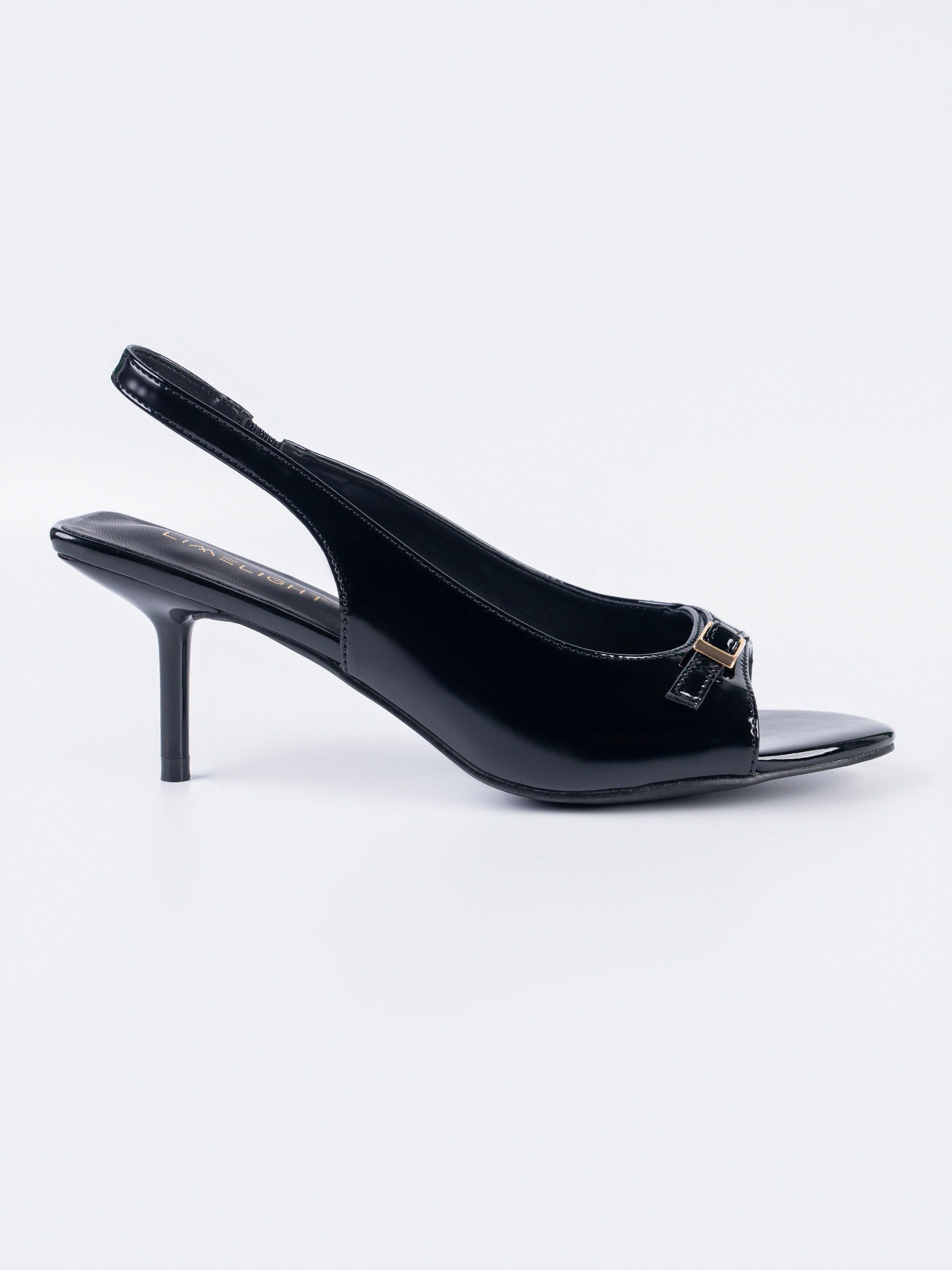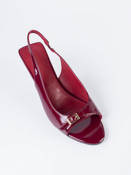 - Patent slingback heels with a small gold buckle detailed strap, and a