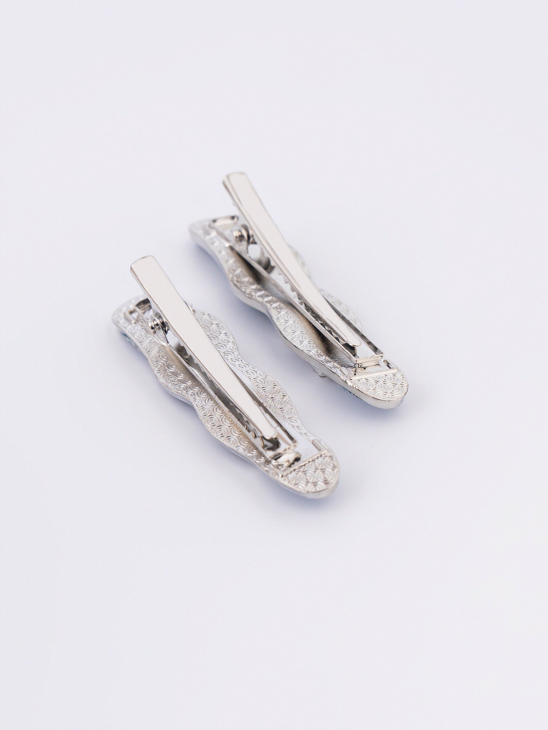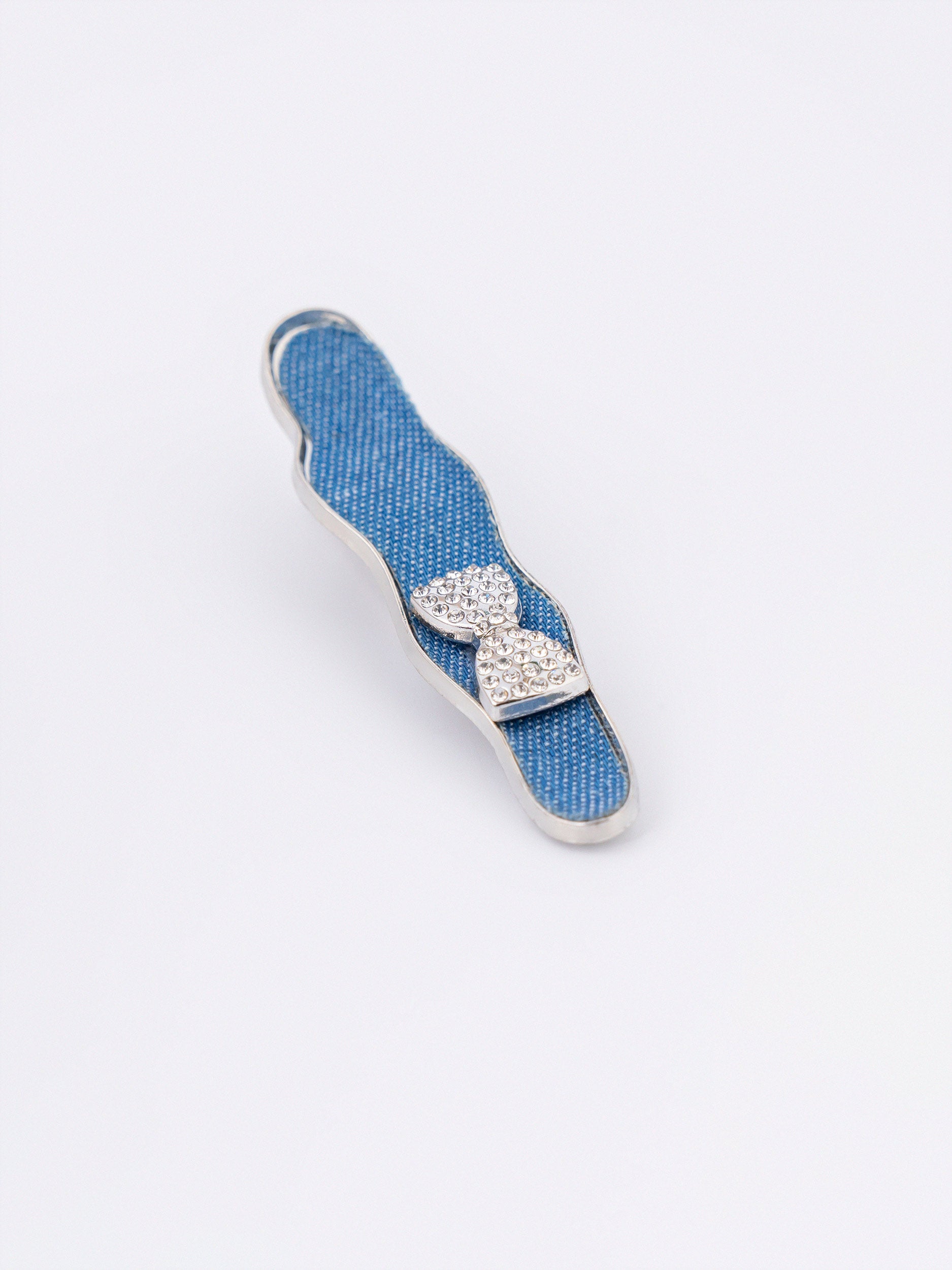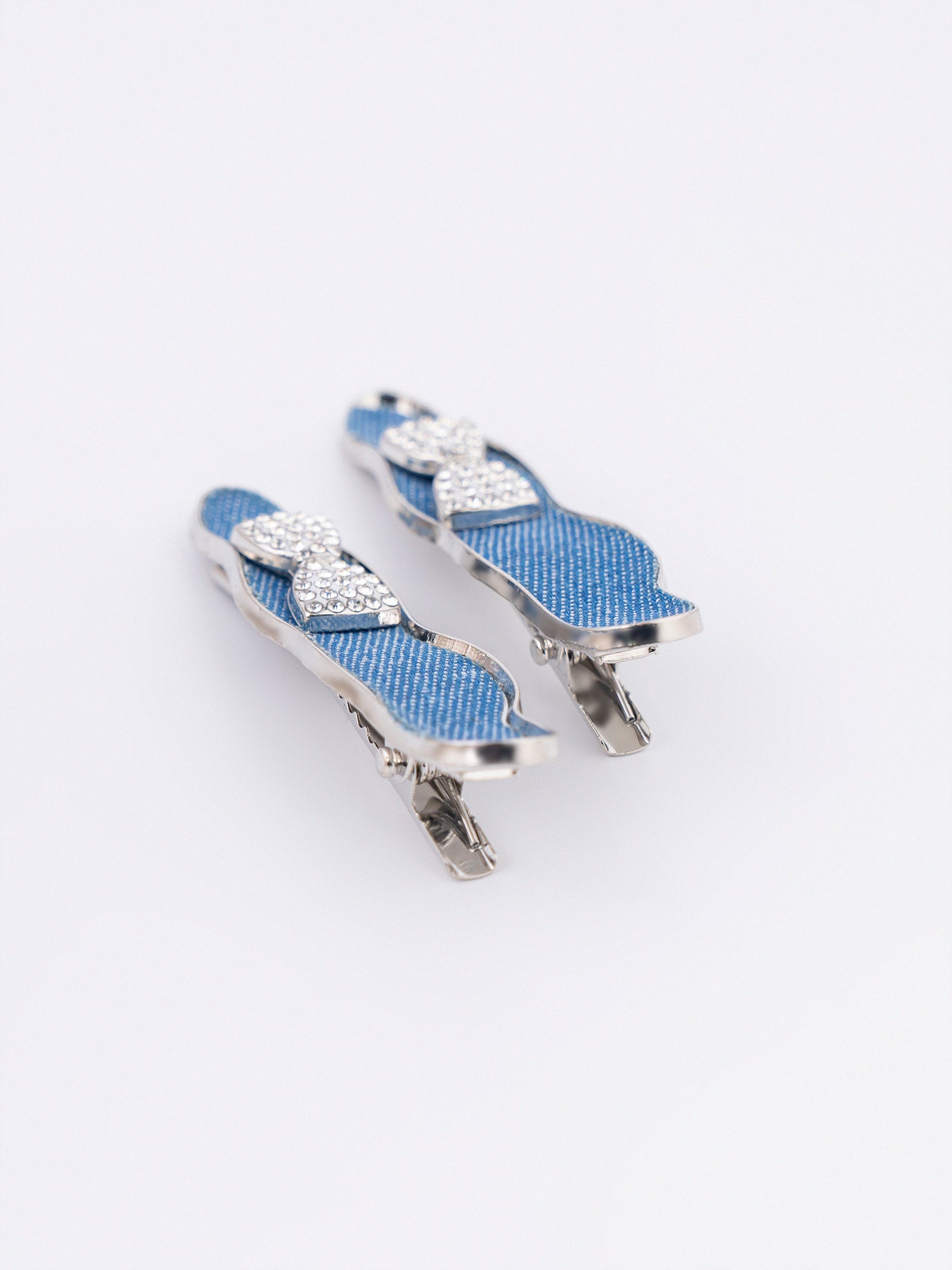 - Wavy snap hair clips with a denim-textured inlay and rhinestone bow detail